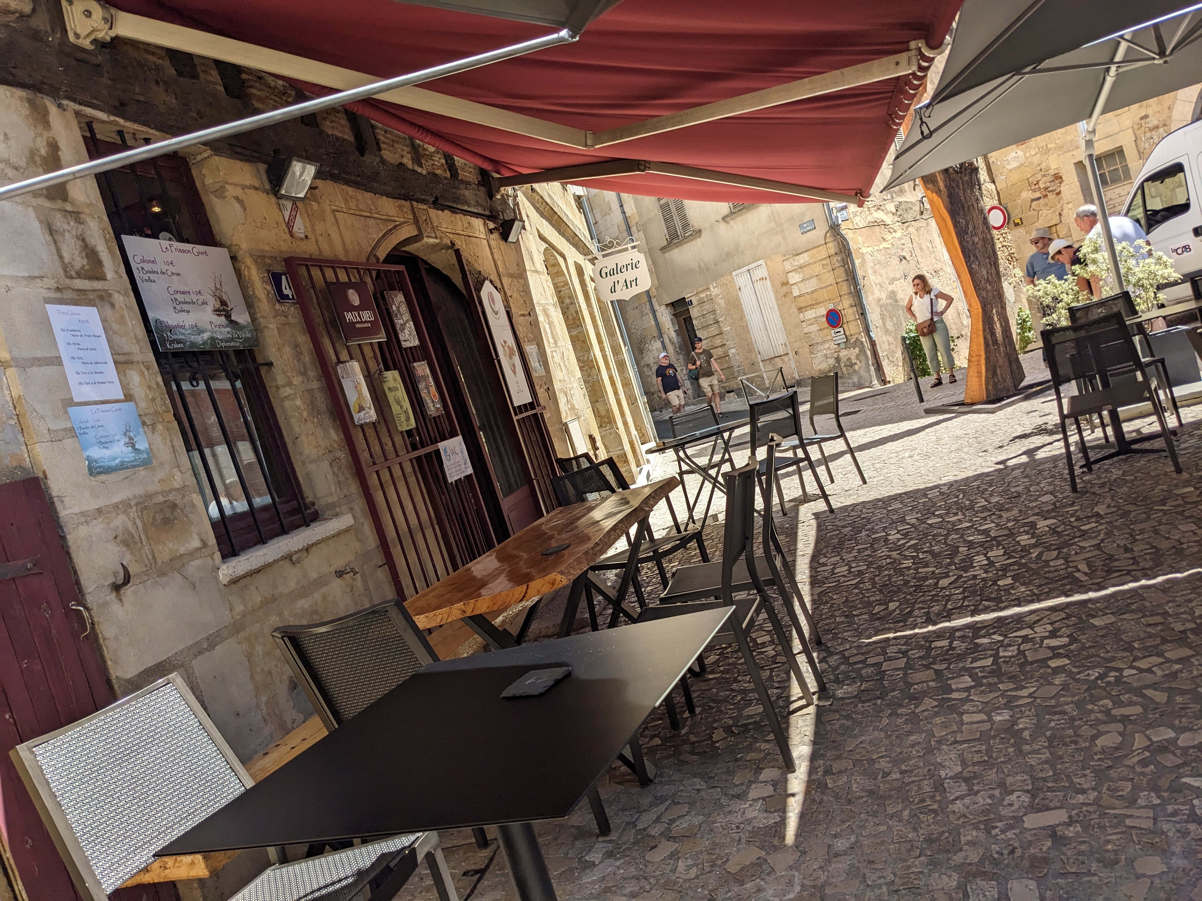 Tout d'abord, le serveur a oublié que l'on pouvait sourire aux clients, ces derniers appréciant cette petite marque de sympathie de la part d'un commerçant. Ensuite nous avons dû demander du beurre et des cornichons en complément de la planche que nous avions commandée. Toujours avec ce sourire caché le serveur nous l'a quand même amené. Peut-être pourrait on le prévoir avec une planche !! Enfin, sachez que si vous voulez avoir un peu plus de pain pour finir la planche, il vous en coûtera 1€ supplémentaire, le pain étant visiblement une denrée et précieuse à bergerac. Point positif : la place est jolie et les toilettes du bar sont, ouf, gratuites.