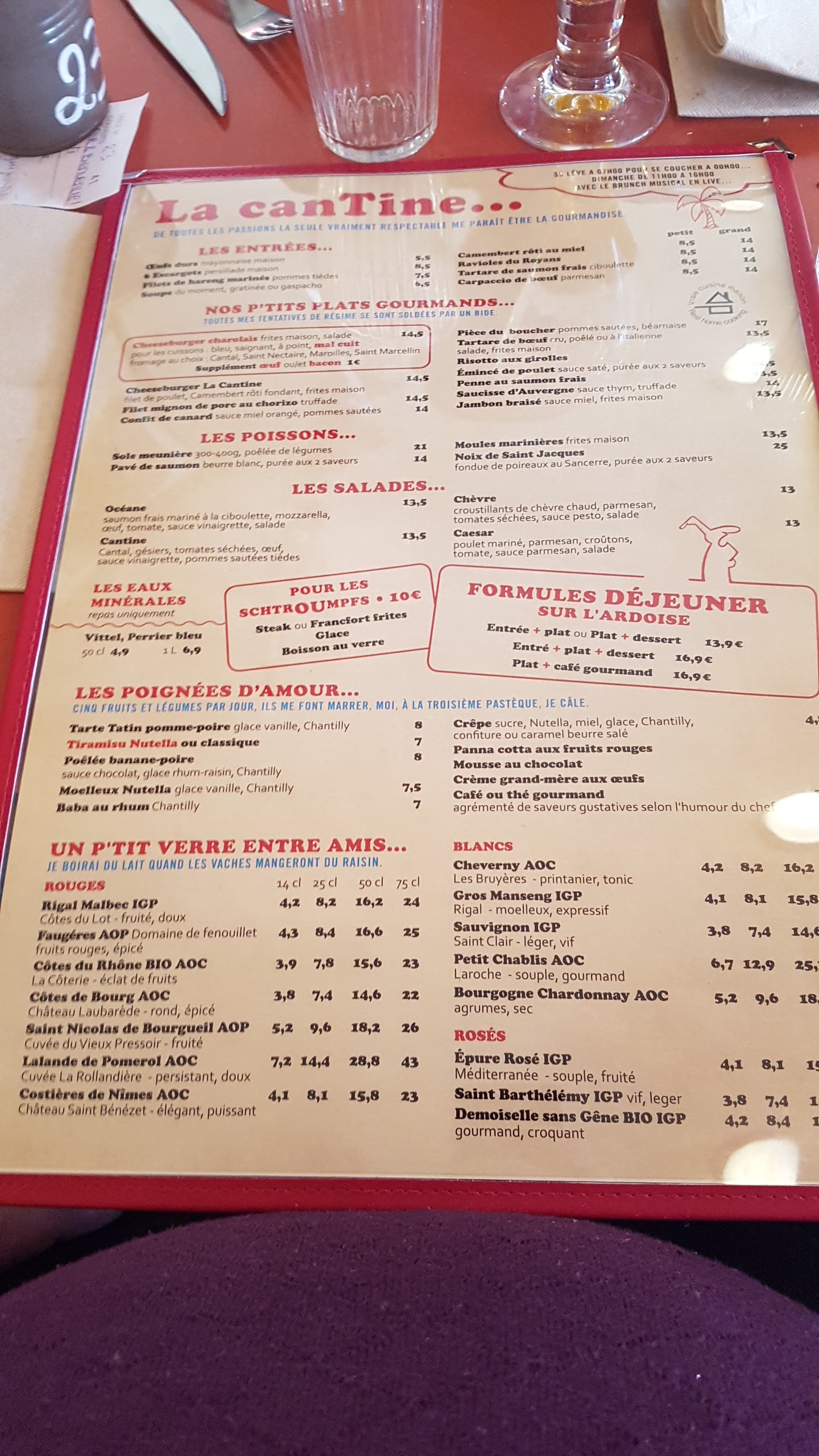 Un dimanche ensoleillé à la recherche d’une table pour déjeuner dans le quartier. Et là, heureux fruit du hasard une place de libre à LA CANTINE. Une découverte alors que voisins de quartier. De bons plats, des accras comme aux Antilles, un camenbert au four, une île flottante etc… service sympa, bonne bouffe et prix abordables pour ce chouette restaurant et sa terrasse bien exposée. On y retournera