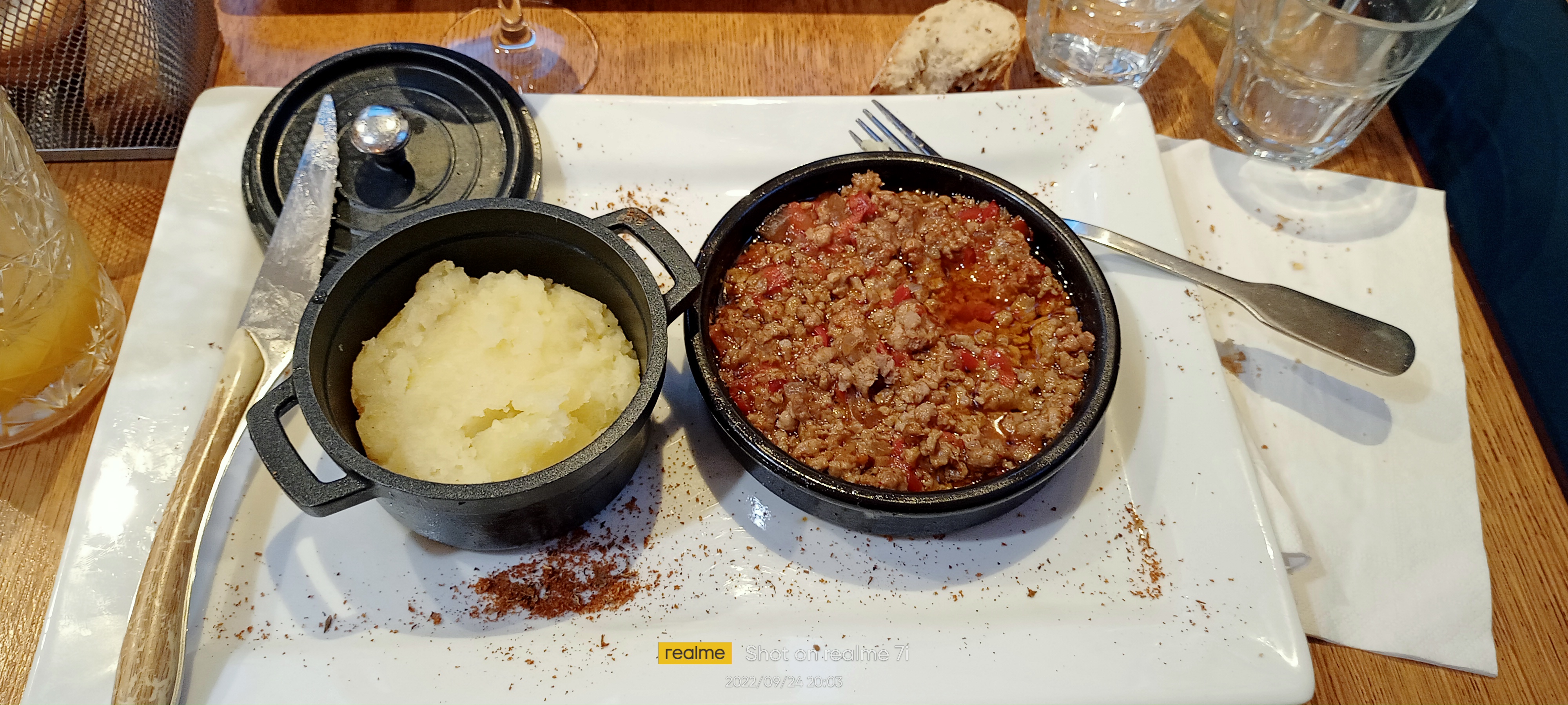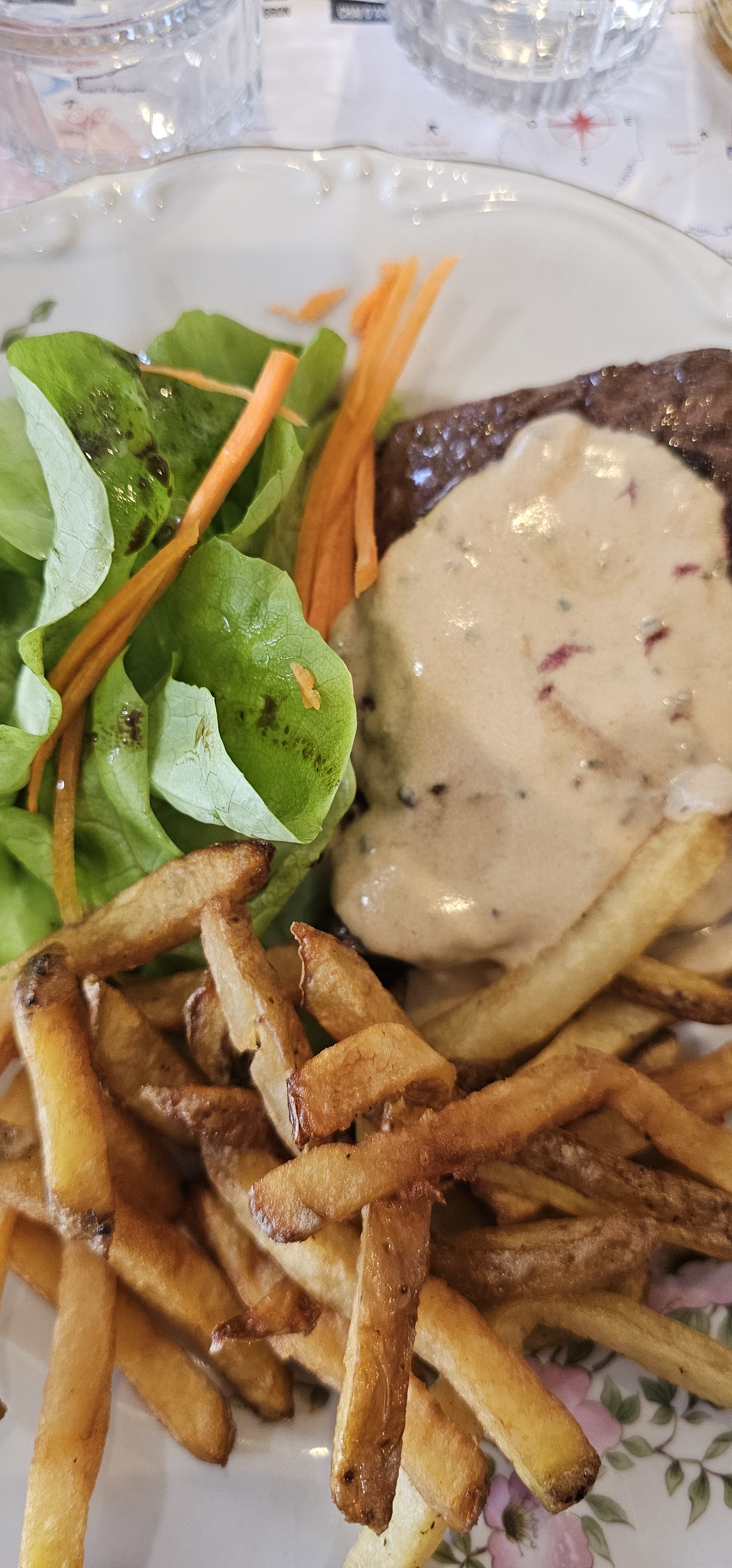 Deçue, j'en avais un très bon souvenir pourtant. Cette fois c'était vraimentla cantine Une cuillère de purée maison soit, mais jetée dans l'assiette comme à l'école et une entrecôte qui a bien résisté, dommage