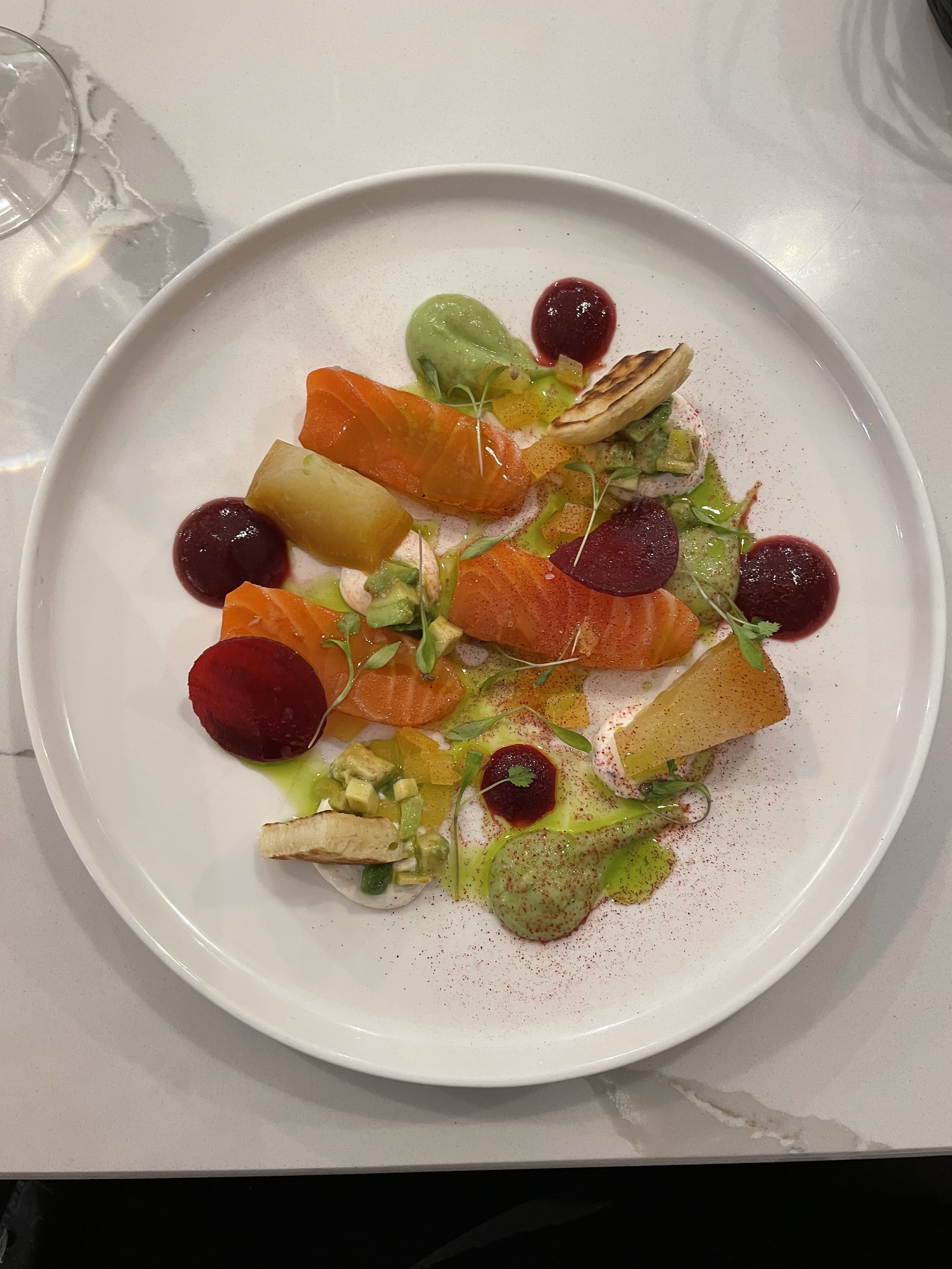 Tout était parfait! Le personnel , la dégustation, l'ambiance Super concept de passer devant une partie de la cuisine avant de monter en salle! 😊