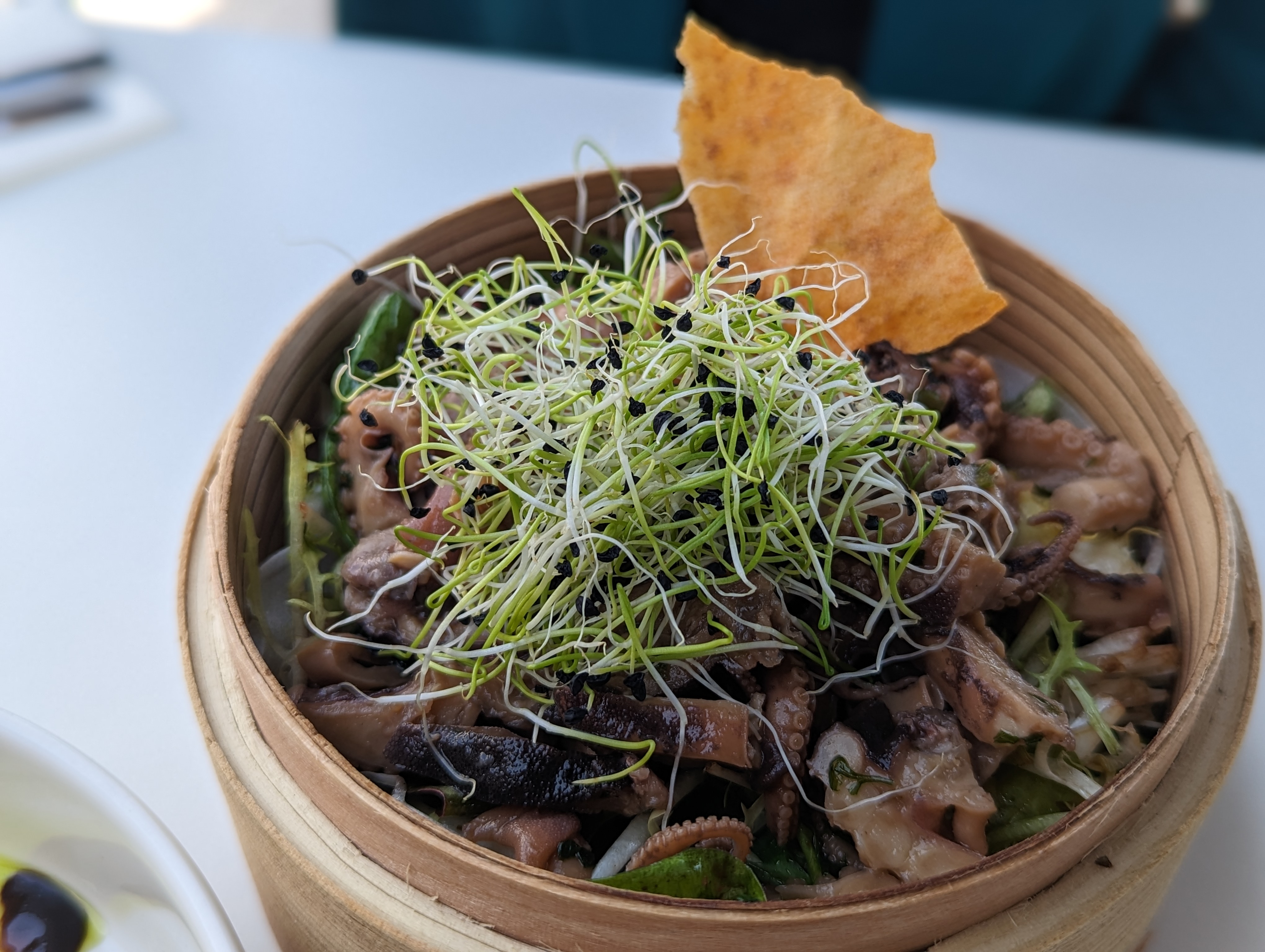 Nous avons opté pour des crevettes tempura en entrée et un risotto aux asperges en plat à la carte. Le plat n’était pas assez chaud, aussitôt dit, aussitôt fait, réchauffé et un dessert + un café offert à titre de compensation pour le désagrément. Un geste commercial très apprécié même si nous n’en demandions pas tant ! Cuisine parfumée, vins au verre très bons, jolie vue de la terrasse en roof top, personnel accueillant, sanitaires propres, que demander de plus ? Peut être un air de musique dans la salle intérieure ? Une bonne expérience à renouveler sans hésiter.