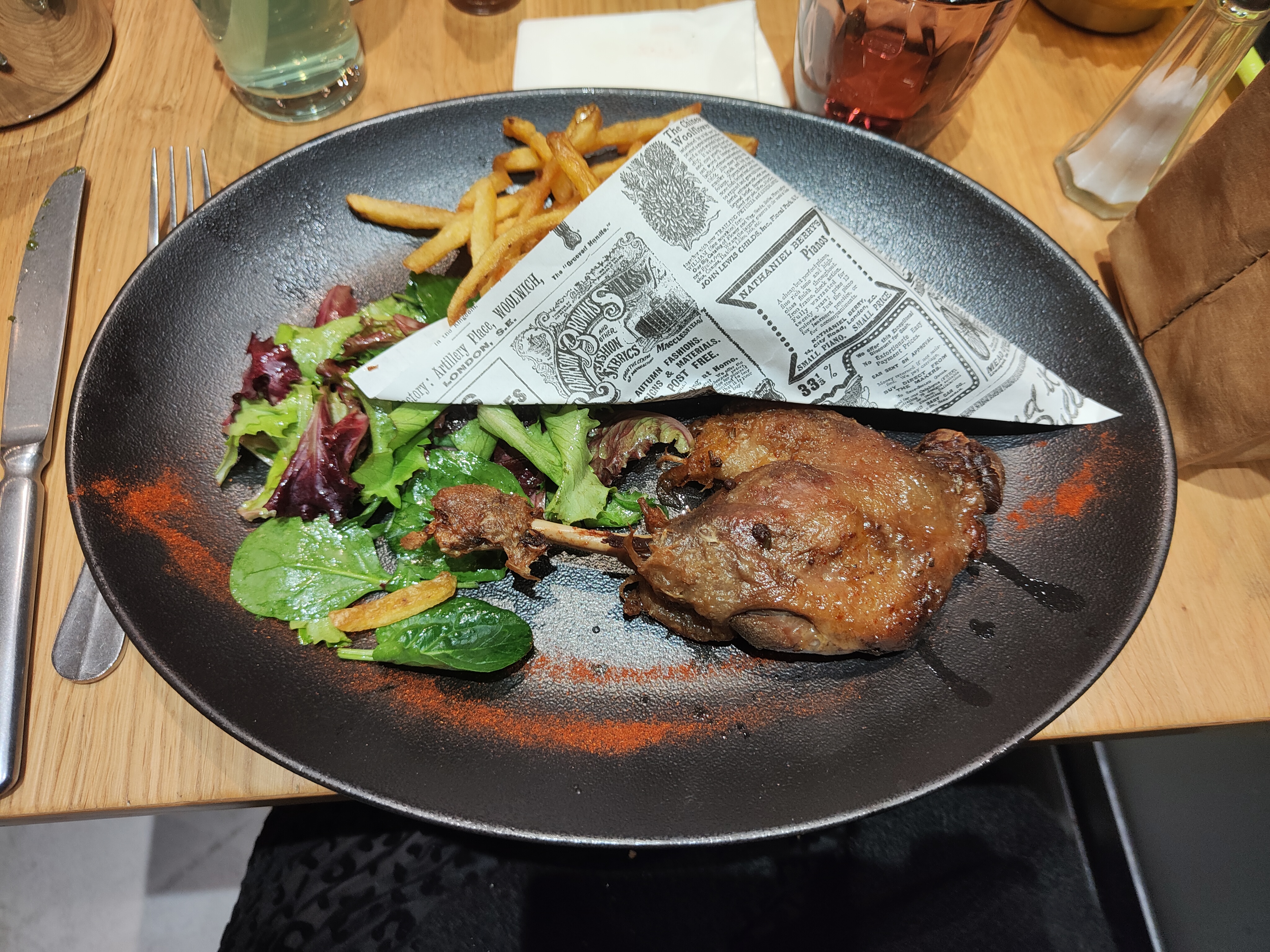 Dîner semaine dernière. J'adore découvrir de nouveaux restaurants mais concernant celui là 👎 Ne pas savoir faire une pièce de bœuf frites maison !!!!! Ce soir-là avec certitude les pièces de bœuf n'était pas toutes de la même qualité !!! Pour ma part je suis tombé sur un simple bifteck à l'arrache avec des frites qui n'était pas cuites et froide !!! Le chèvre chaud niveau cantine, c'est sûr !!! Pour terminer la planche avec ce morceau de gâteau et ses madeleines en miettes !!! Seul le le vin était bon pour ma part !!! Il y a tellement mieux ailleurs 🤔 Je fais quand même 2 à 3 resto différents par semaine.