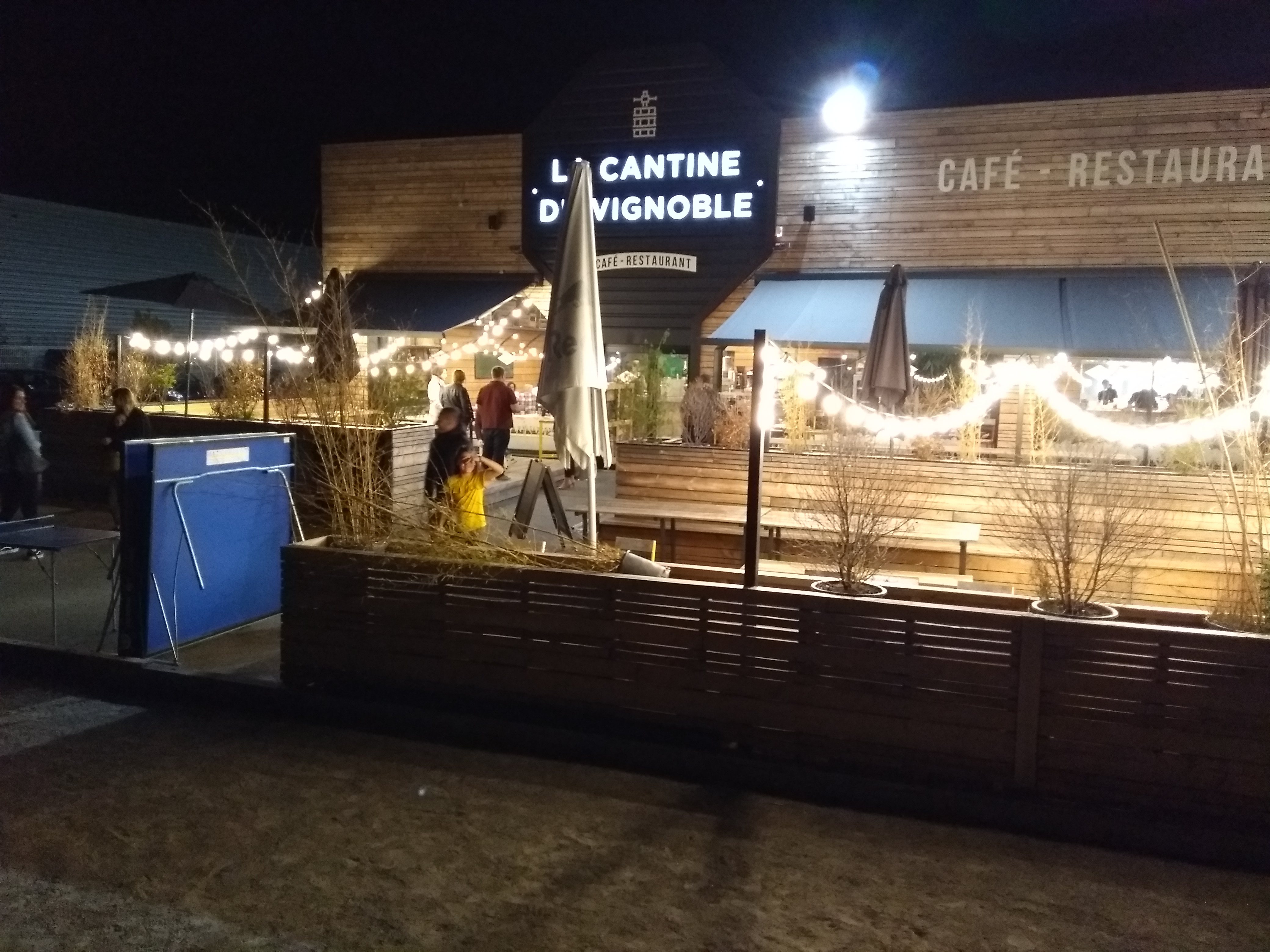 Nous sommes venu manger à la cantine du vignoble récemment et nous n’avons pas été déçus. La décoration intérieur comme extérieur est vraiment belle et originale avec tout ses lampions et ses parasols. Nous avons très bien mangé, les burgers étaient excellents avec une belle présentation. Mériterait peut être un peu plus de salade selon moi et la quantité de frite est parfaite. Quand aux desserts le trio de crème brûlée a été très apprécié et une mention spéciale à la brioche perdue qui était juste excellente et bien garnie au point que j’ai eu du mal à la finir. C’est agréable d’avoir une vue sur la cuisine ouverte mais si les cuisiniers pouvaient éviter d’être sur leur téléphone en plein service ce serait encore mieux ! Le seul point négatif selon moi est les toilettes qui a elles seules ne mériteraient pas plus de 2 étoiles !