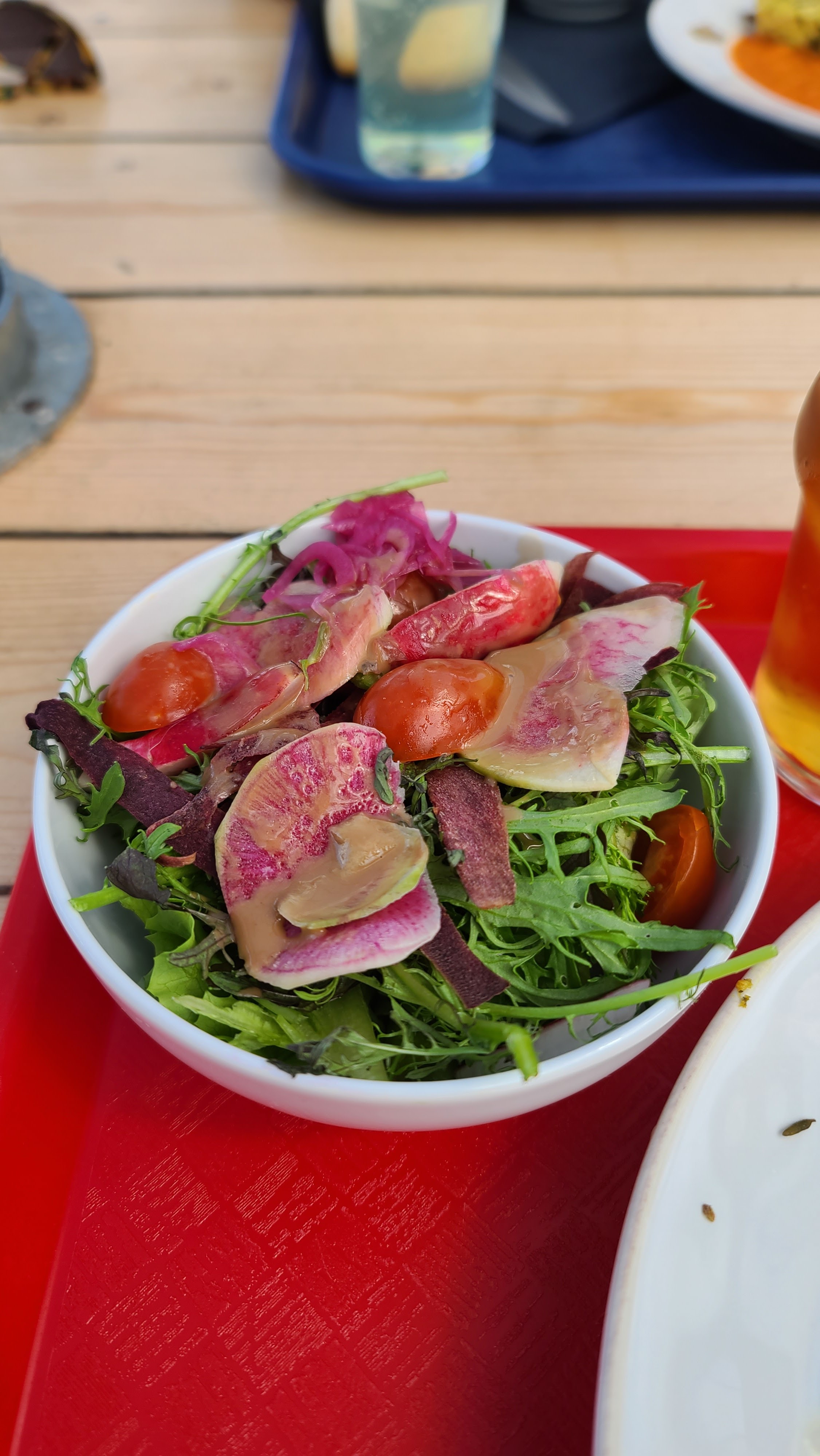 Passage sur un samedi, environ une de queue à 13h30 ! On est reparti. Revenu un lundi midi, cette fois ci personne. Lieu agréable et vaste. La nourriture est correcte, prix convenable mais cela ne vaut pas plus (14 euros par adulte pour plat dessert et boisson). Dans trois assiettes sur cinq nous sommes tombés sur des petits cailloux, donc le nettoyage des légumes ne doit pas être terrible. Nous l'avons montré au bar, juste un désolé mais pas de geste commercial ou quoi que ce soit. Spot à la mode, mais pas indispensable. Je m'attendais à mieux avec le potager à côté et le monde sur place.