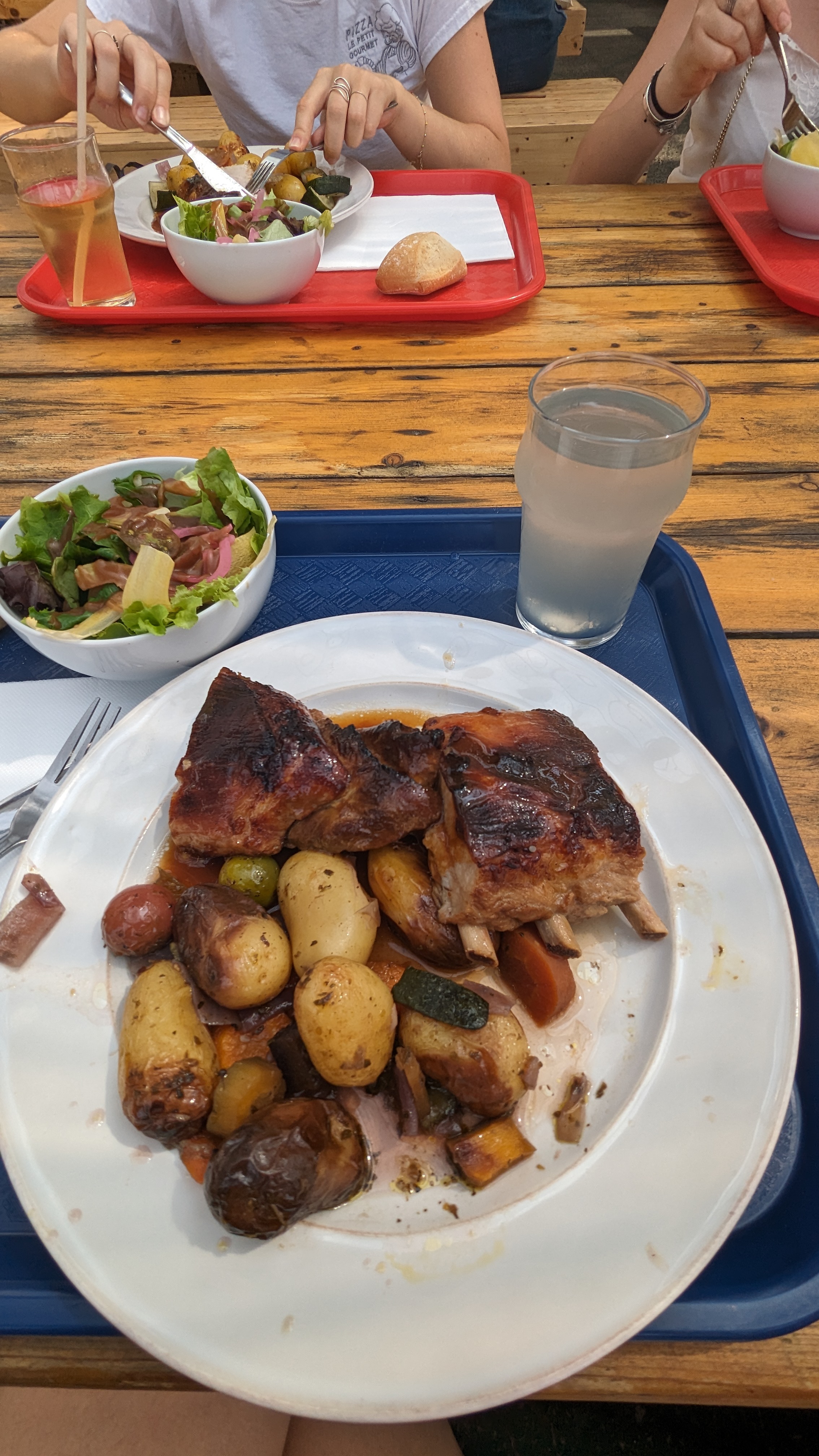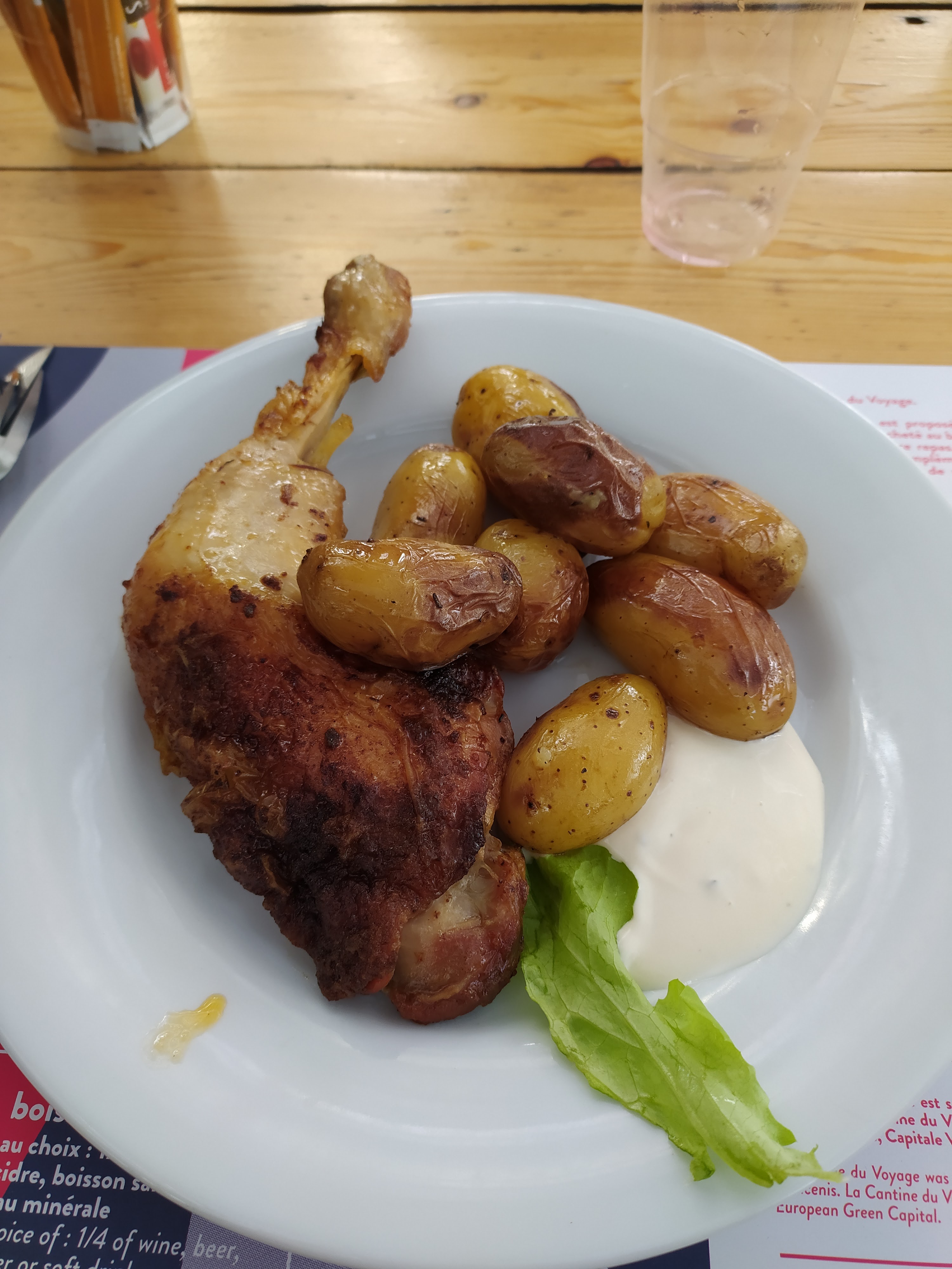 Super idée du plat unique! Très très bon marché du coup pour une entrée, plat et boisson!! Le poulet est bon et local, les pommes de terre bien cuites et le cidre accompagne très bien. Par contre le staff, tellement occupé que pas très serviable finalement. On a changé de place pour avoir un bout de table pour mettre une chaise bébé et même après l'avoir signalé à notre premier serveur puis notre nouvelle serveuse, nous avons attendu plus de 30mn après notre entrée! Difficule de faire tenir les enfants - heureusement que la colline à escalader est là!!