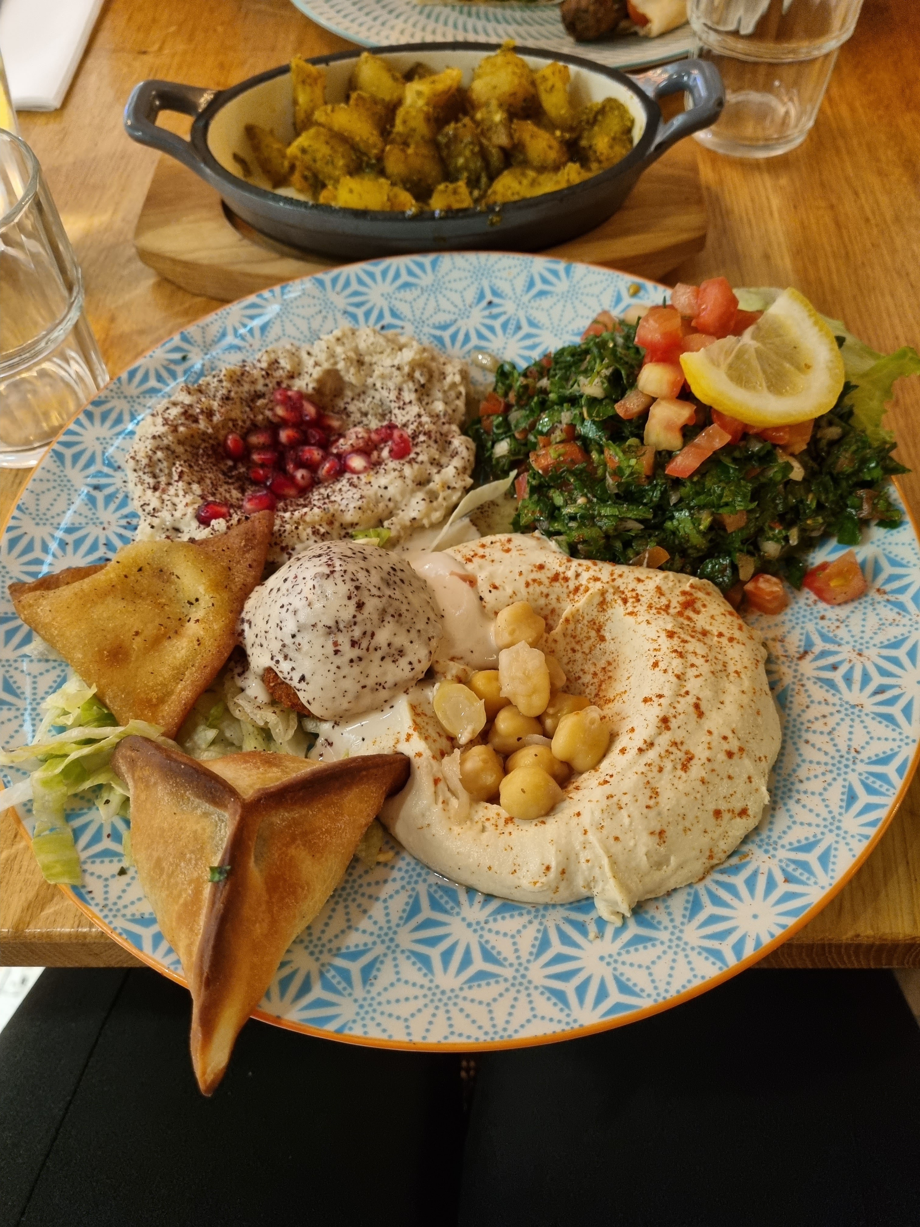 Une belle découverte mais Les prix sont élevés (normal qui a déjà vu un homous pas cher ?) Jai pris une assiette à composer soit même, les conseils sont bons. Il y aussi des sandwichs (chawarma). Le homous, le caviar d'aubergine et la moussaka sont un vrai délice ! Un plaisir de venir