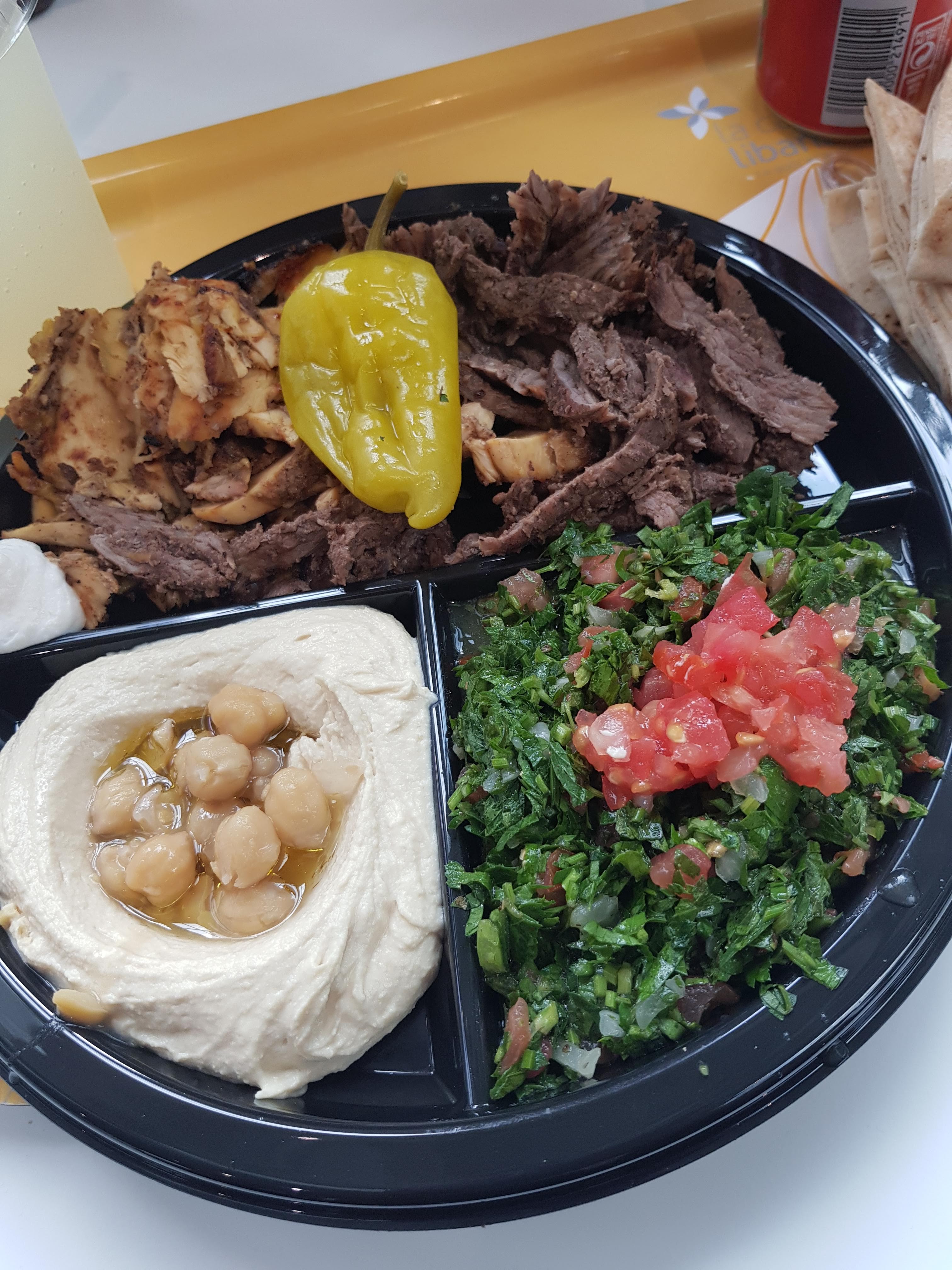 Shawarma et sviha viande mal epicees (trop d‘ail et de cardamome), taboule immangeable vu que les tomates n‘etaient pas fraiches. J‘espere pour tout le monde que ce n‘est pas tous les jours comme ca!