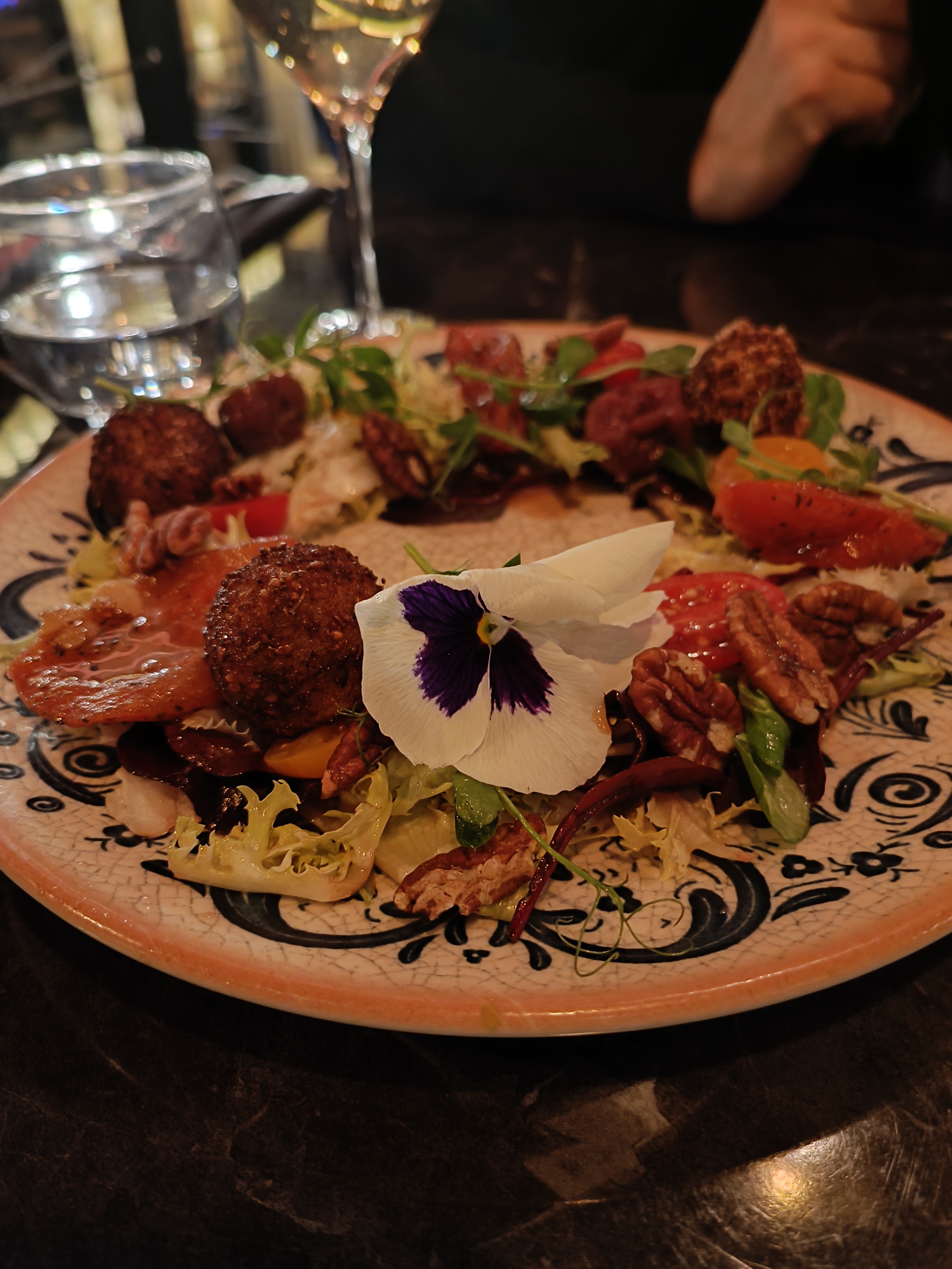 Dîner entre amies un soir où il faisait très beau et chaud , nous avons donc profité de la terrasse ! Le vin était très bon par contre très déçues de la planche apéro avec 1 seul fromage et 2 charcuteries + houmous fade (20€) Ensuite nous avons pris le Dahl de lentilles (végétarien) et il était EXCELLENT ! Le service a été très agréable
