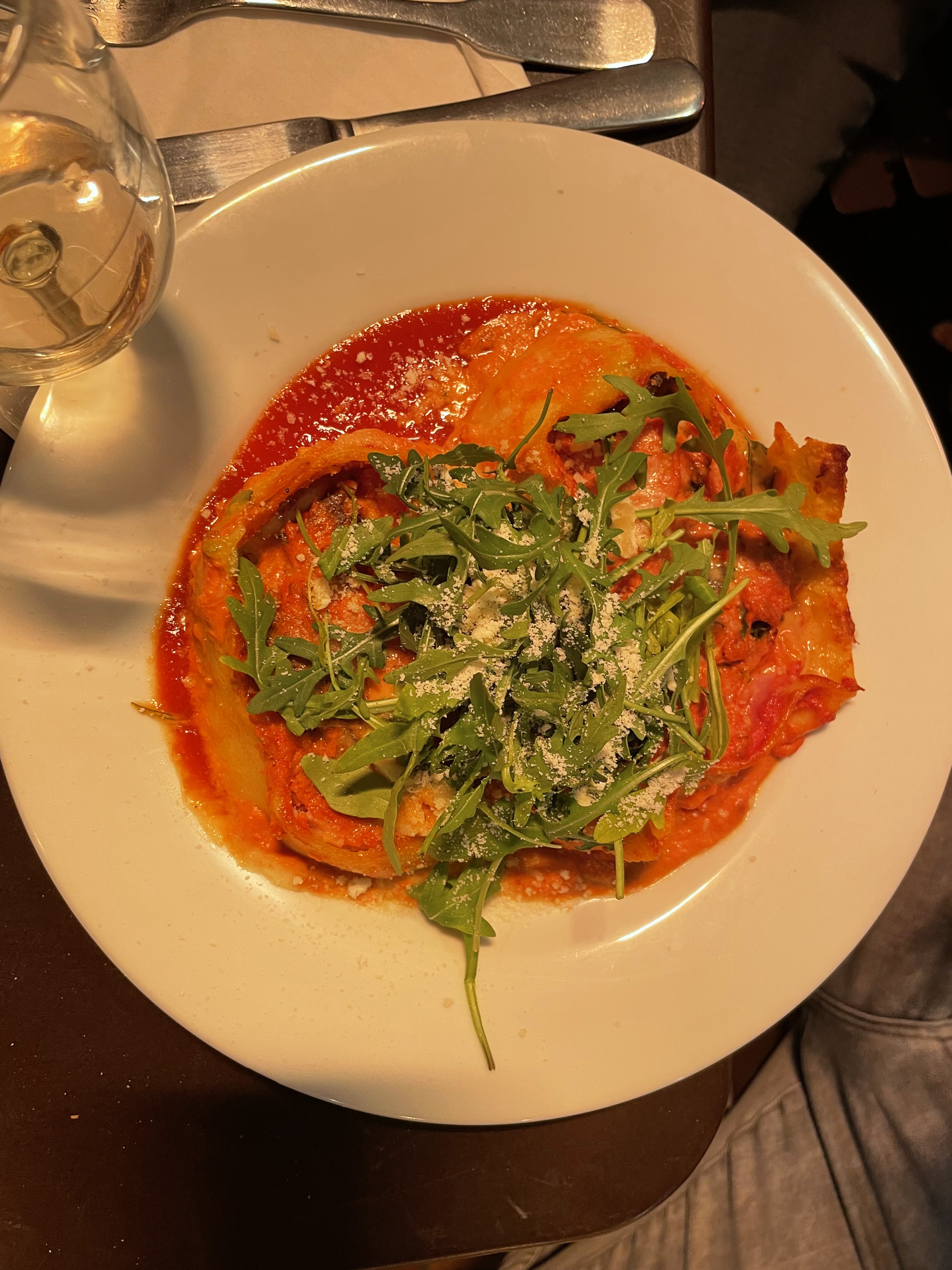 Temps d'attente un peu long pour des pâtes trop aldente mais cependant assez goûtues. Entrée burrata délicieuse. Très peu de choix végétariens (une entrée et un ou deux plats max). Serveuse très agréable. Prix un peu élevés mais en corrélation avec l'énorme quantité servie (nous n'avons pas pu finir), peut-être rééquilibrer cela car nous n'avions plus aucune place pour le dessert, c'est dommage et j'imagine que nous ne sommes pas les seules dans ce cas. Pensez aussi à élaguer l'arbre dans le patio, nous avons eu l'heureuse surprise que l'une d'entre nous reçoive sur la tête une énorme écorce.