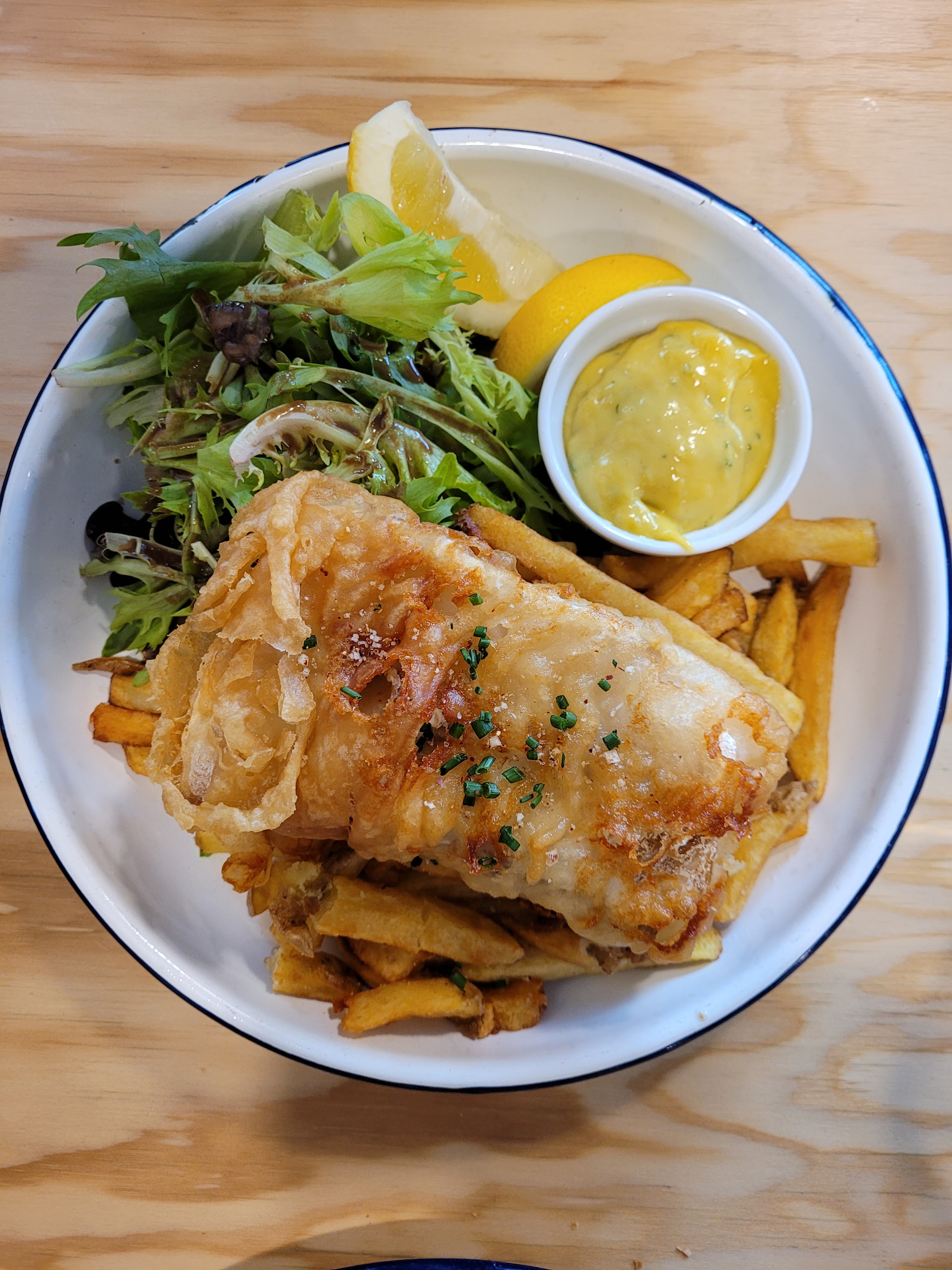 Entre collegues de boulot on y va tres tres regulierement Je recommande 100% Le fish and chips est une valeure sure Sinon j'adore aussi la salade au saumon avocat Et les desserts sont des pepites surtout celui au speculoos Au niveau prix pour plat dessert il faut compter entre 15 et 20€ mais meme etant une bonne mangeuse je mange le dessert au gouter perso (on oeut emporter notre dessert) Foncez :)