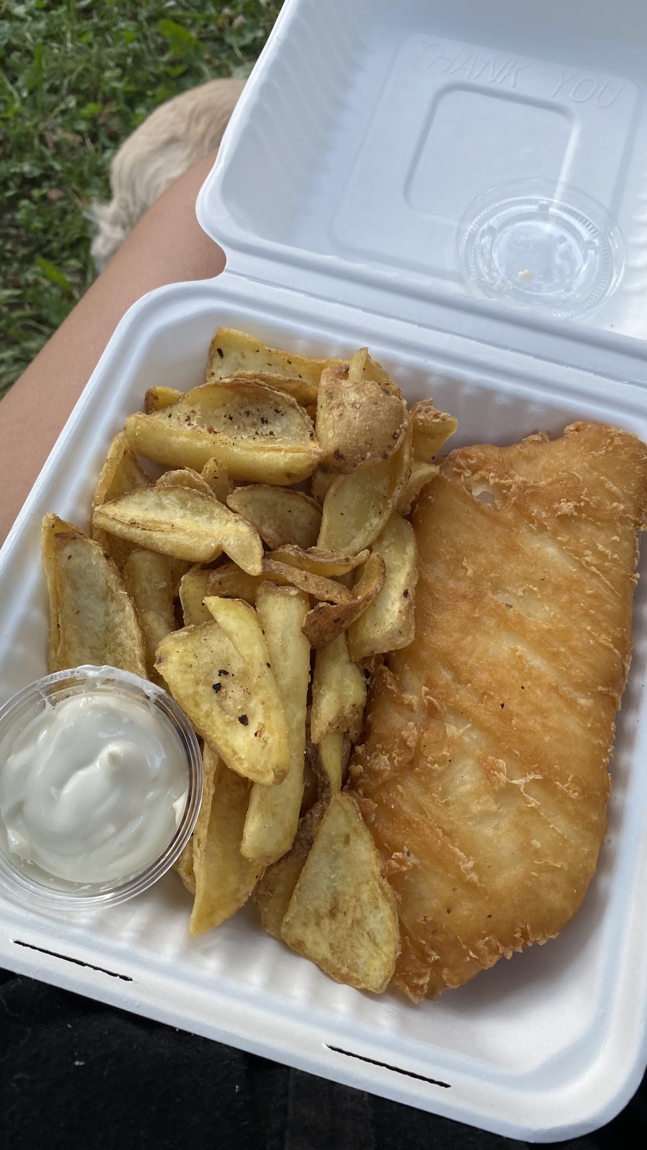 Délicieux poisson et frites et poulet et frites. Petite mais jolie terrasse. Propriétaires sympas et parlent bien anglais.