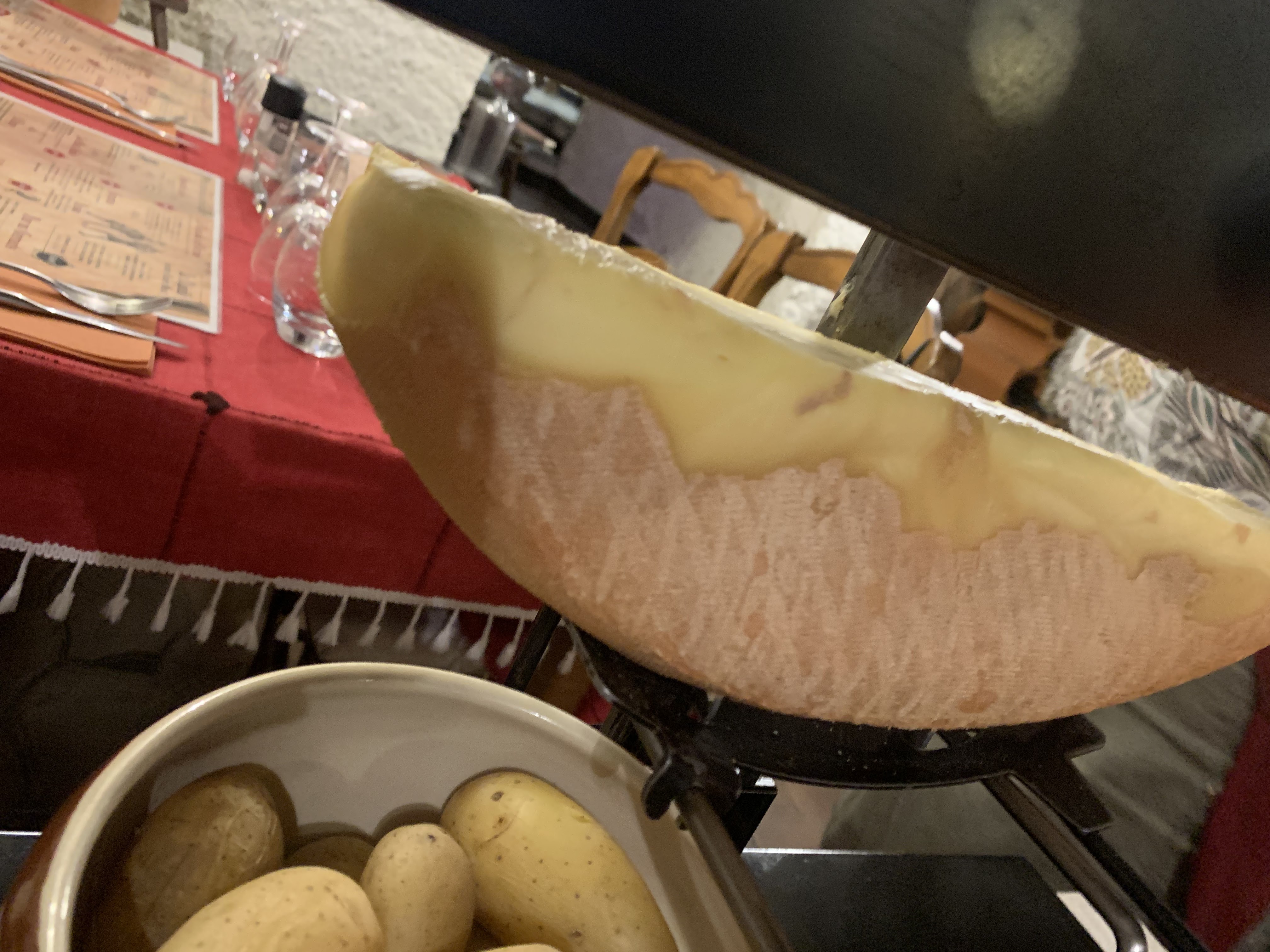 Pendant la commande, nous nous sommes levés et sommes partis. Nous étions trois (mon fils de onze ans qui n'avait pas faim) et nous avions envie de tester la raclette. Nous commandions 2 portions mais le propriétaire nous a dit que nous devions lui en procurer une aussi, complète ou à moitié. Expliquant qu'il le goûterait tout au plus chez nous (aussi parce que nous ne savons pas s'il l'aimerait), il nous a dit textuellement si je le vois manger un morceau de fromage, je le lui chargerai. Pas d'autres commentaires.