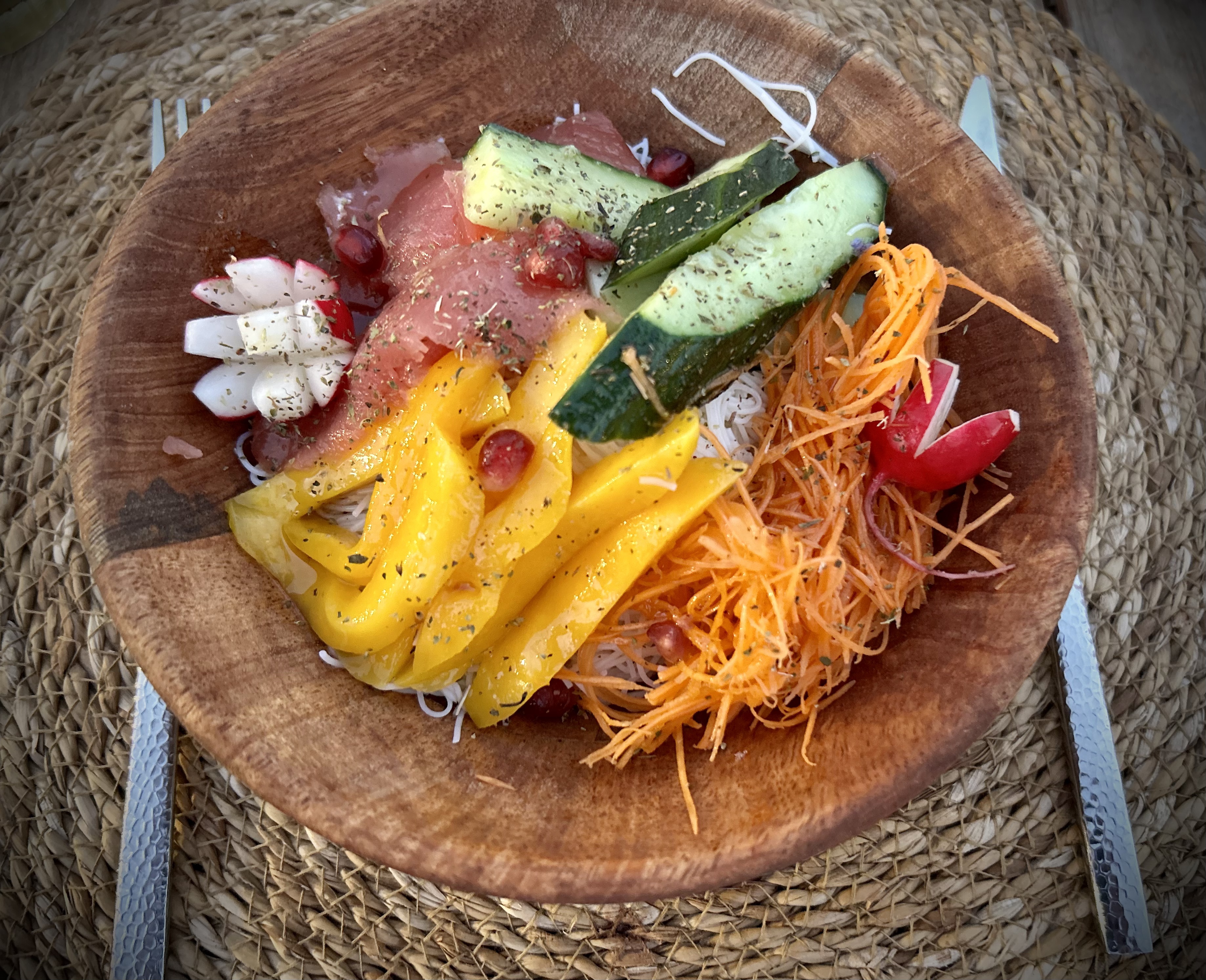 Une cuisine raffinée de produits frais et goûteux, le tout servi de façon professionnelle dans un cadre idyllique.prenez en dessert l assiette de fruits frais , un assortiment gargantuesque de fruits ,délicieux et frais. Merci superbe moment.