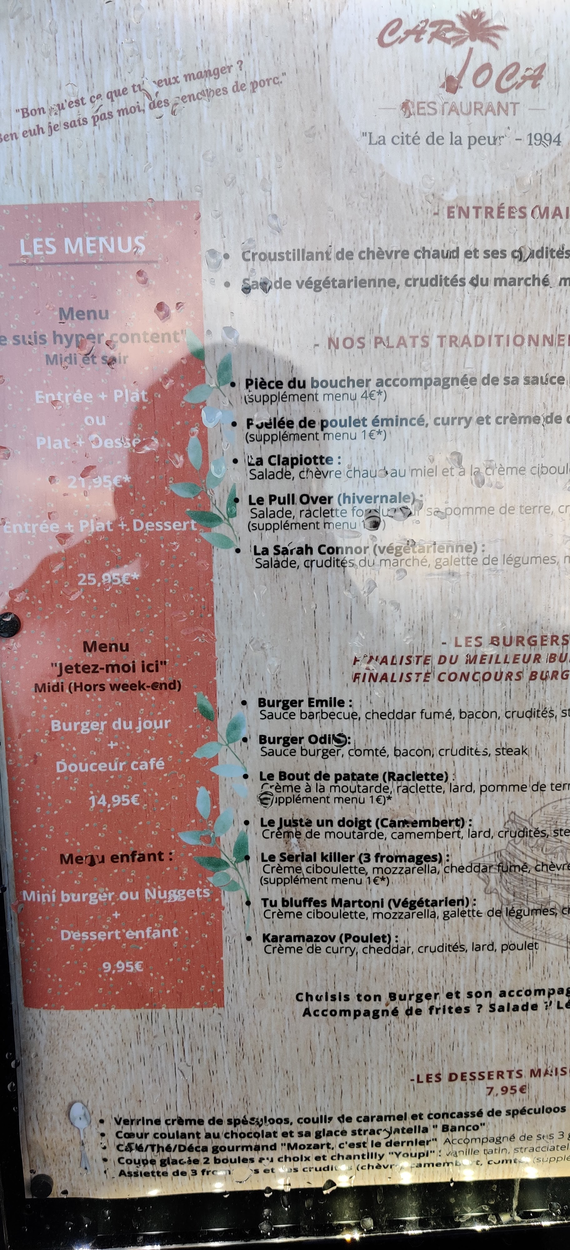 Les burgers sont excellents, tout était très bien, mais j'avoue avoir été déçu par le concept à mon sens pas assez poussé (mais objectivement pas assez pour enlever un étoile). Les références à la cité de la peur son limitées au nom des plats et à quelques cadres. Un petit sous titre en dessous du nom du plat contenant une référence plus poussée pourrait être plus sympa : Burger Emile Je suis super contant Sauce barbecue, cheddar fumé, bacon, crudités, steak Le Juste un doigt : (estivale) Vous voulez pas un whisky d'abord ? Sauce poivrons, mozzarella di bufala, charcuterie, crudités Le Serial Killer (3 fromages) Un quoi ? Sauce caesar, mozzarella, cheddar fumé, chèvre, crudités, steak (supplément menu 1€*) Karamazov (poulet) Aucun lien, je suis fils unique Crème de curry, cheddar fumé, poulet, bacon, crudités