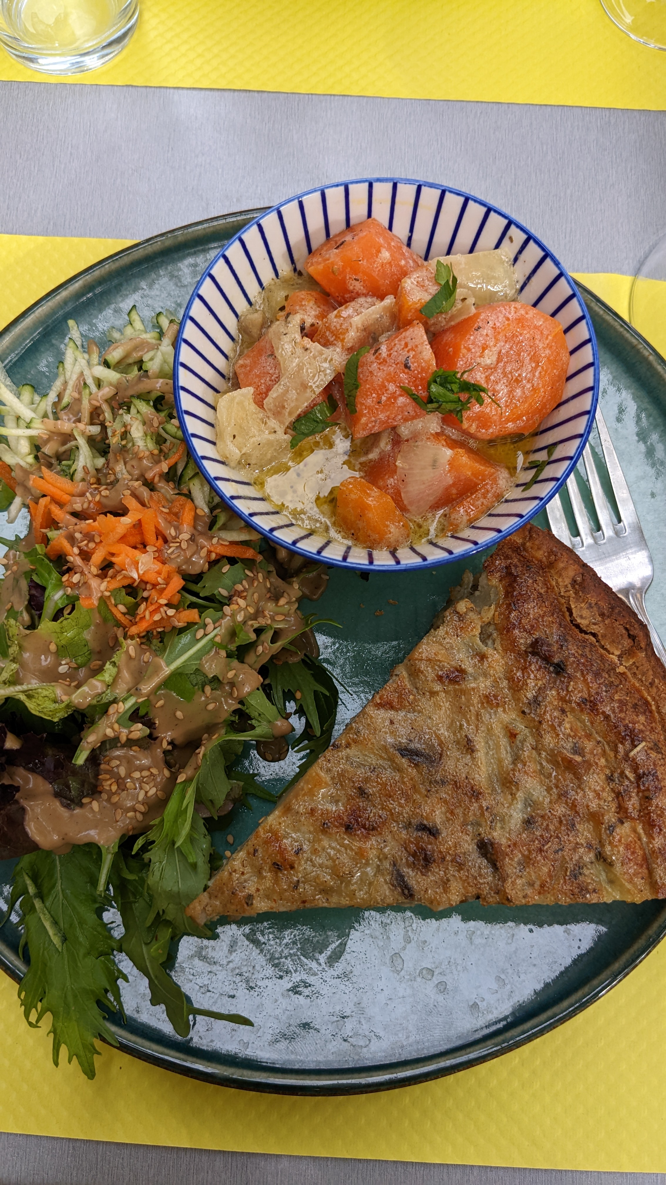 Belle petite sélection de plats. Délicieuse assiette végétarienne, carpaccio de bœuf et tarte au chèvre. Propriétaire sympathique