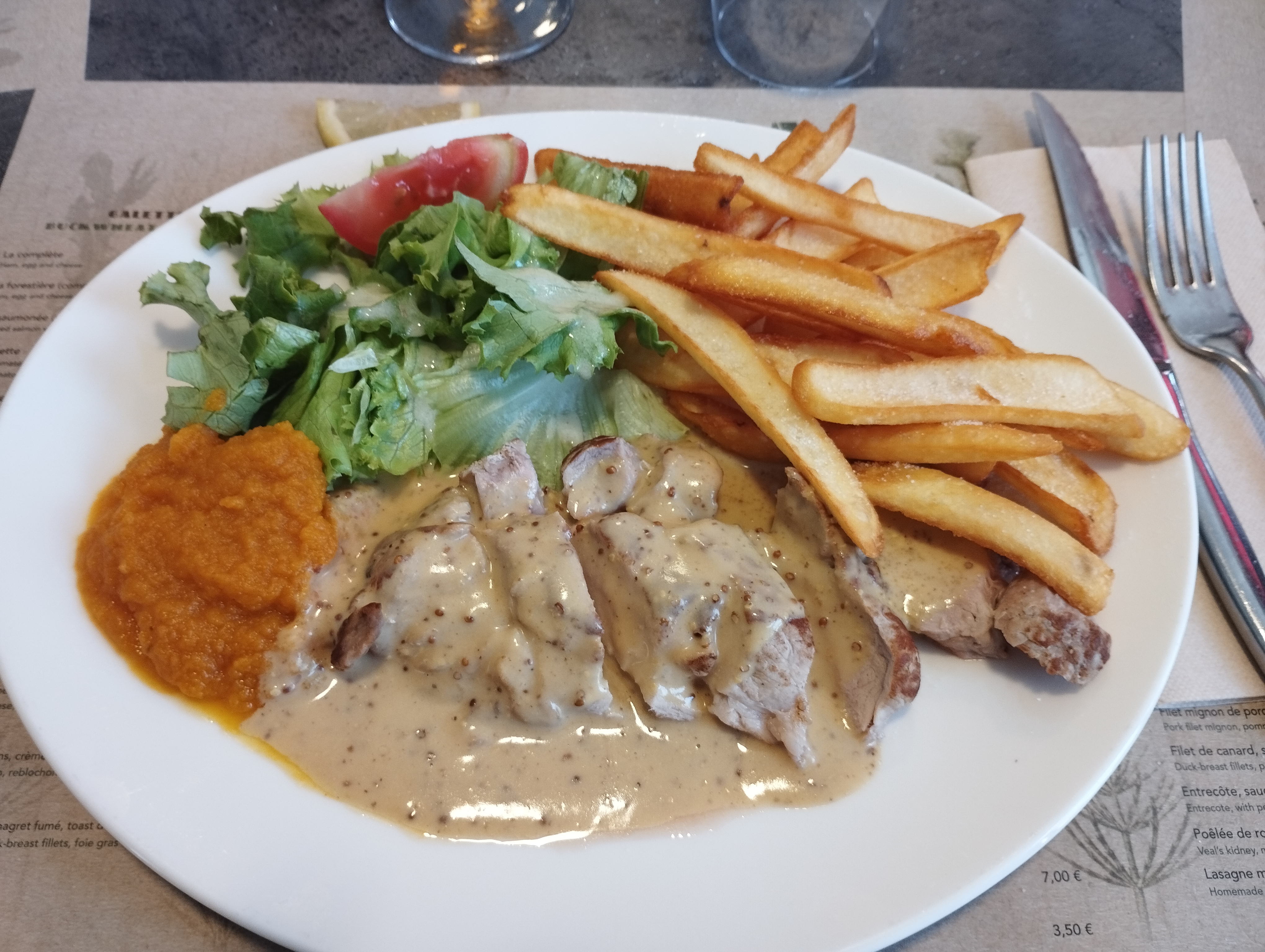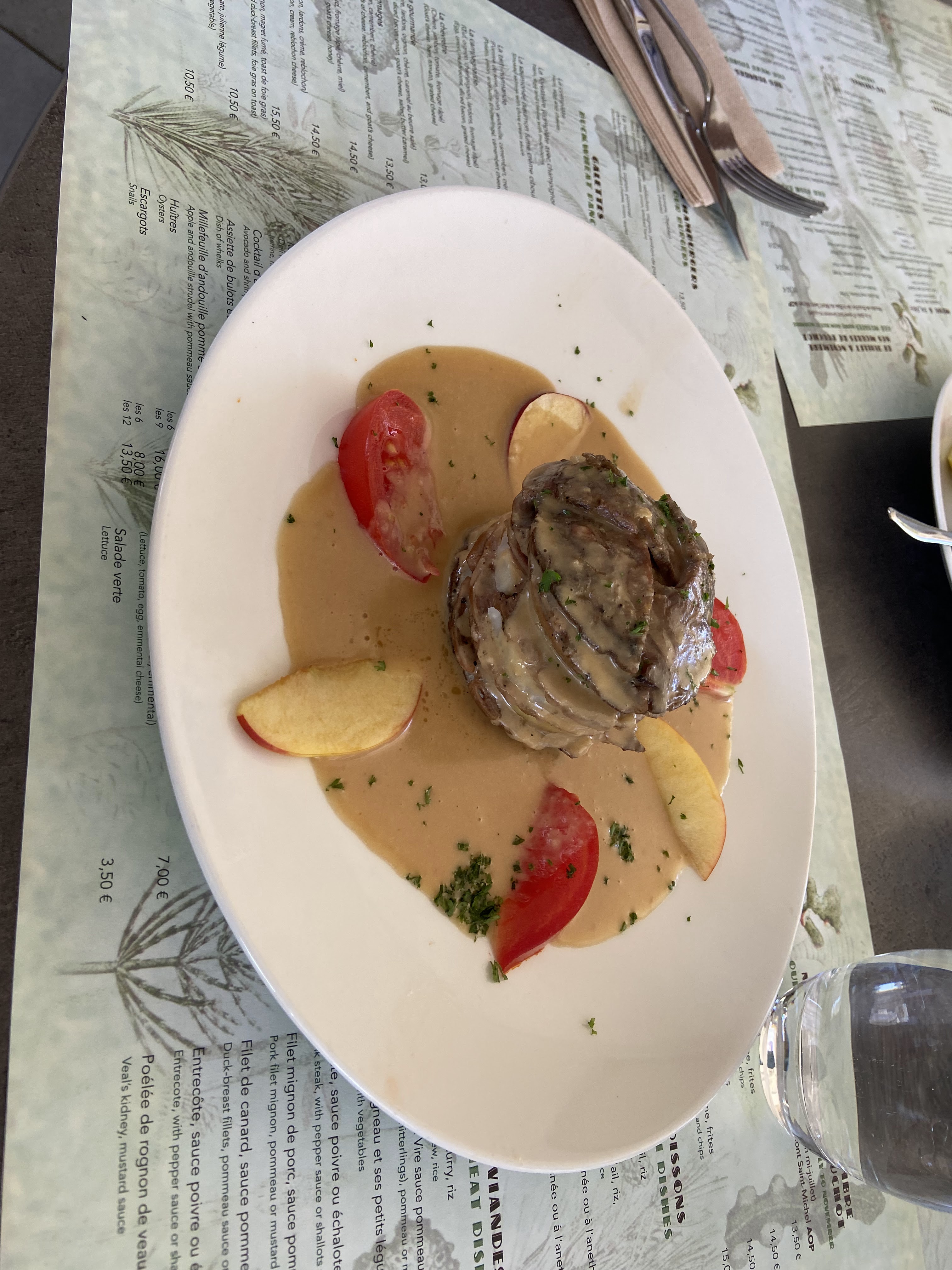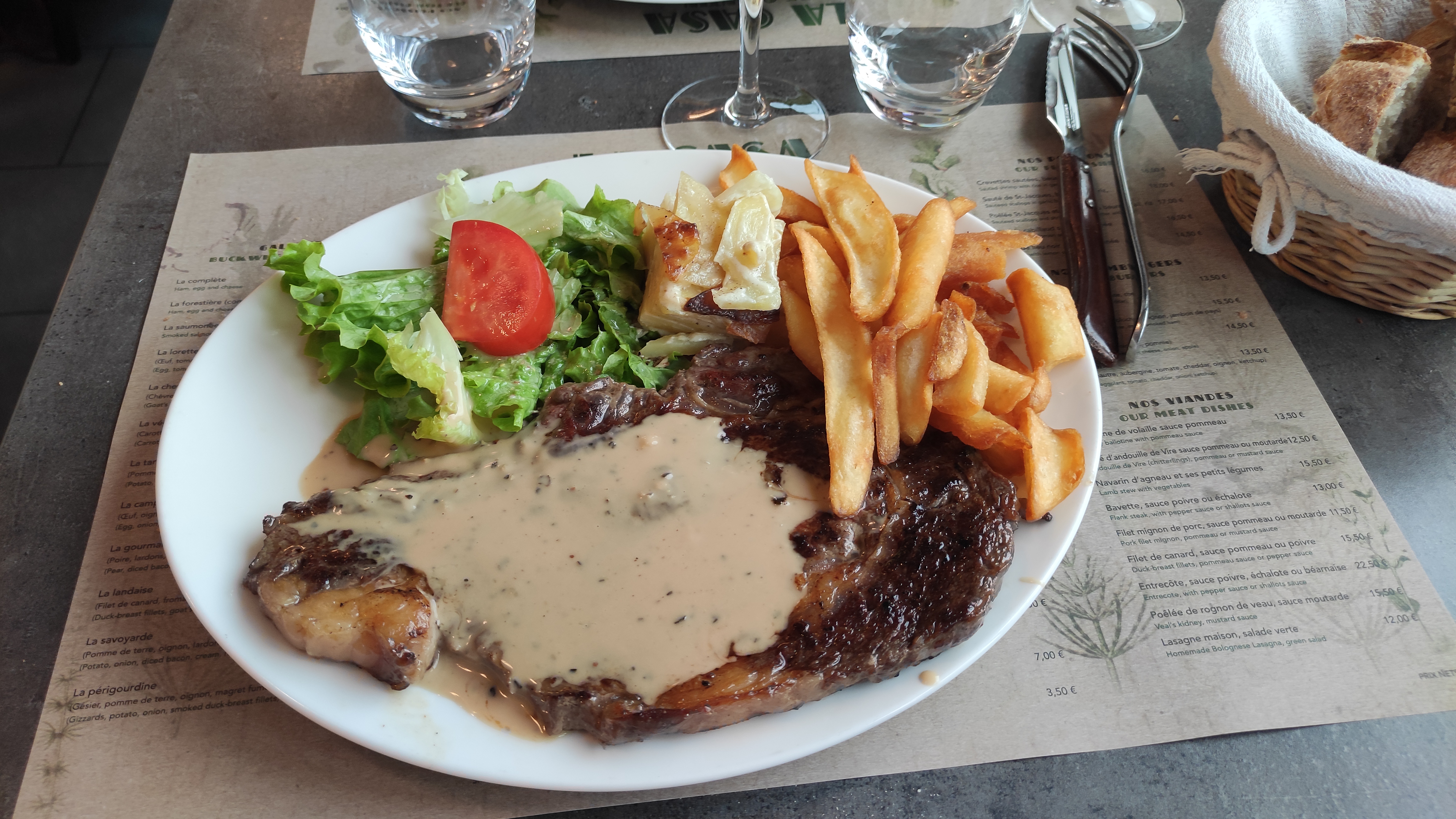 Nous avons visité ce soir sur la base de notre recommandation de camping. Nous sommes arrivés à 19h05 et avons d'abord poliment dit qu'ils étaient complets. Mais le gérant a réussi à nous faire entrer (livre d'indices pour éviter toute déception). C'était une atmosphère charmante avec un personnel super poli et sympathique qui parlait anglais (cela ne nous dérange pas, nous sommes heureux de faire de notre mieux en français. Mais c'était utile) Il y a un bon menu varié et le tout à un prix très intéressant. Les repas enfants composés d'un plat principal et d'un pudding coûtaient 9,50 €. J'ai eu la bavette avec des frites (photo) et une crêpe aux pommes et au caramel salé pour le pudding. Mon mari a pris le plat principal de canard et le pudding fondant au chocolat. C'était incroyable. Je ne saurais trop recommander cet endroit.