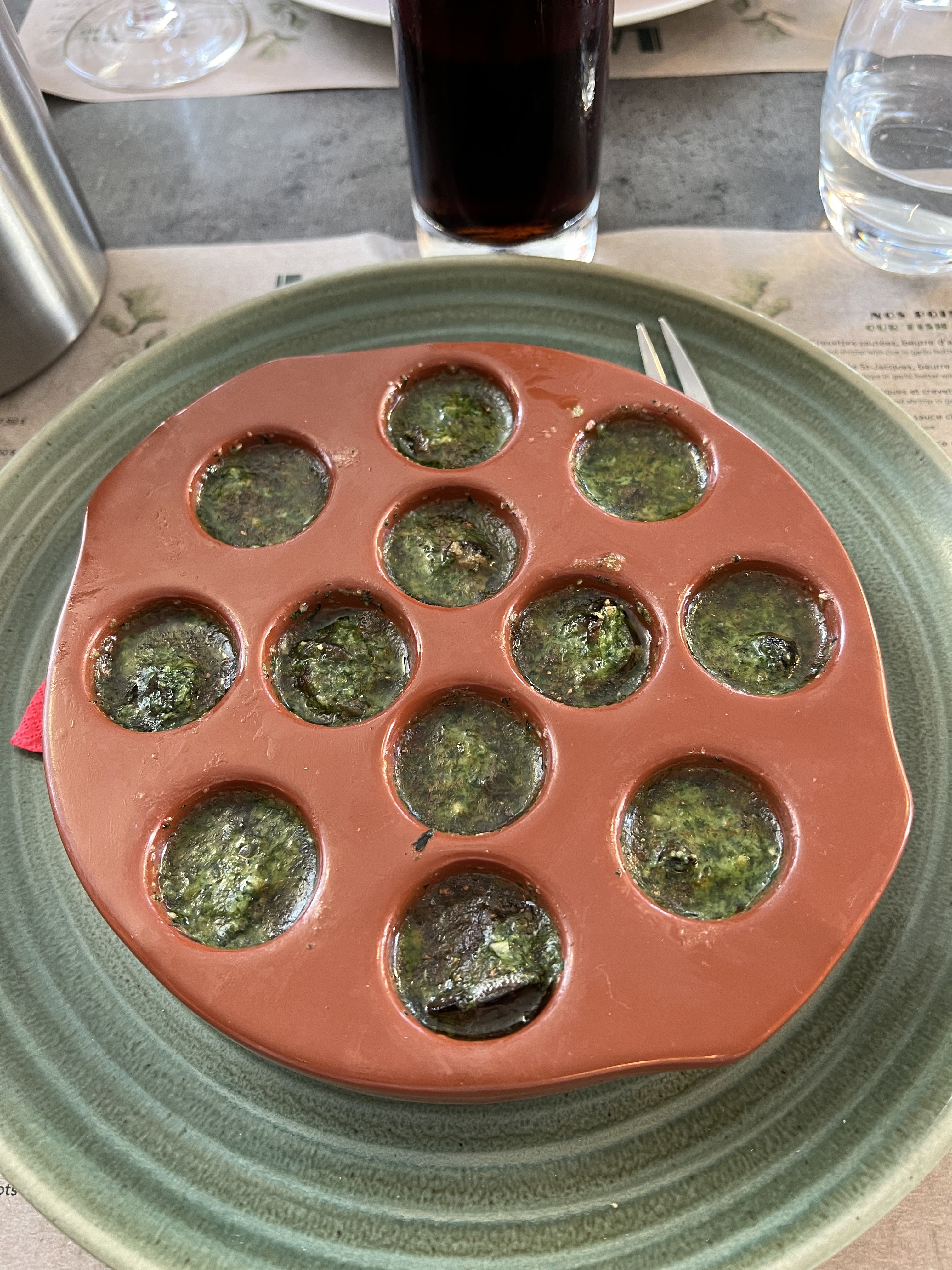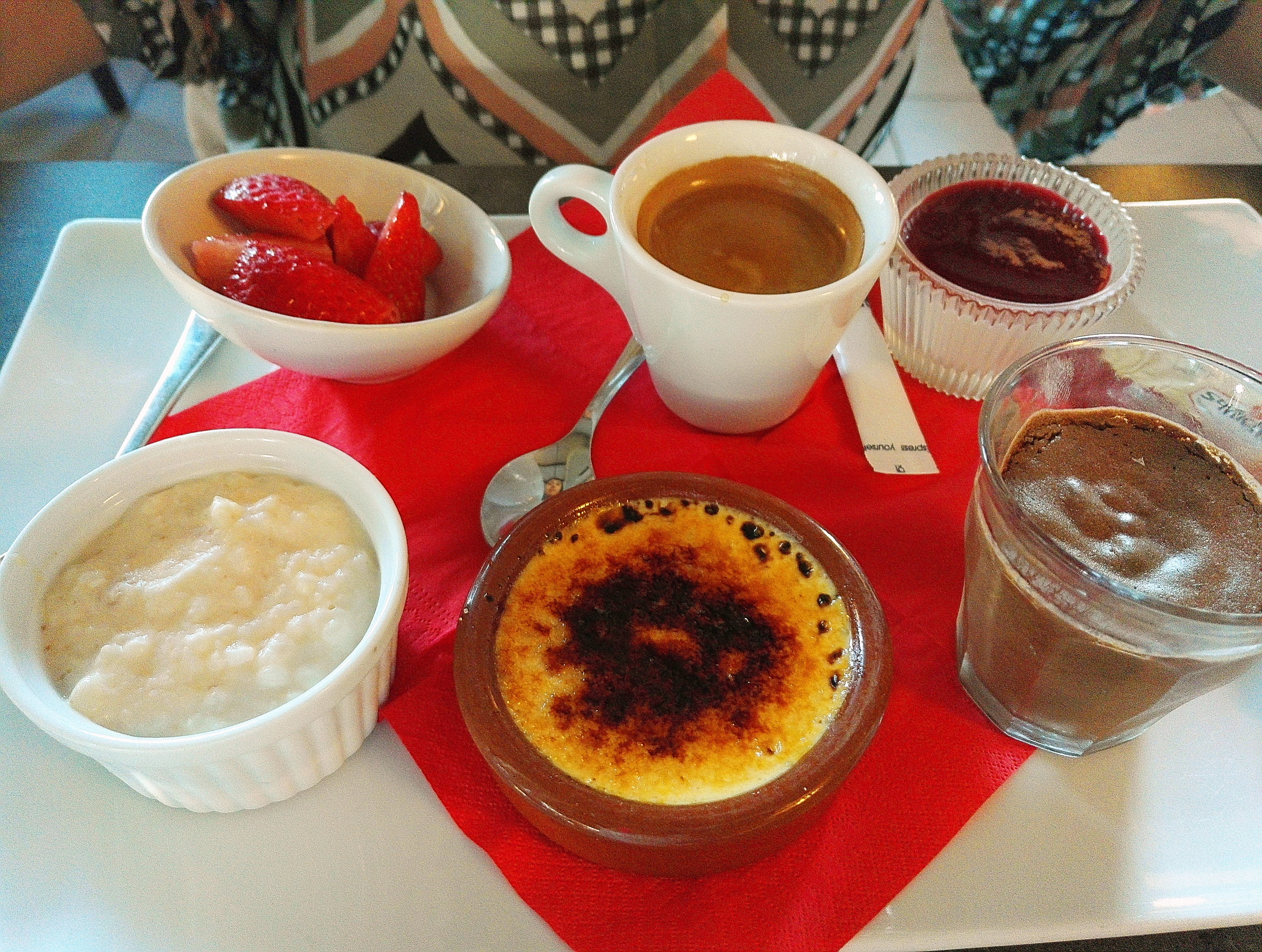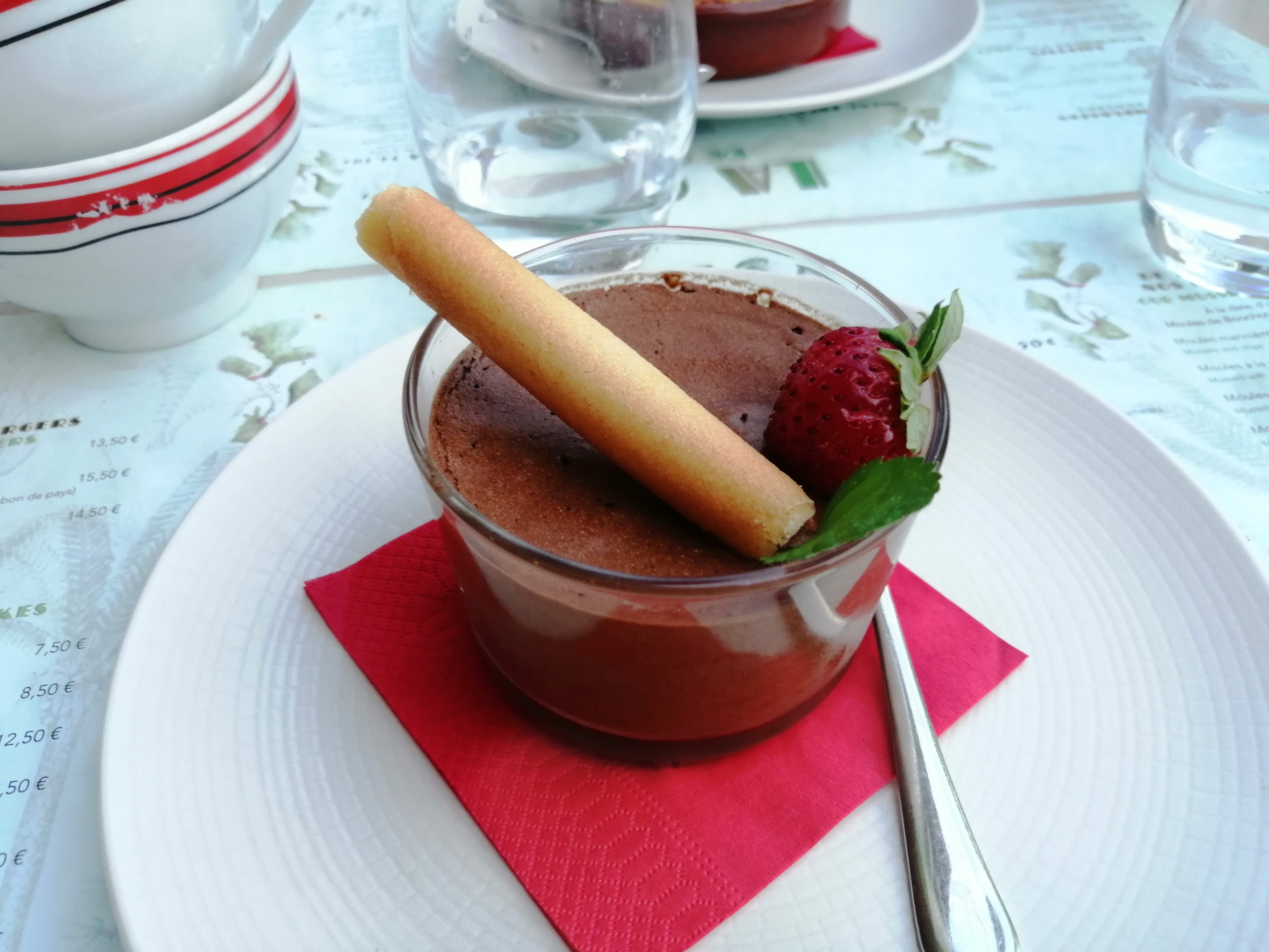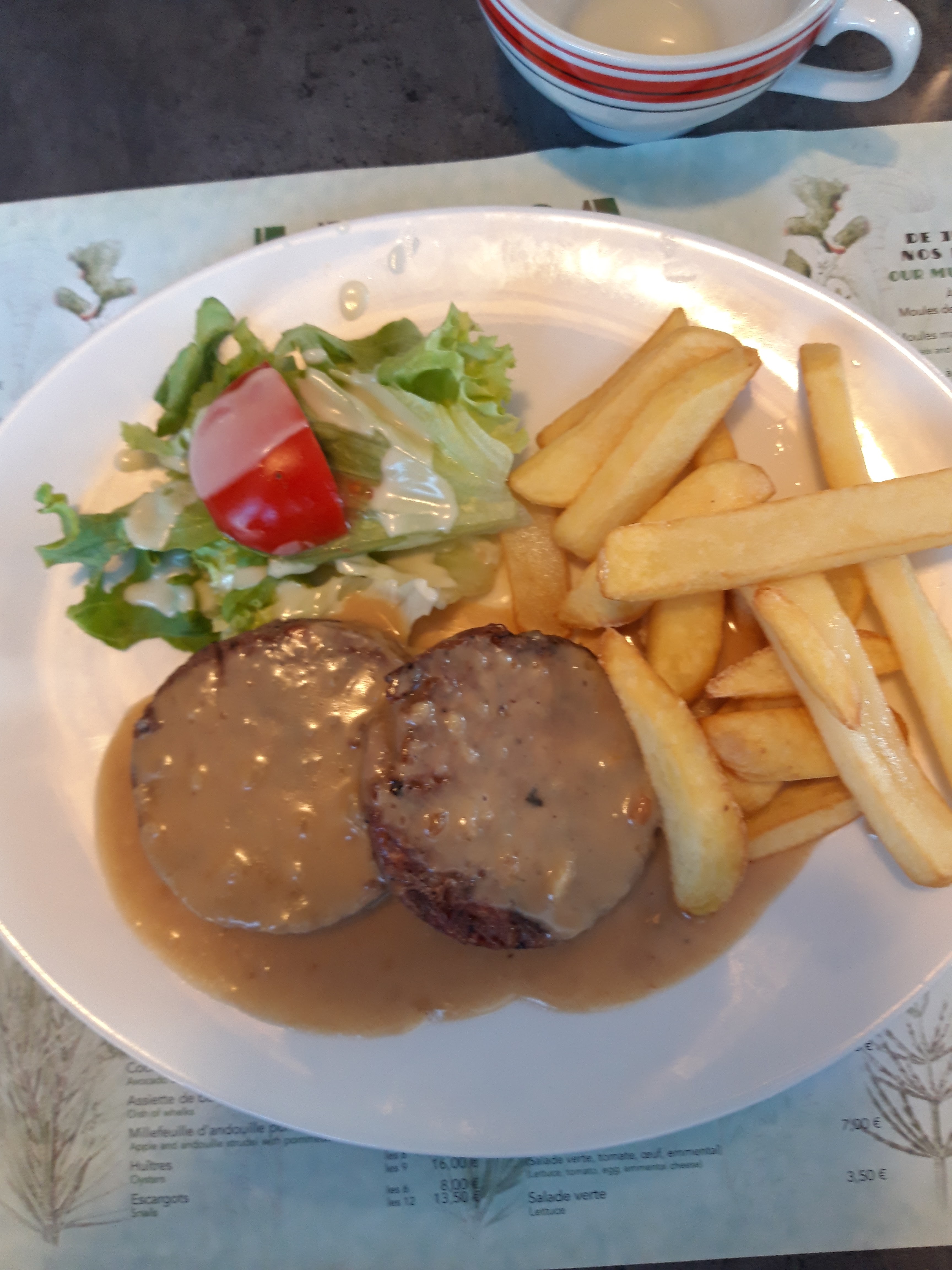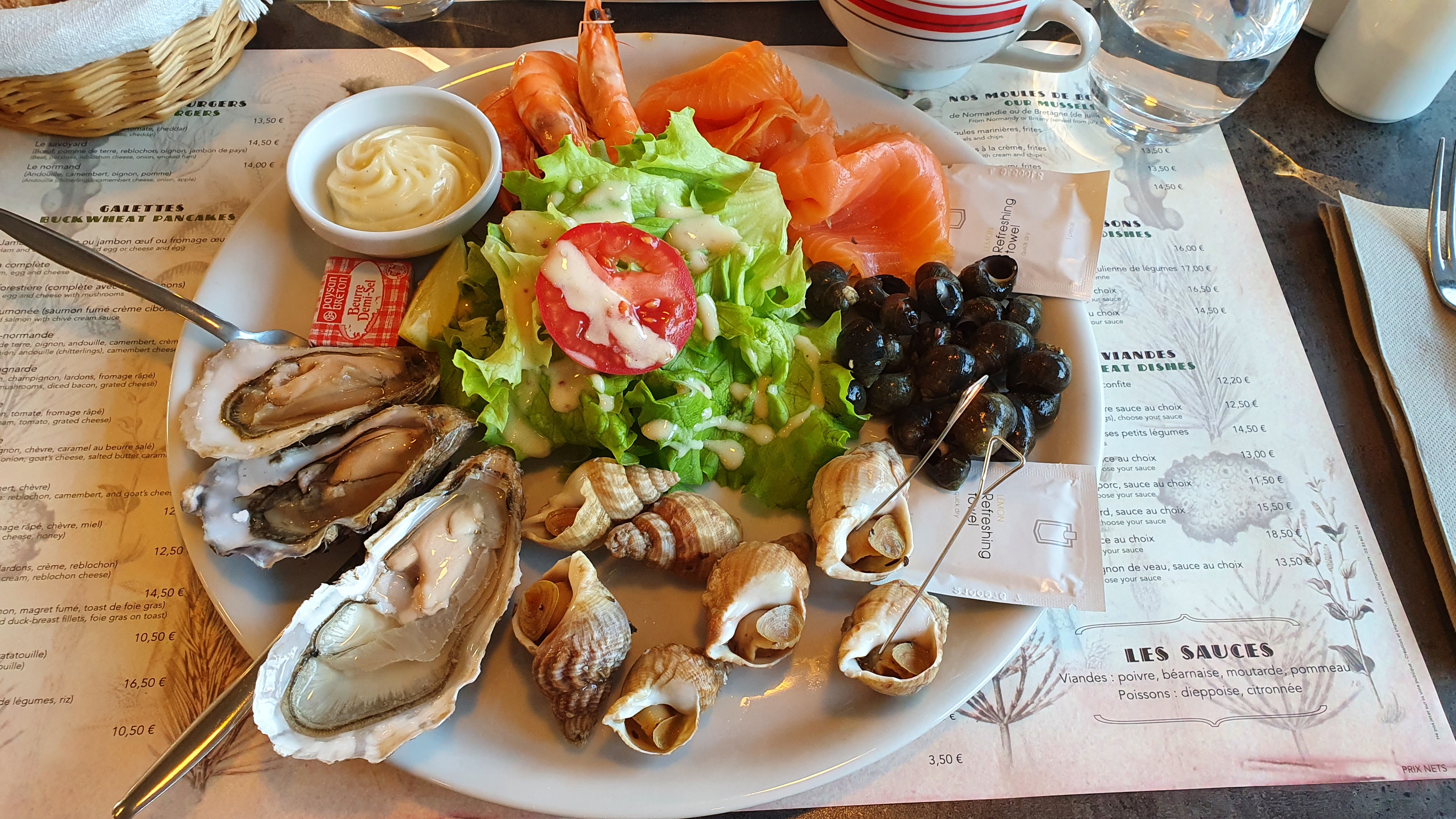 Il était très bien noté et se trouvait à une courte distance du Mont St. Michel, nous sommes donc allés en voiture jusqu'ici et avons obtenu une belle place sur la terrasse (en pleine aire), ce qui était super. Les moules étaient corrects (peut-être pas la meilleure période de l'année) mais nous les avons trouvés trop salés/crémeux et les frites qui accompagnaient nos moules et notre hamburger étaient quelque peu rassis et sans goût. La grâce rédemptrice du déjeuner a été le dessert avec le café gourmand qui a permis de déguster une mousse au chocolat, une pana cotta, une crème brûlée, un petit gâteau au coulis de framboise, etc.