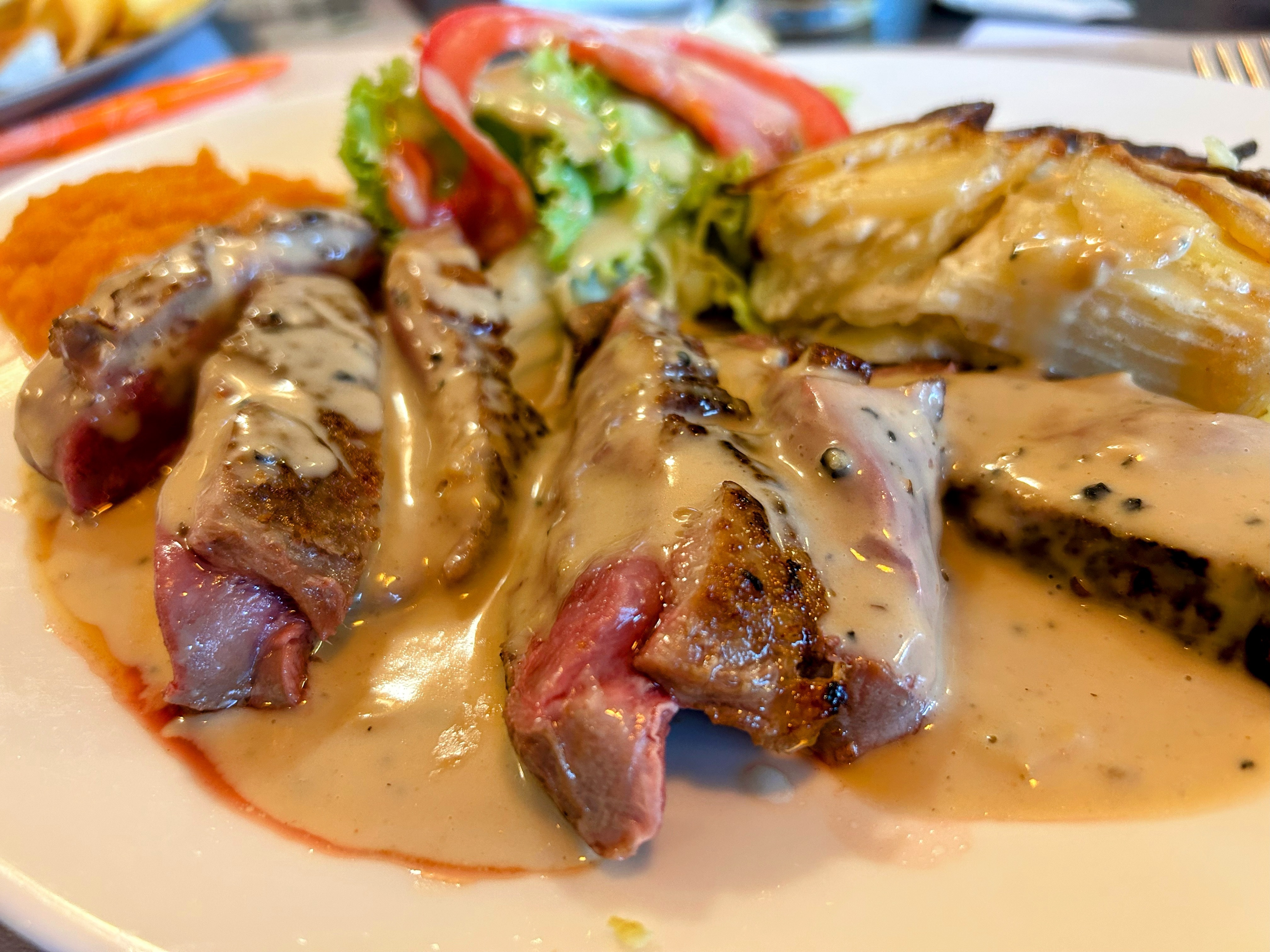 Un solide 4 - tous les plats étaient très bons. Le bœuf était un peu moelleux, la crème brûlée était bonne, donc 4 étoiles. Bon prix et la portion était bonne.