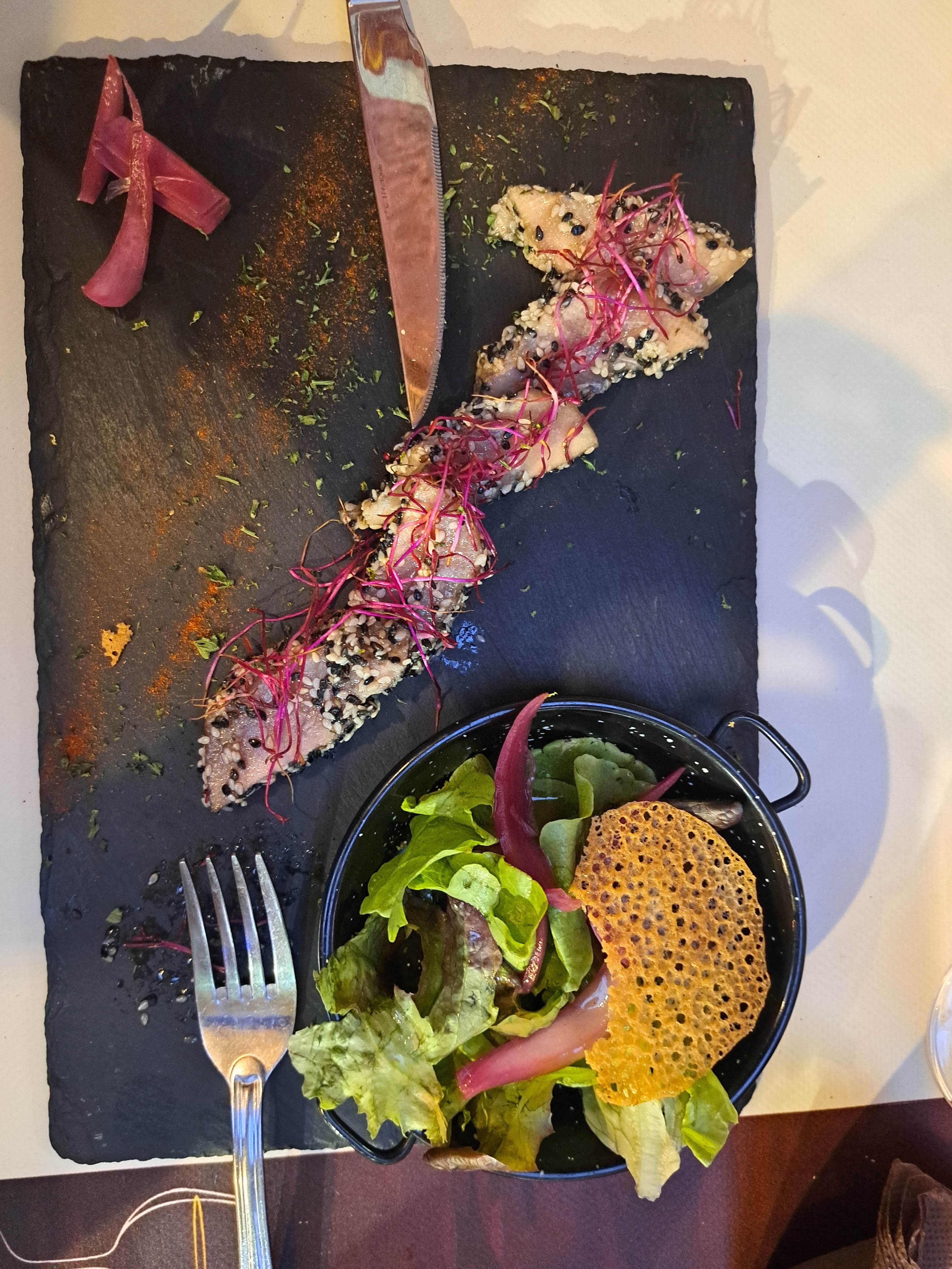 J’ai mangé un steak de thon à 25€. Il était très gros et bon. Par contre, mes amis ont mangés des moules et elles étaient fermées et pas cuitent. Merci.