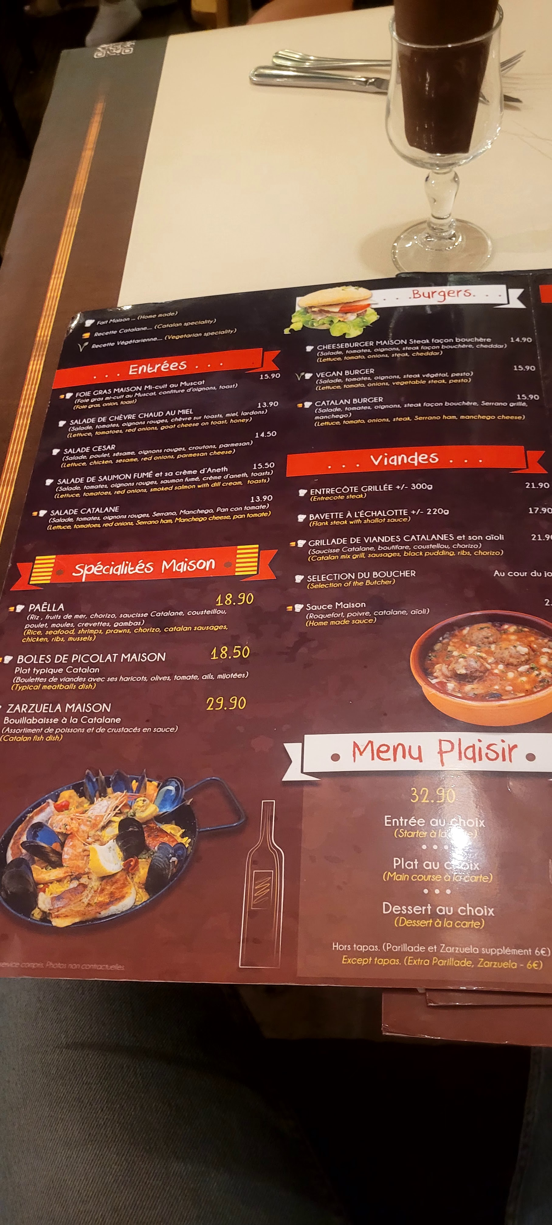 Accueil très bien, les plats sont variés et bons mais la note est très (trop ?) salé (97,80 € pour trois) pour des produits que l'on pourrait soupçonner d'être du décongelé. Bref vous l'aurez compris, la note ne vaut absolument pas la chandelle. On a été tenté par des spécialités catalanes, il aurait mieux fallu manger une simple pizza, on aurait aussi bien mangé pour bien moins cher.