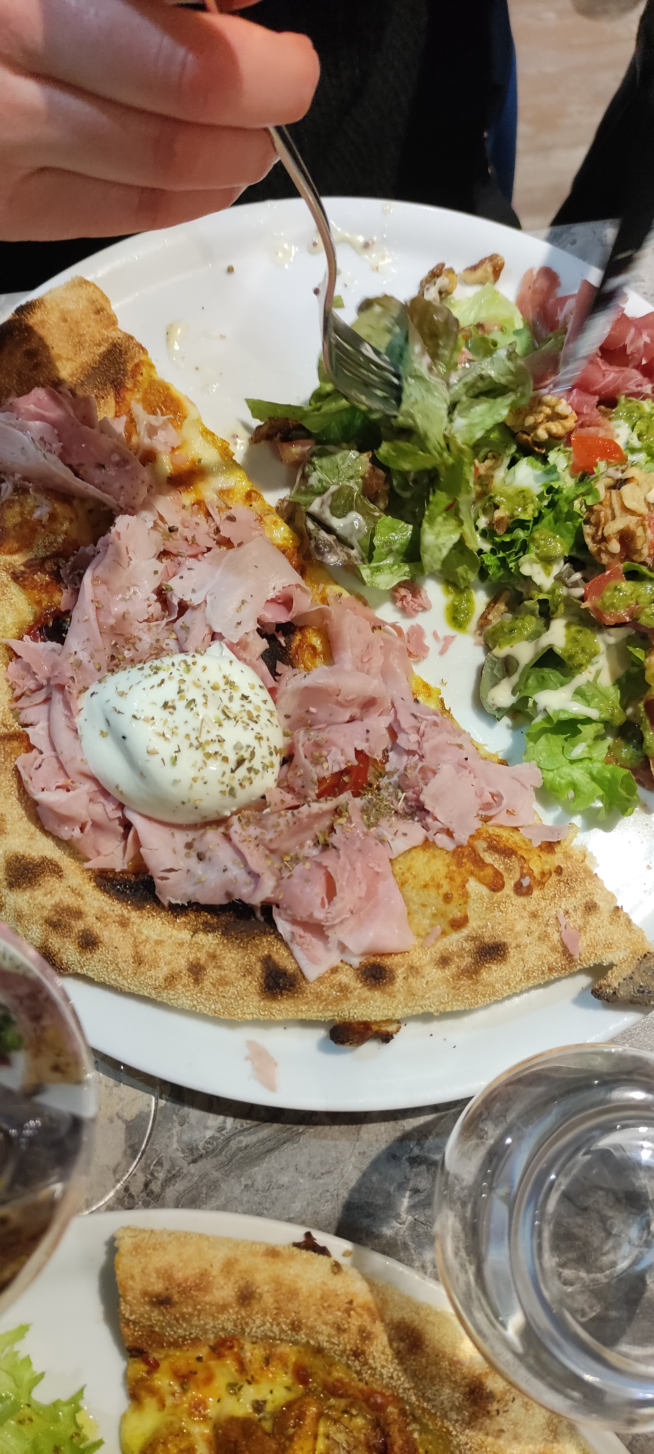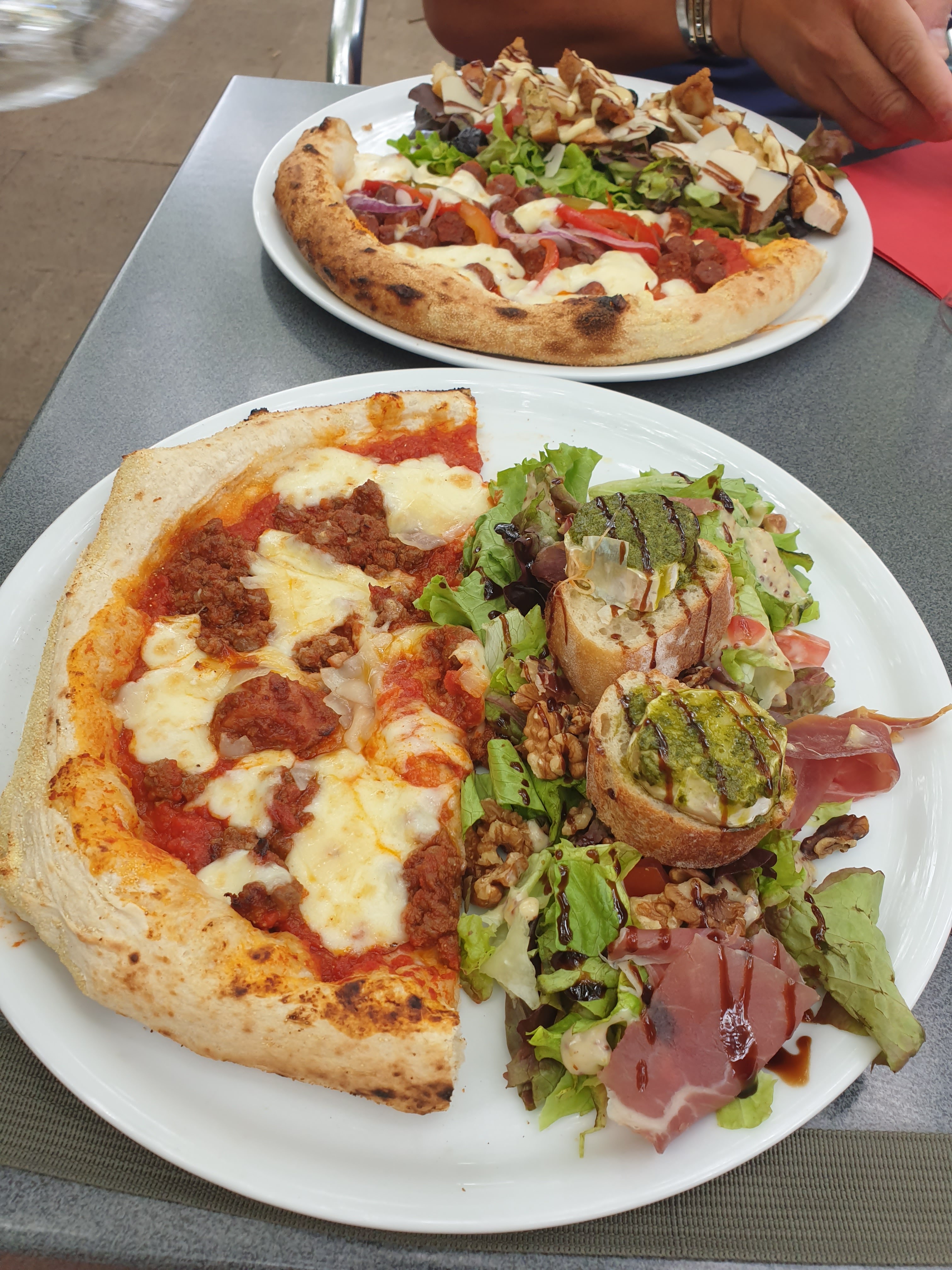Nous avons déjeuné de deux excellentes pizzas avec une pâte extraordinaire et accompagnées d'un verre d'un très bon Croze Hermitage . Tout ça pour un prix très raisonnable.