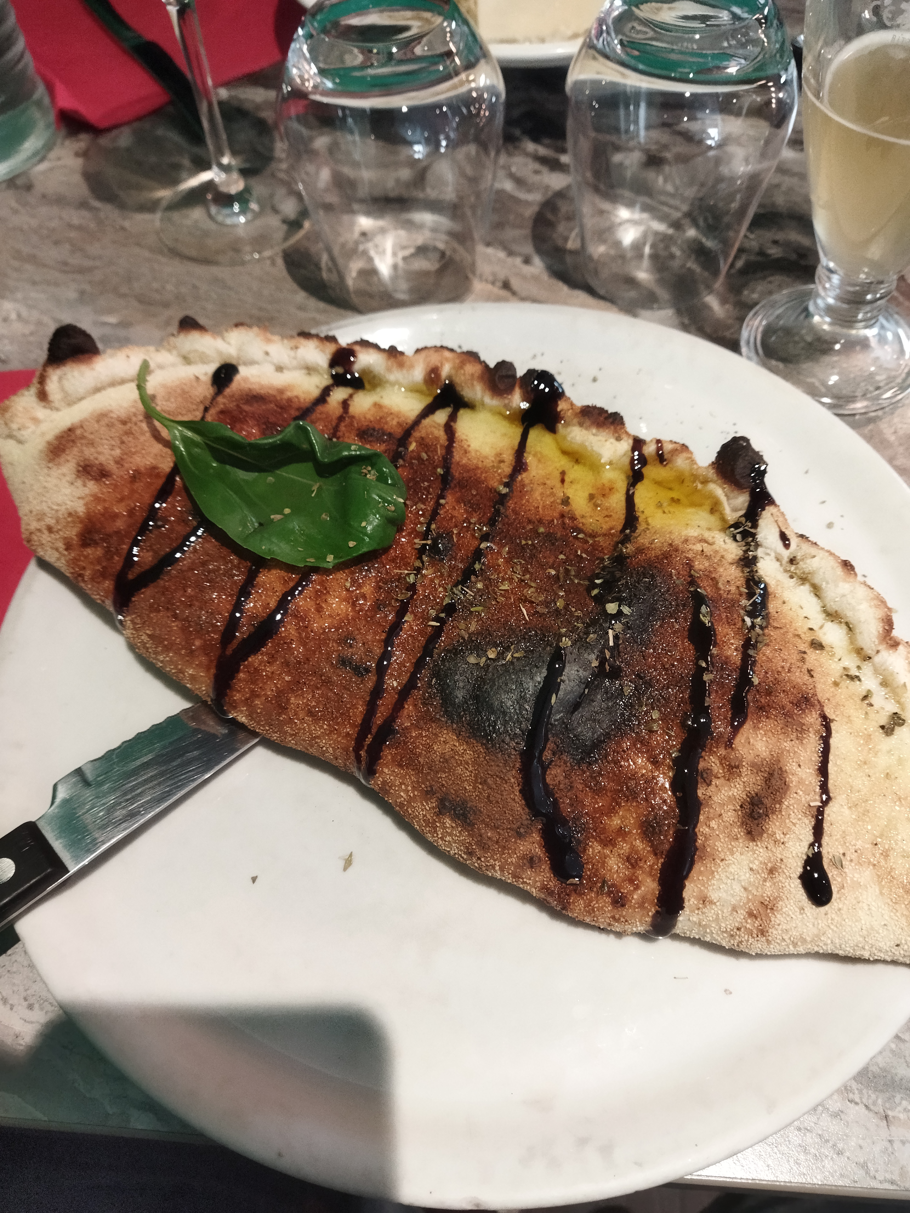 Pizza pas assez cuite . Froide à l'intérieure. (Calzone). Personnel novice à la cuisson au feu de bois. Nous avons eu très froid dans la salle .