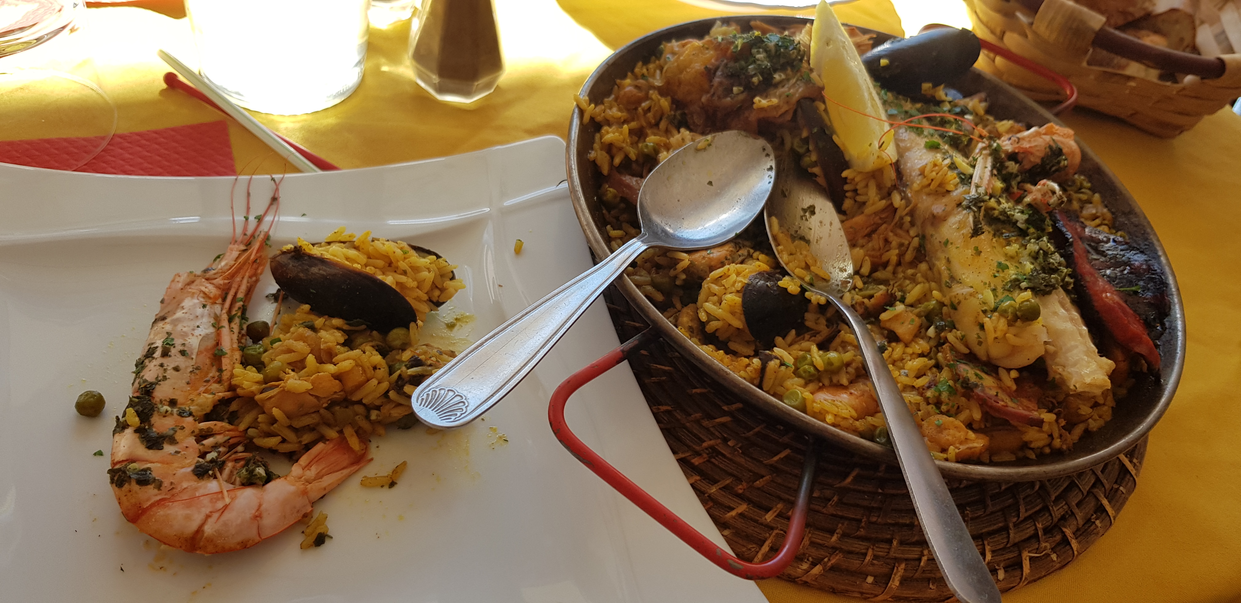 Paella trop copieuse pour un être humain normalement constitué. Point positif : nous a proposé une boîte pour le surplus. Point négatif : me faire engueuler quand je fais remarquer que j'ai demandé expressément du rosé alors qu'on m'apporte du vin rouge déjà ouvert (vente forcée ?)