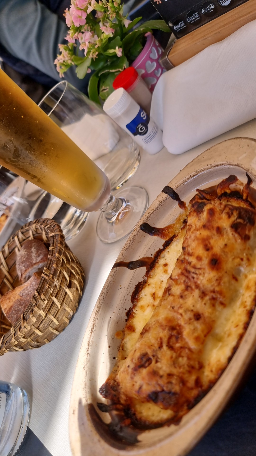 Nous avons choisi de nous installer en terrasse couverte et chauffée de façon a avoir vu sur le canal et la cathédrale, nous n'avons pas eu froid a disposition se trouve des plaids sur les chaises. Ils nous ont proposé une Pizza 🍕 en forme de lapin 🐰 pour notre fille de 8 ans elle a beaucoup apprécié. Avec mon mari nous avons choisi le menu a 27€. La carte est inscrite sur les vitres de la terrasse couverte... J'adore l'idée mais pas évident a lire quand même. Nous choisissons notre entrée et notre plat. Quelques minutes après le serveur reviens pour me dire qu'ils n'ont plus de veau, je suis déçu car je l'avez choisi pour la sauce gorgonzola, il me dis que je peux la garder et choisir une autre viande, je choisis donc la bavette et demande saignement. Nos entrées arrivent. Nous nous sommes régalés. En même temps notre fille reçoit sa pizza 🍕 (pizza carbonara) elle se régale également. Nos plats arrivent... Et la c'est le drame je m'aperçois que la bavette est trop cuite 🙁, je ne dis rien. Je mange la moitié et arrêt car j'aime vraiment pas. Quand il vient récupérer nos assiettes nous lui disons, il s'excuse et nous choisissons nos desserts du menu. Il revient avec 3 coupes de glace en nous disant que pour s'excuser de la cuisson de la bavette il nous offre une coupe de glace. Nous avons passé un bon moment.