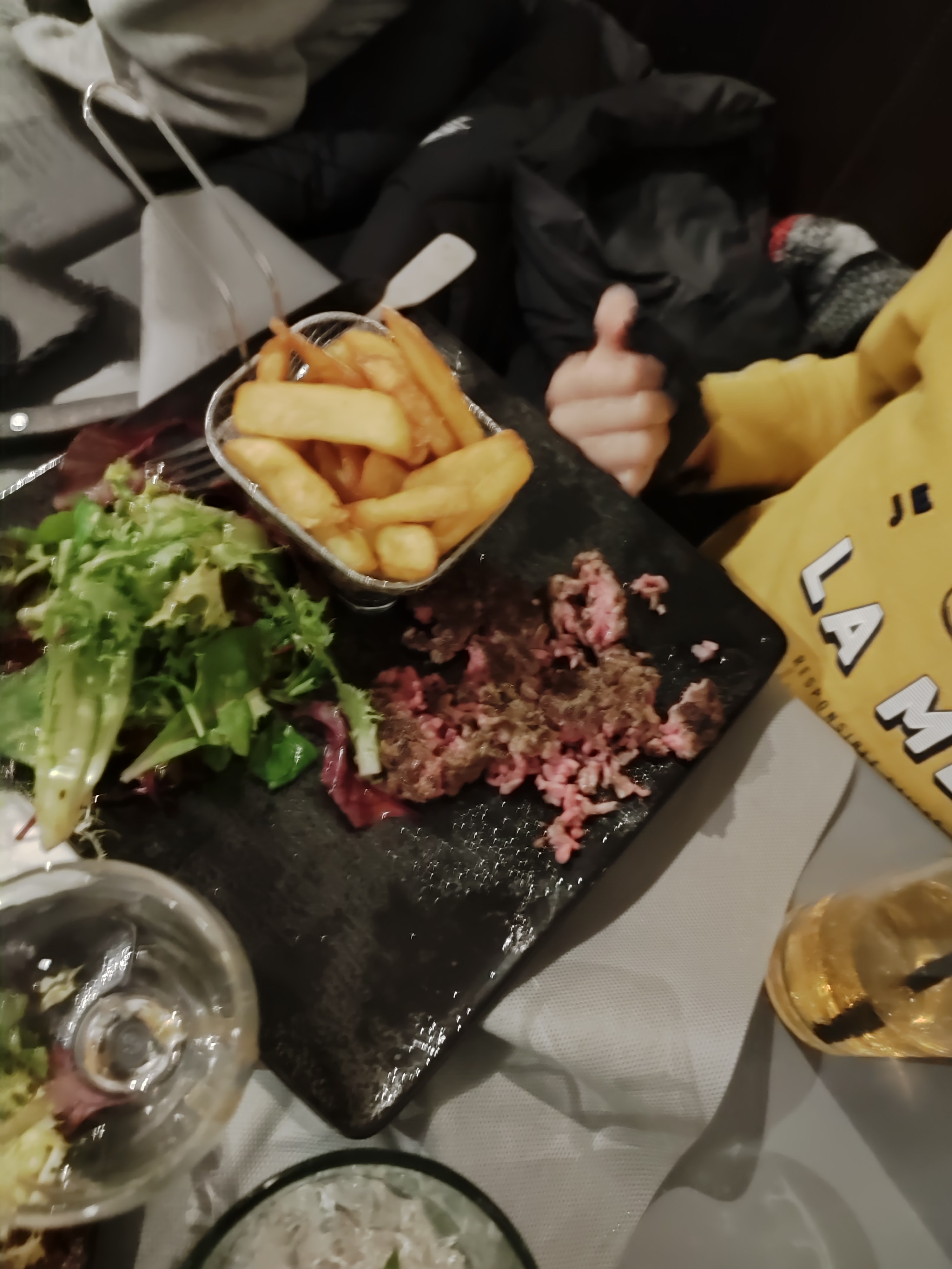 Difficile de donner un avis complet sur la cuisine car, comme nous n'avions pas très faim, nous n'avons pris qu'une planche au camembert chaud accompagné d'une délicieuse charcuterie. Nous avons pris des frites qui étaient bonnes et bien servies (même si j'aurai préféré des frites maison) Cela dit on trouve plus souvent des frites fraîches ou surgelées que des frites maison, ça pourrait être un plus pour cet agréable établissement ! L'ambiance, l'accueil et le sourire du personnel en font un endroit très convivial où l'on se sent bien. On a bien apprécié également le vin chaud et le petit digestif maison. Nous y retournerons ! Les occupants de la table 20, le vendredi 8