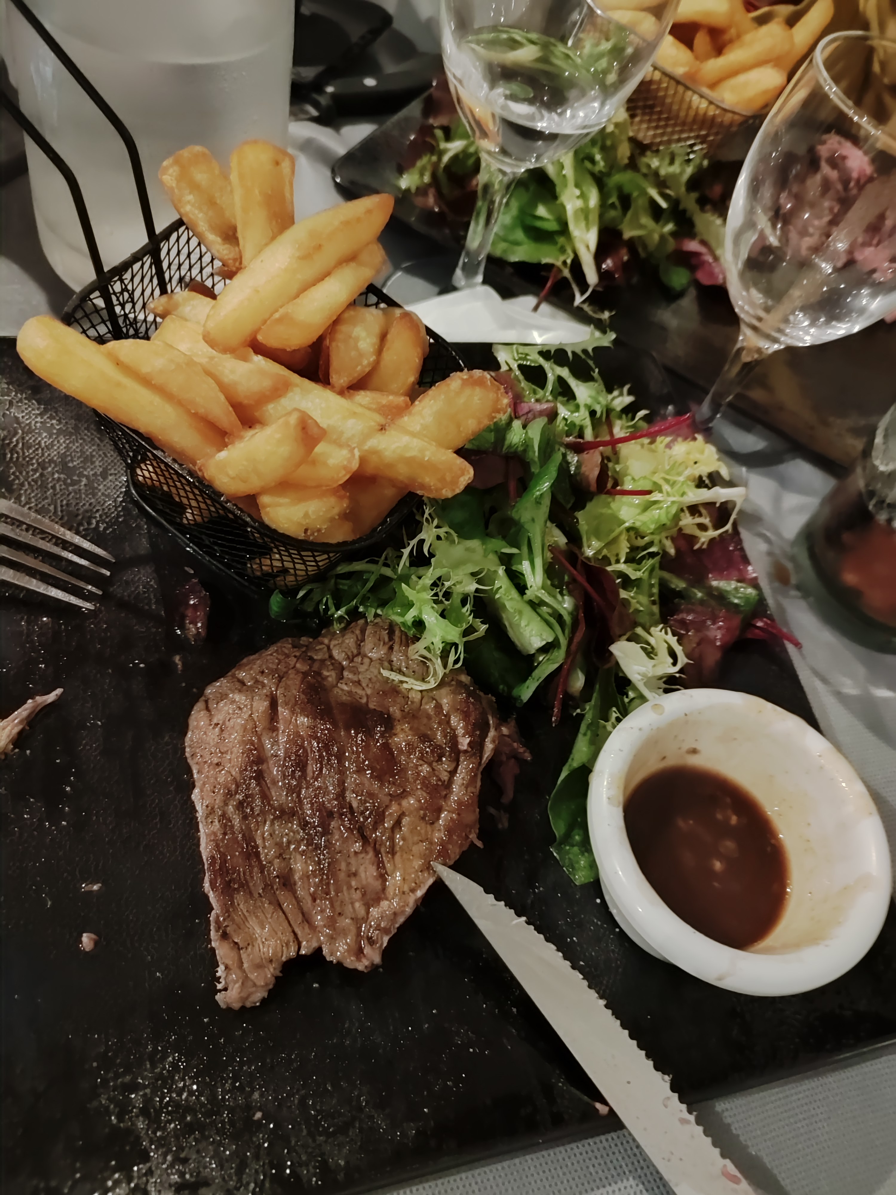 Arrivés à 13h, notre première carafe d’eau arriva à 14h. Les plats principaux sont arrivés avant les entrées, et nous nous sommes sentis coupables de le faire remarquer. Cuissons des plats non respectées, steak saignant arrivé carbonisé (photo) magrets trop cuits, deux plats renvoyés en cuisine. Personnel sans tact et aucune excuse, ni geste commercial. Passez votre chemin si vous souhaitez passer un bon moment.
