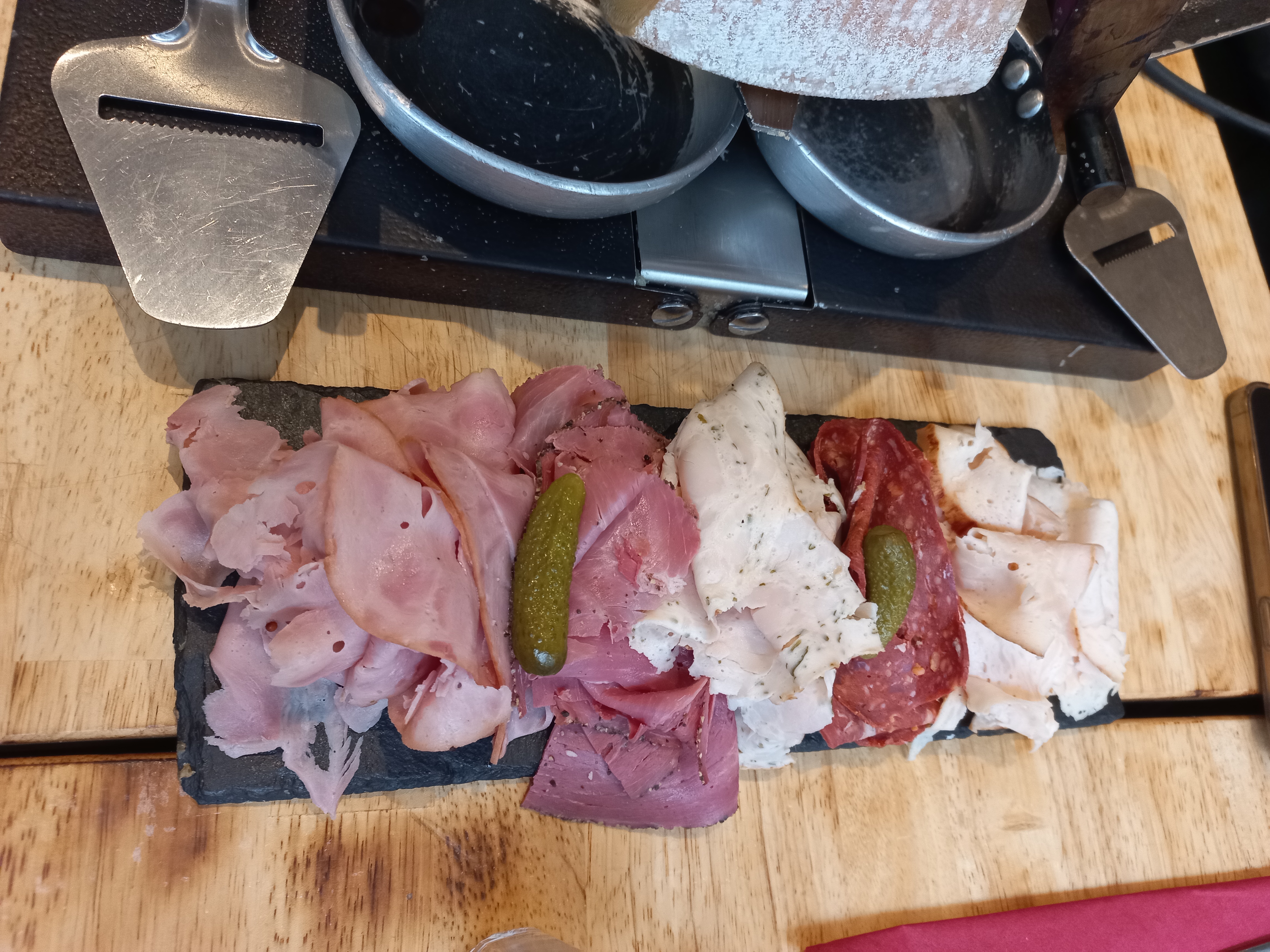La nourriture est bonne, les produits sont frais, la charcuterie aussi même si je trouve que c'est pas mal cher pour ce que c'est et surtout pour le service à volonté .. nous avons demandé de ravoir quelques pommes de terre déjà qu'on a dû attendre 20 min pour que la serveuse croise notre regard ensuite le morceau de fromage qui était assez petit pour 2 personnes je trouve, était en train de brûler, il n'y avait plus rien dedans et personne est venu nous proposer de changer. Assez dommage car quand on voit partout sur les réseaux sociaux la quantité qu'ils donnent et la réalité c'est assez décevant