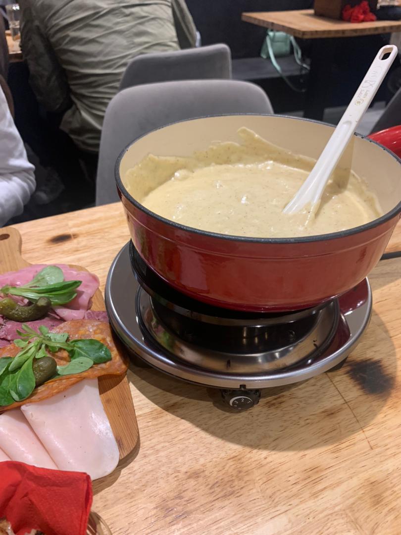 La fondue était pas du tout à mon goût, par contre la raclette juste ce qu'il faut. Le fromage est bon et la charcuterie simple mais bonne. Une serveuse pour l'installation et le service avec les forte demande du au service à volonté, je trouve ça dure pour elle mais surtout ça rallonge l'attente pour.. la carte des dessert devrait être plus légère et varié.. parce qu'après une repas assez lourd finir par une note sucré lourde ce n'est pas possible. Mettre des fruit ou des dessert léger type mousse au chocolat, salade de fruit, pavlova, glace, ou autre serait mieux