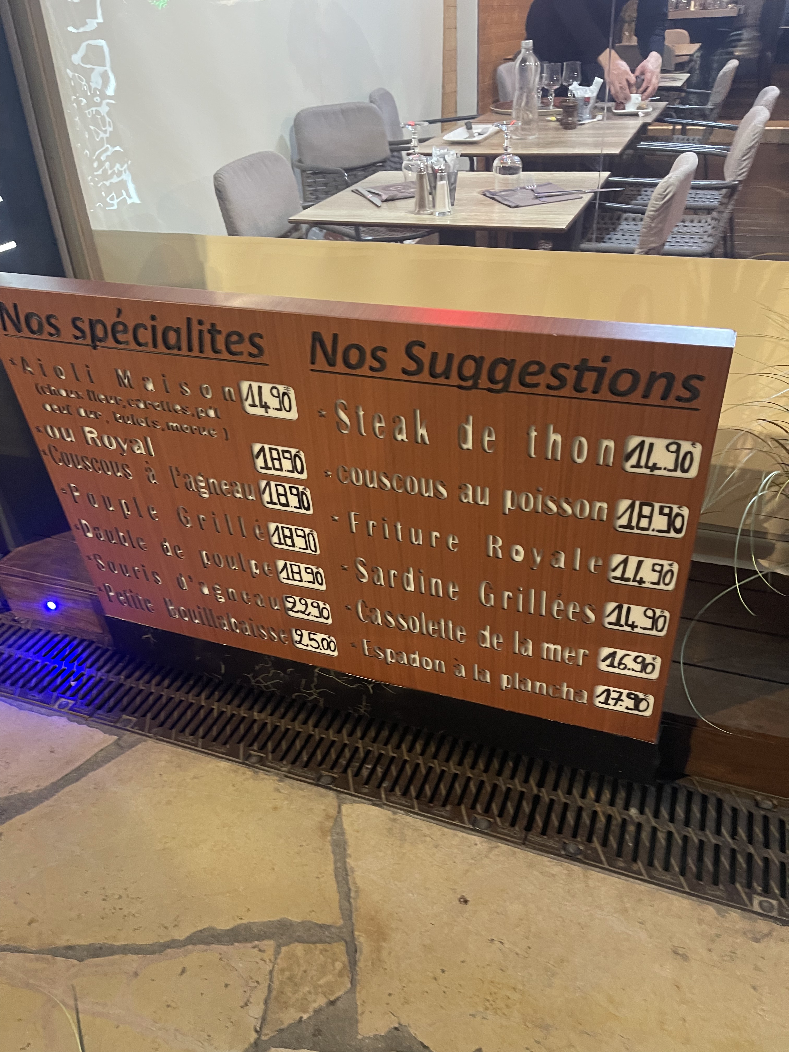 Clients le 5/09/20 nôtre choix de ce restaurant a été très judicieux. Choix assez important. Moi coucous agneau, très très bon et copieux 18€. Mon amie petite bouillabaisse très bonne et copieuse 23€. Service au top. Je conseille fortement nous y retournerons sans problème.