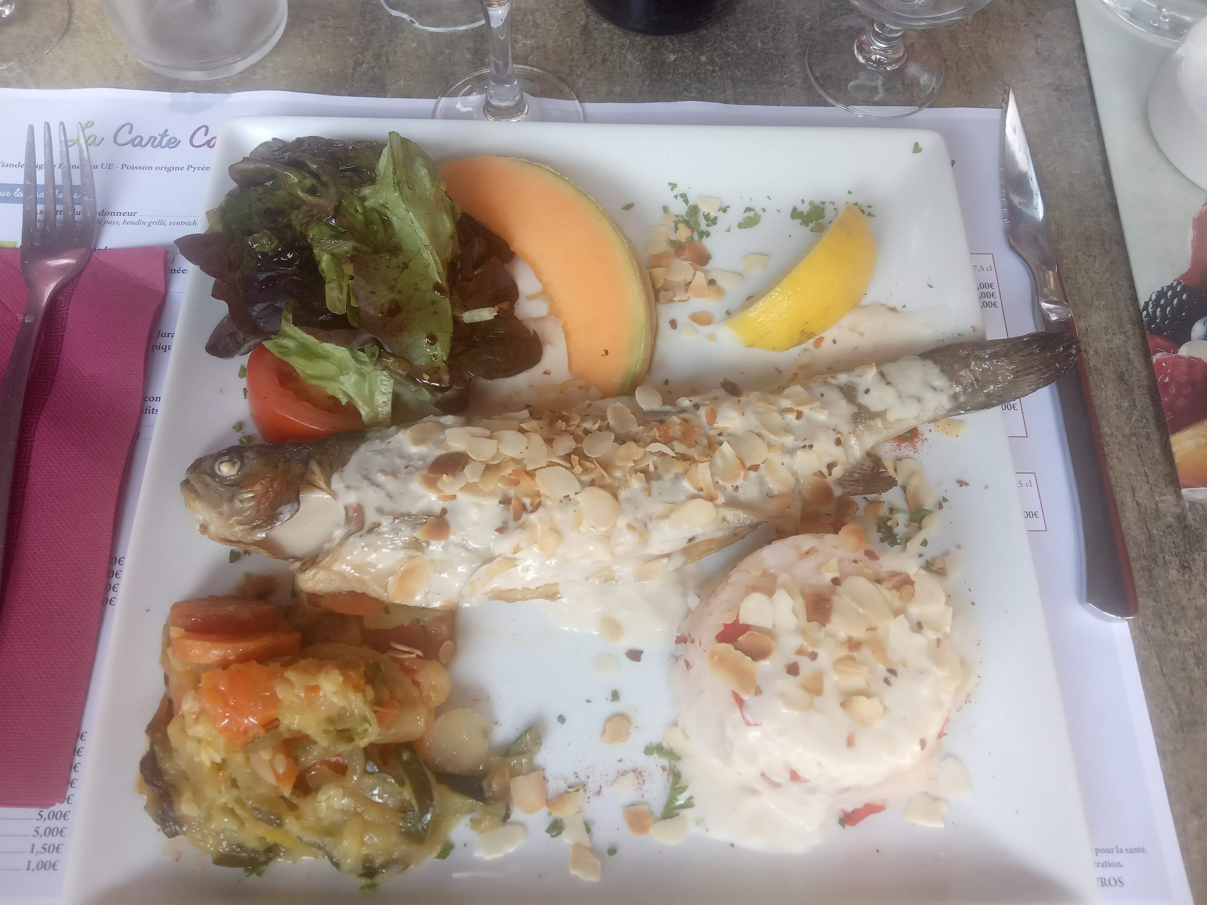 Super resto... Des plats à tomber par terre ... Super accueil Mon fils est tombé sous le charme d'Iris magnifique berger des Pyrénées Du coup on revient en août J'attends ma truite aux amandes avec impatience