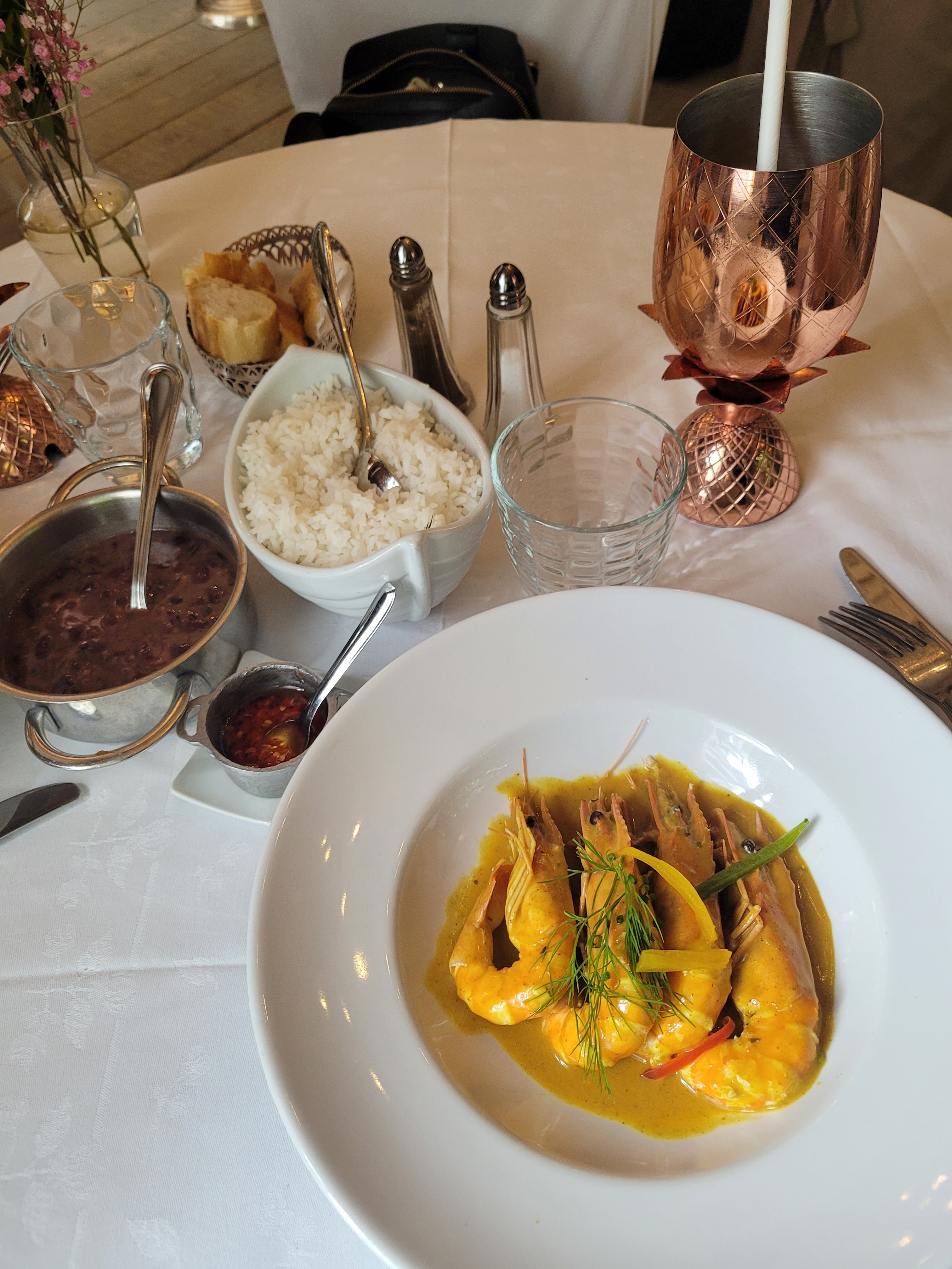 Cadre magnifique, mais cuisine insipide, sans subtilité ni âme. Poissons trop cuit, 4 grosses crevettes caoutchouteuses à 38€, sauce basique trop liquide, haricots rouges surcuits là encore baignant dans l’eau. Dommage. Dans cette gamme de prix, nous nous attendions à un niveau bistronomique, semi-gastronomique. Peut-être faut-il prendre un simple poulet ou une souris d’agneau.