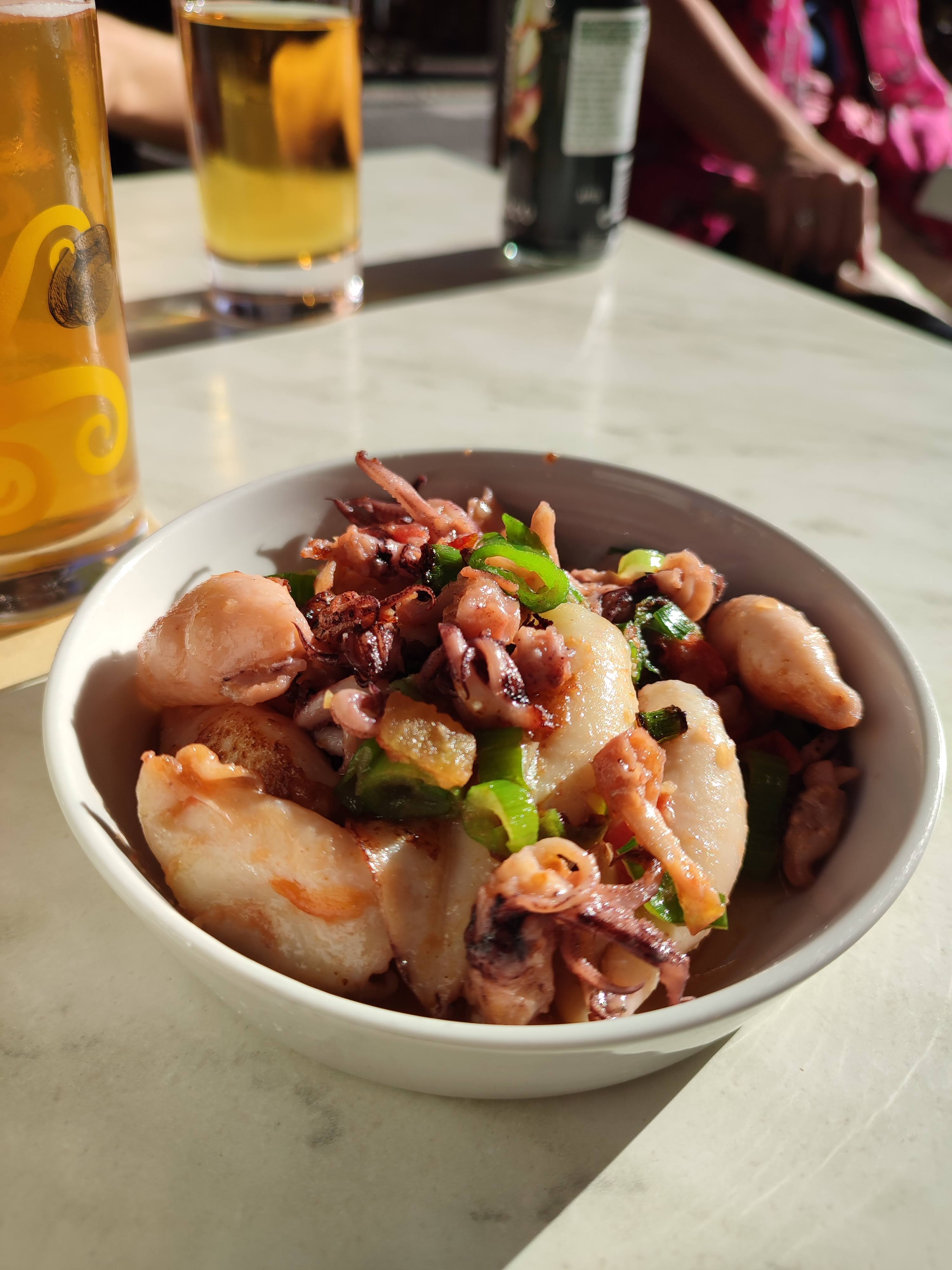 Nous avons commandé quelques tapas telles que du ceviche et des calamars, au goût extrêmement désagréable, comme vous pouvez le voir sur la photo, il y avait de minuscules morceaux de poisson dans cette sauce extrêmement aigre qui avait un goût désagréable. Les calamars étaient inexistants, ils étaient censés être amis dans une pâte mais c'était juste de la pâte, je ne recommande cet endroit que pour prendre un verre. Le personnel était sympathique.