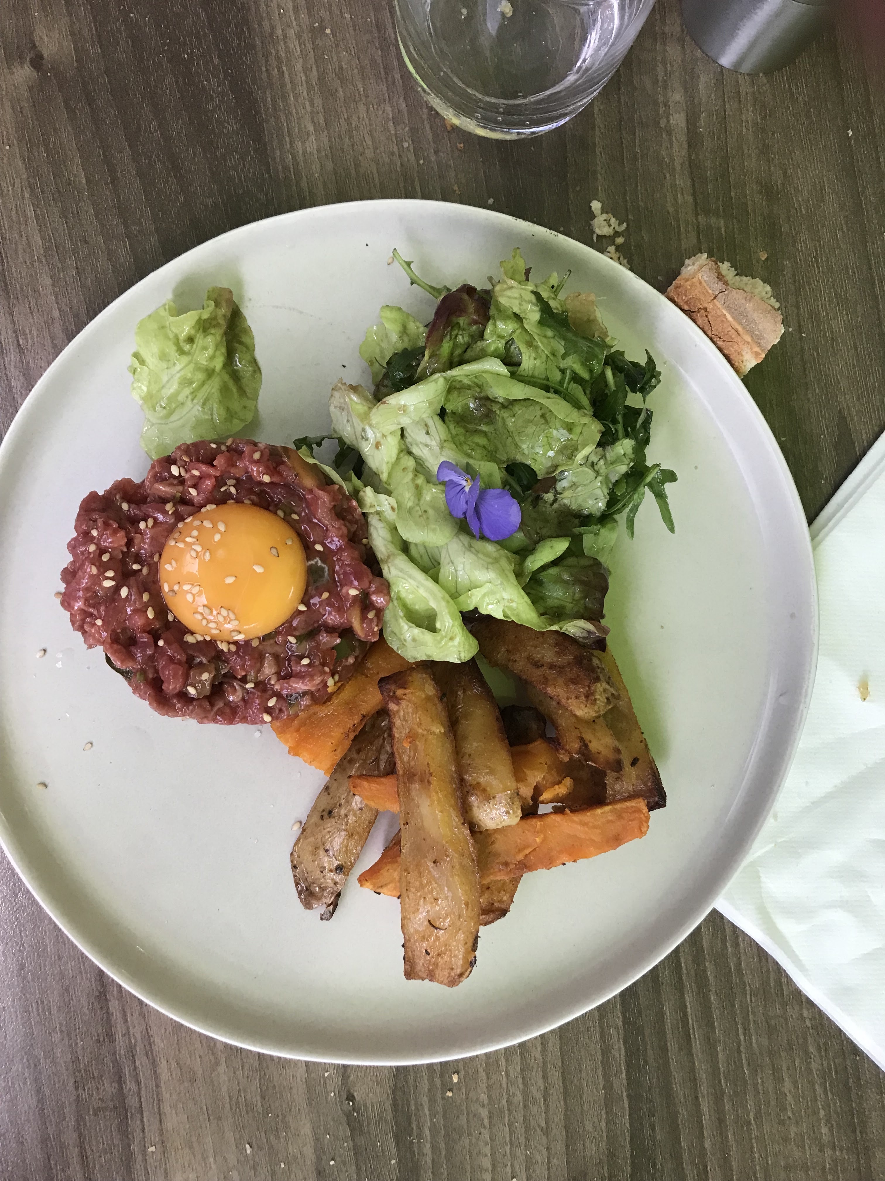 Cela pourrait être dû à des attentes trop grandes. Mais les prix auxquels ils servent leur nourriture nous font croire que nous allons manger mieux que ce que nous avons fait. La nourriture était correcte, peut-être pas épicée à mon goût. Peut-être manque-t-il d'originalité, peut-être que c'est aussi mon choix qui était des couteaux en entrée, c'était vraiment bon, qu'un classique onglet de bœuf qui était correct, assez savoureux mais servi trop froid. Les choses étaient en cours, nous poussant toujours à commander la prochaine chose et à partir. Nous avons demandé un verre de vin avec l'entrée, nous avons fini l'entrée avec de l'orge et les verres n'étaient même pas à moitié vides et la dame dit (citation libre) : nous vous apportons à manger, vous voulez commander un rouge avec votre nourriture MAINTENANT sinon je ne le fais pas. Je n'aurai pas de temps pour toi plus tard. Rend toute l'expérience, même la meilleure, un peu... mauvaise. À la fin, deux verres d'Apero, deux entrées et plats principaux avec un verre chacun coûtaient 100 euros. Trop pour ce que nous avons vécu. Encore une fois, je suis vraiment déçu de mon expérience. Encore une fois, ce n’était pas si mal, c’était juste décevant. J'espère y aller cet été pour leur donner une chance de plus et découvrir la terrasse.
