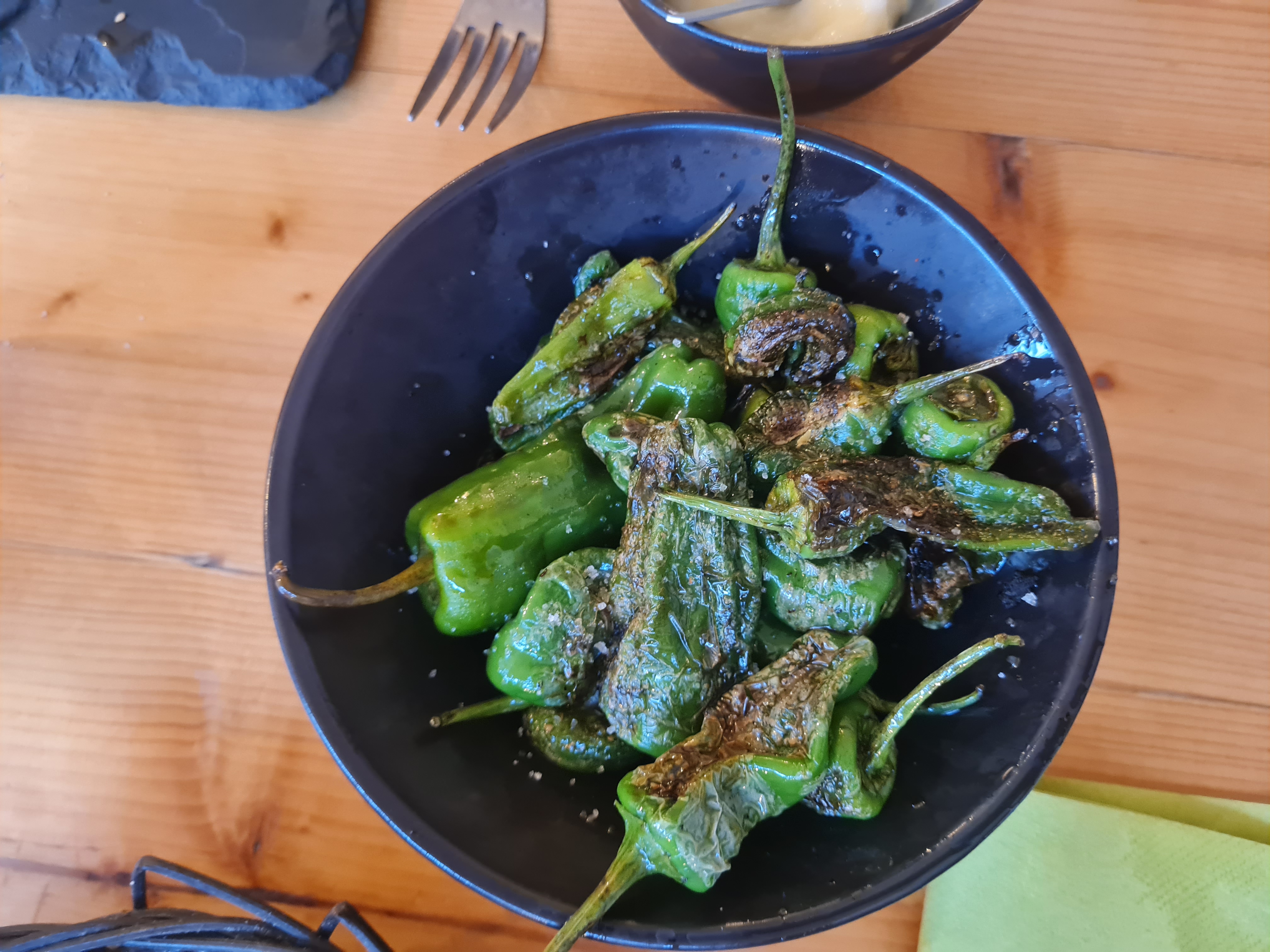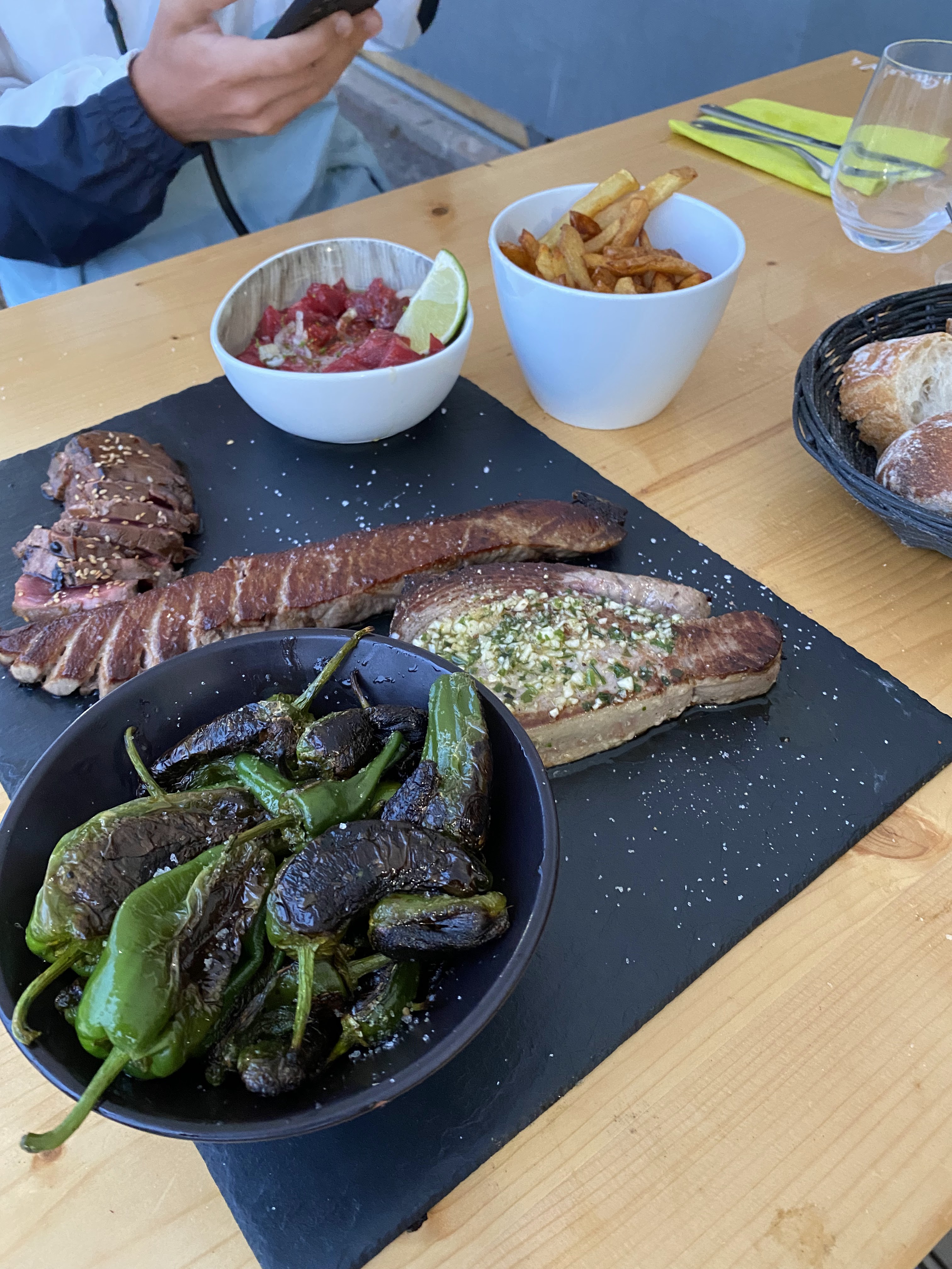 Un plaisir pour les papilles, nous avons pris la planche royale de thon rouge à partager pour goûter toutes leurs spécialités : Tataki, tartare, en steak , ventreche, le tout accompagné de frites fraîches avec sauce aïoli, et ces poivrons de padron à la plancha quel délice !