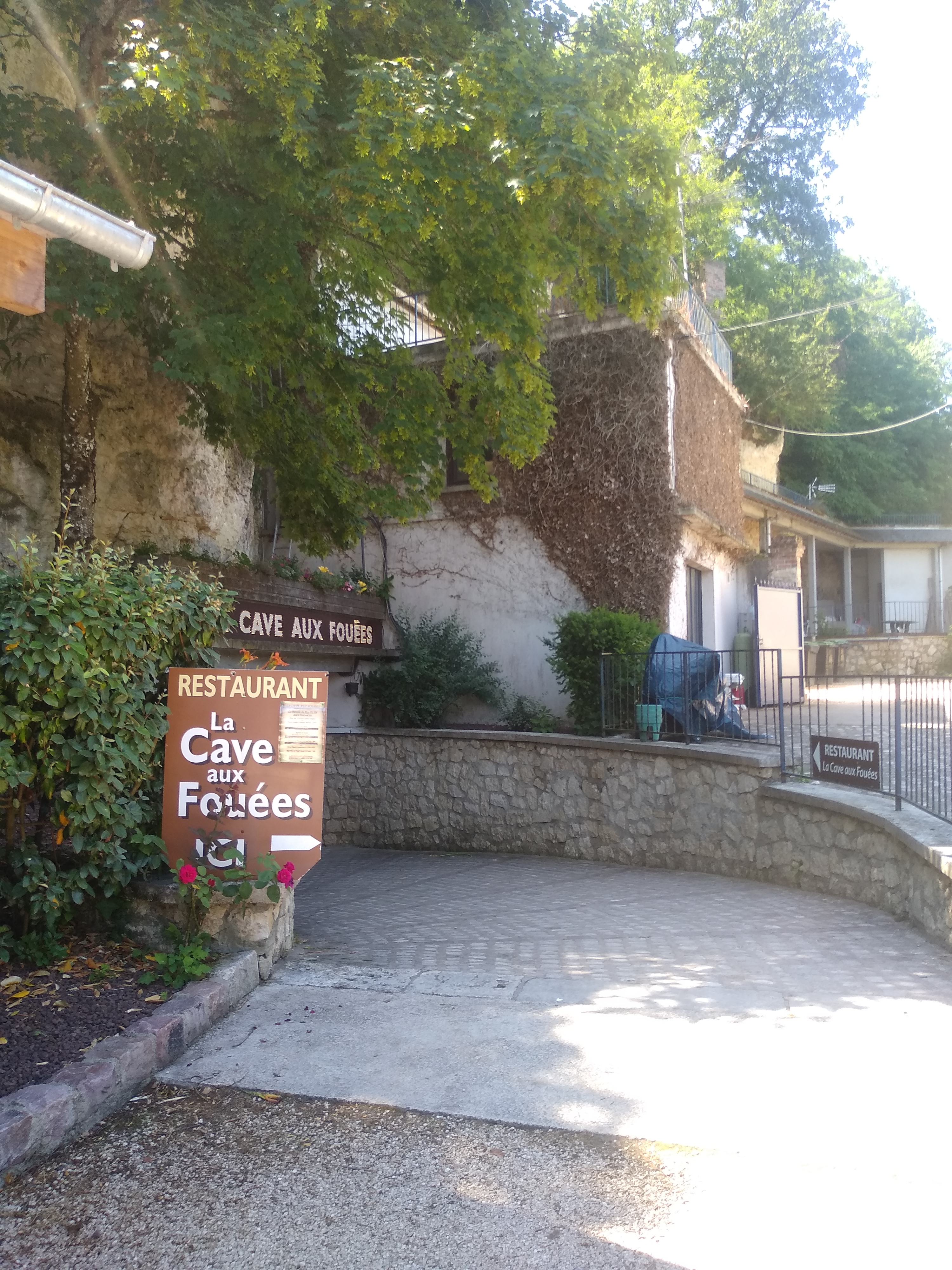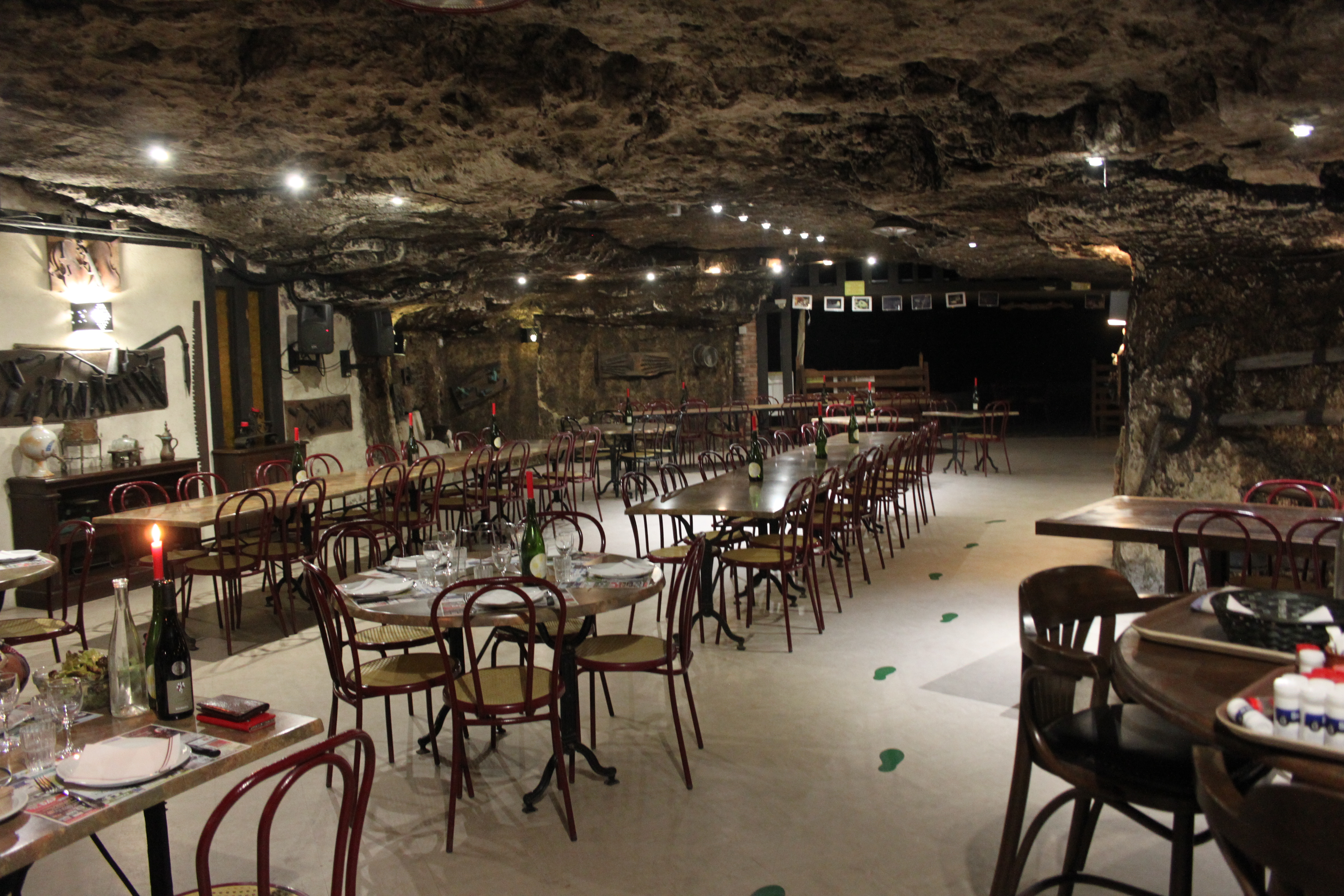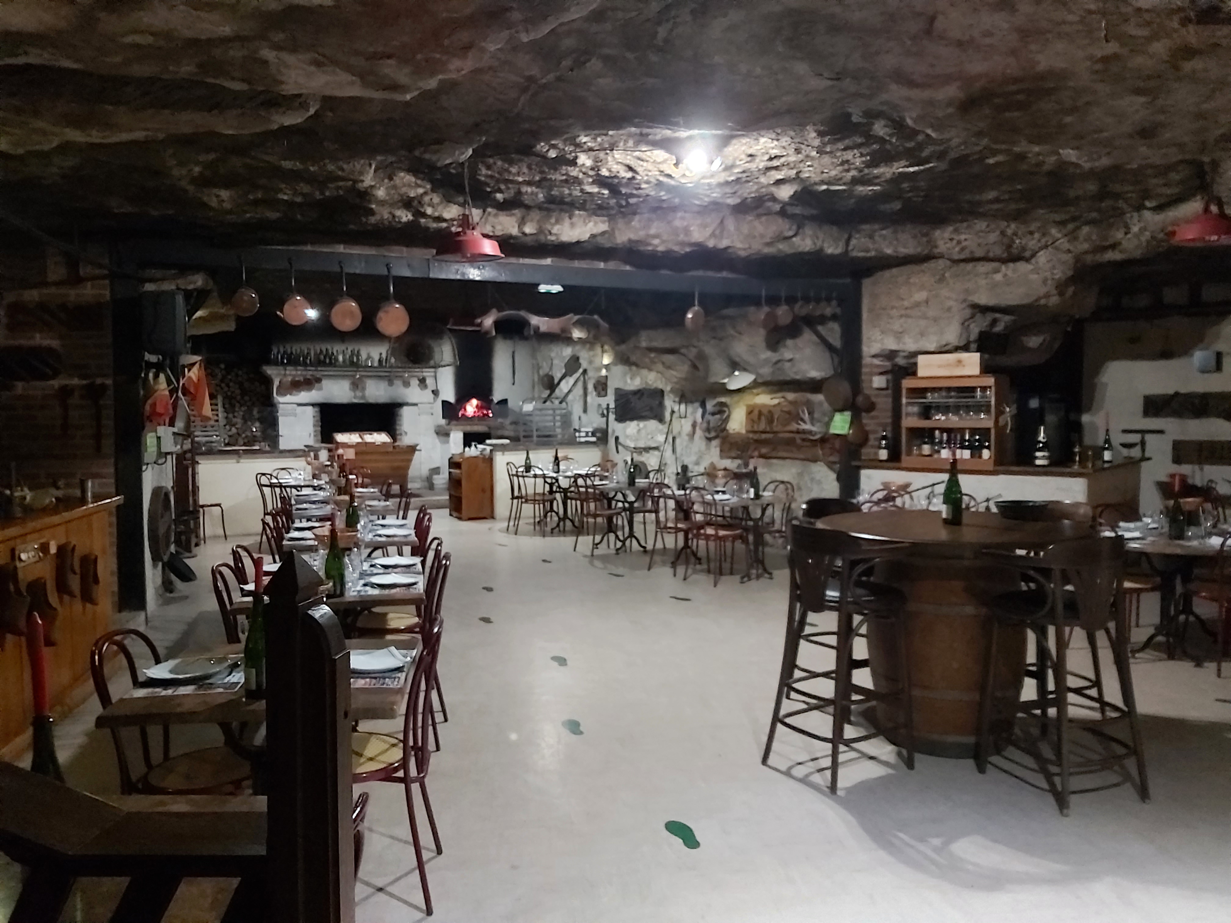 Restaurant insolite, sombre (qui fait parti de l'ambiance), éclairé par des bougies sur les tableau et quelques ptites lumière suspendues. où l'on mange avec 24m de roche au dessus de la tête. Et dont la spécialité est le Fouées, petits pain cuits au feu de bois, accompagnés d'une assiette de rillette et de lard. Un plan unique qui change régulièrement mais qui reste dans la cuisine traditionnelle.