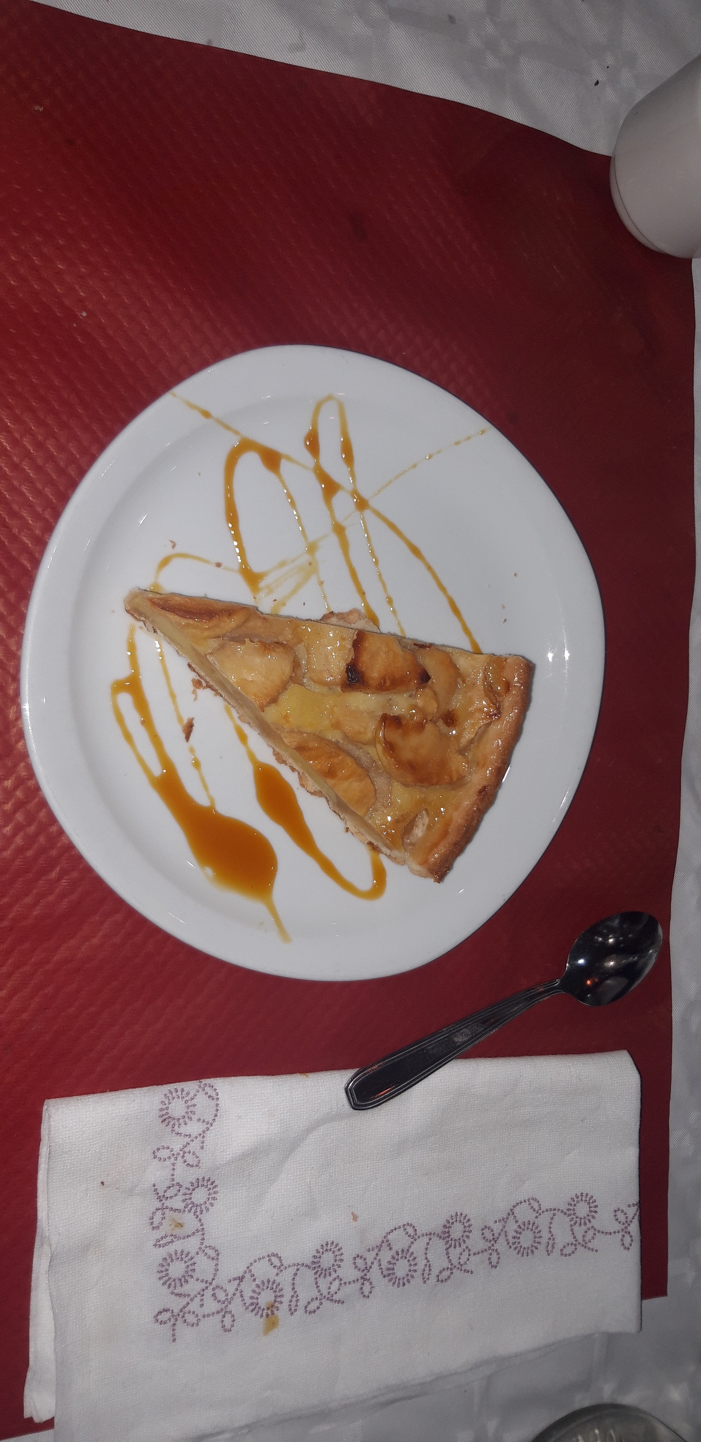 J'ai trouvé la cuisson des fouées très irrégulière, les premières et d'autres plus tard n'étant pas levées. Le repas est copieux; le vin est bon. Pour la tarte je trouve qu'elle manque de cuisson et donc de couleur et de croquant. Moyen!