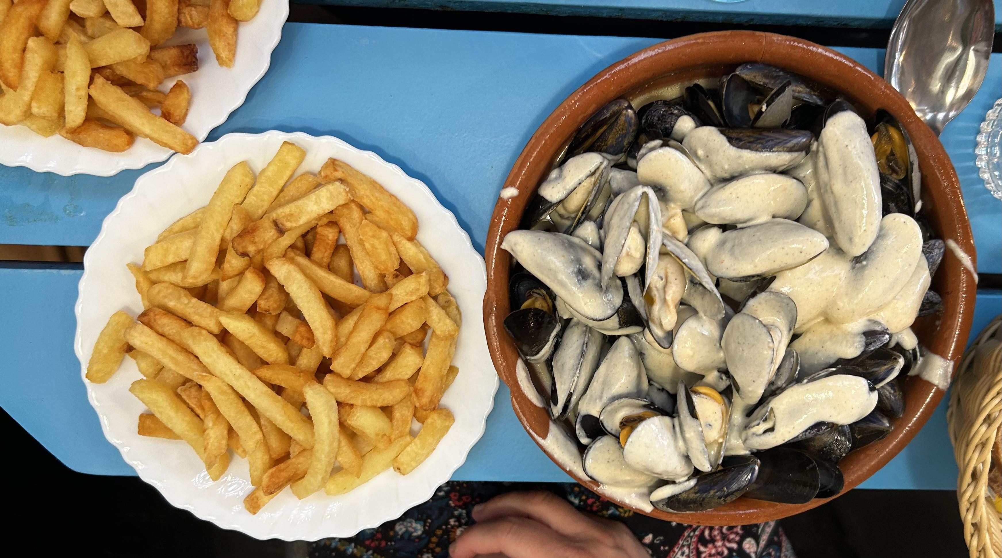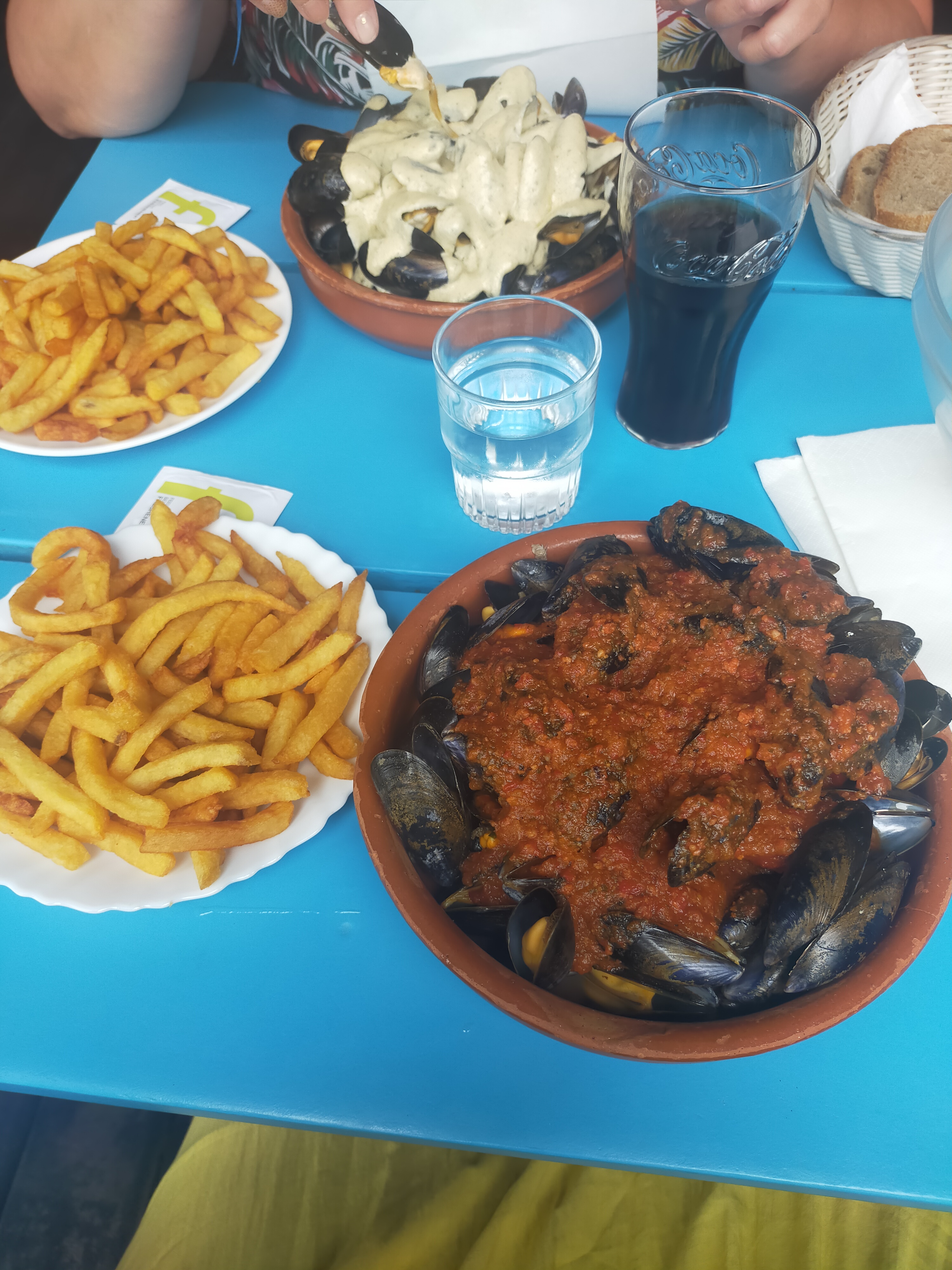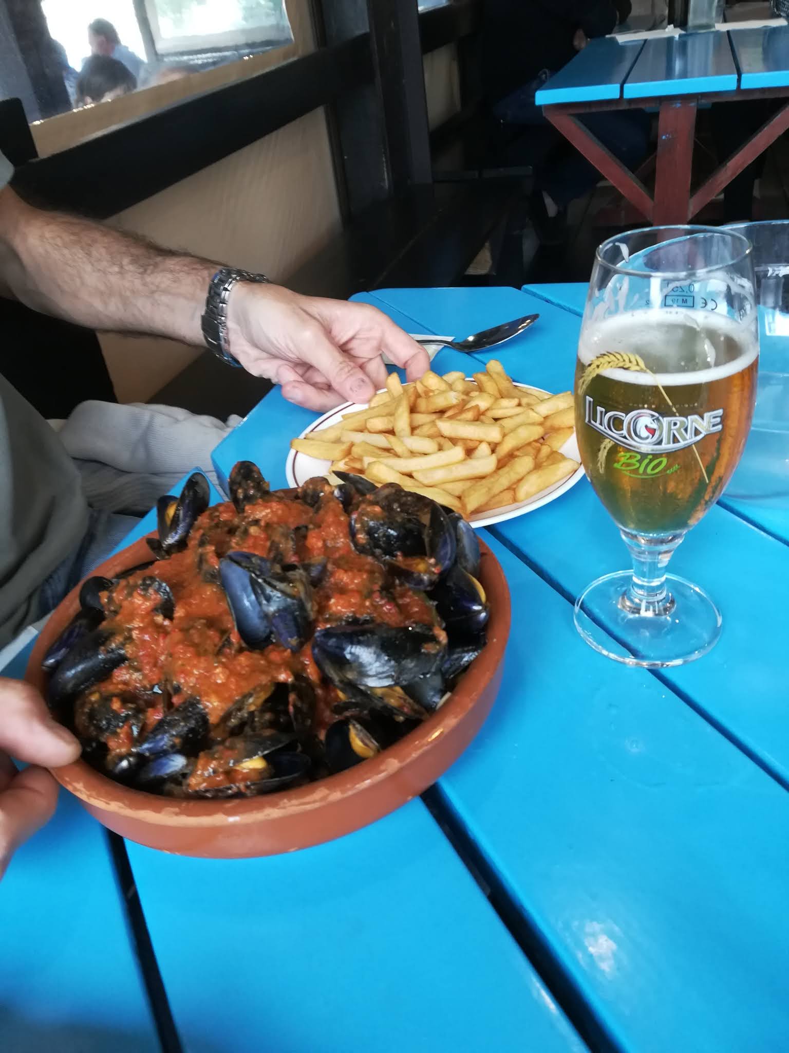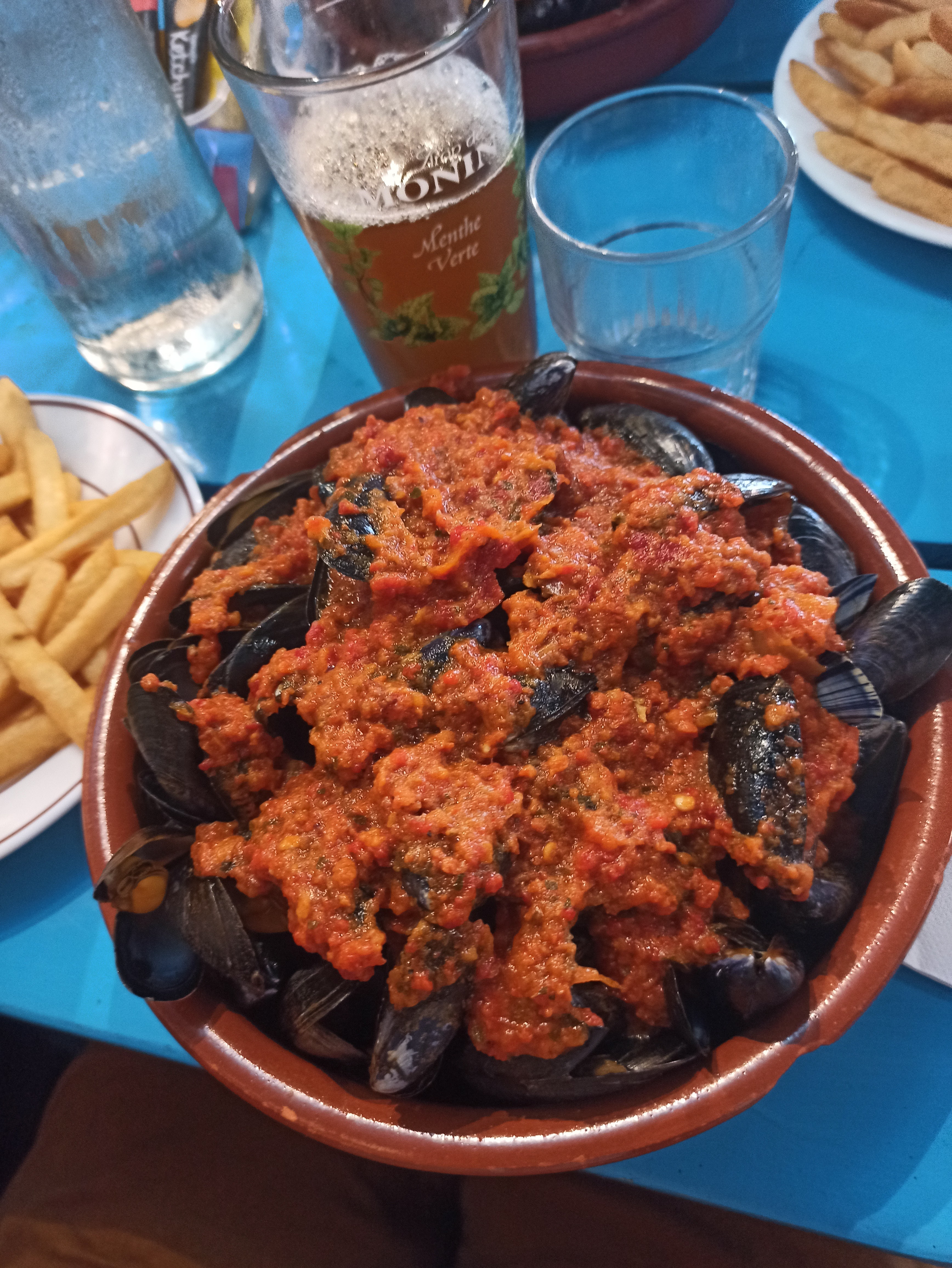 Moules bien charnues & goûteuses et 100 % moules même les pizzas avec garniture qui aurait mérité une vrai pâte maison et pas un disque a passer au four. Service rapide et lieu conviviale avec une déco typique.
