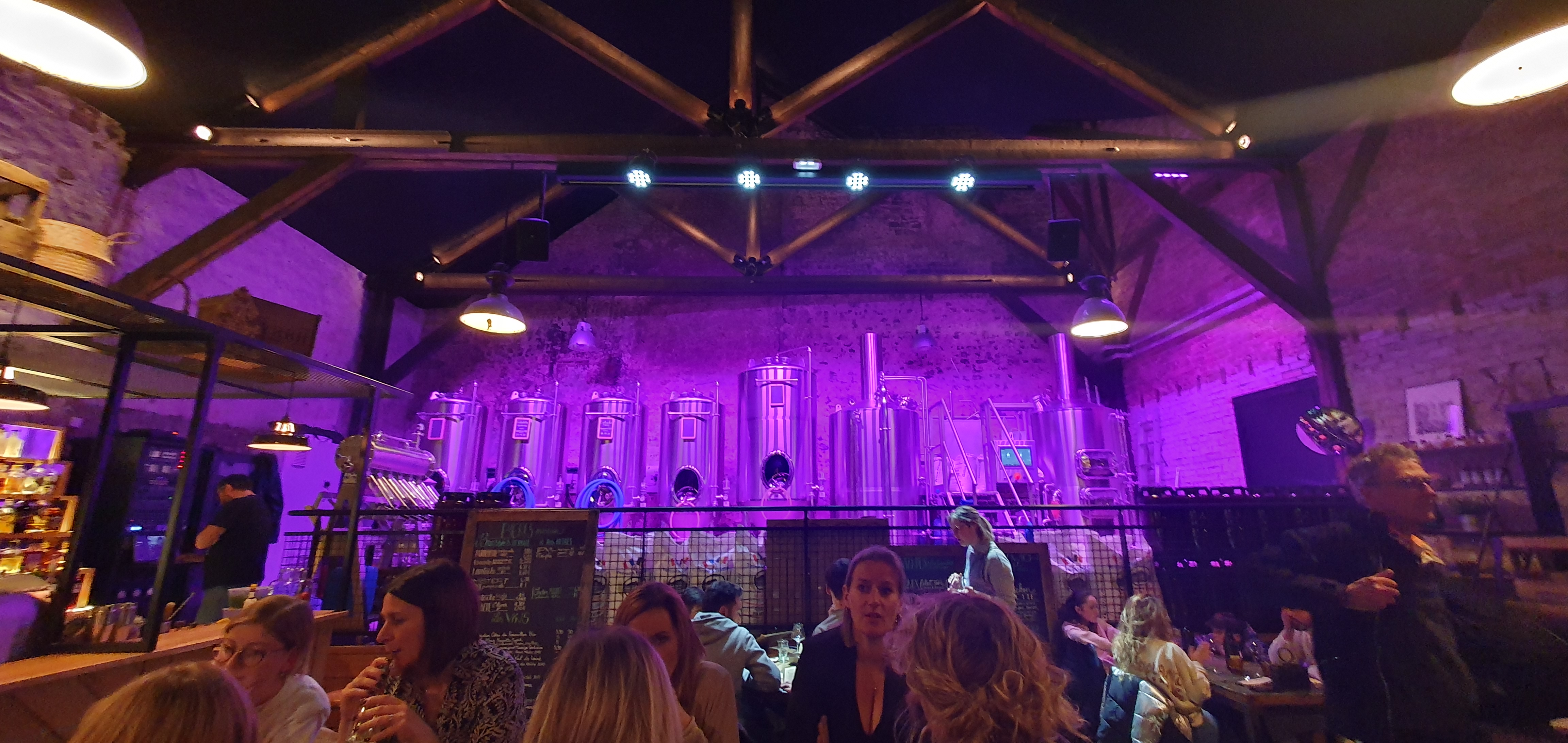 Un lieu improbable dans une cour au fond d'un bar très populaire, la sérénité de l'endroit tranche avec l'ambiance survoltée du bar, la déco est magnifique avec sa micro brasserie éclairée en bleu-violet , ses murs ornés de déco sur le même thème, des tables à l espacement généreux qui permettent de se côtoyer sans se déranger, un endroit à part.