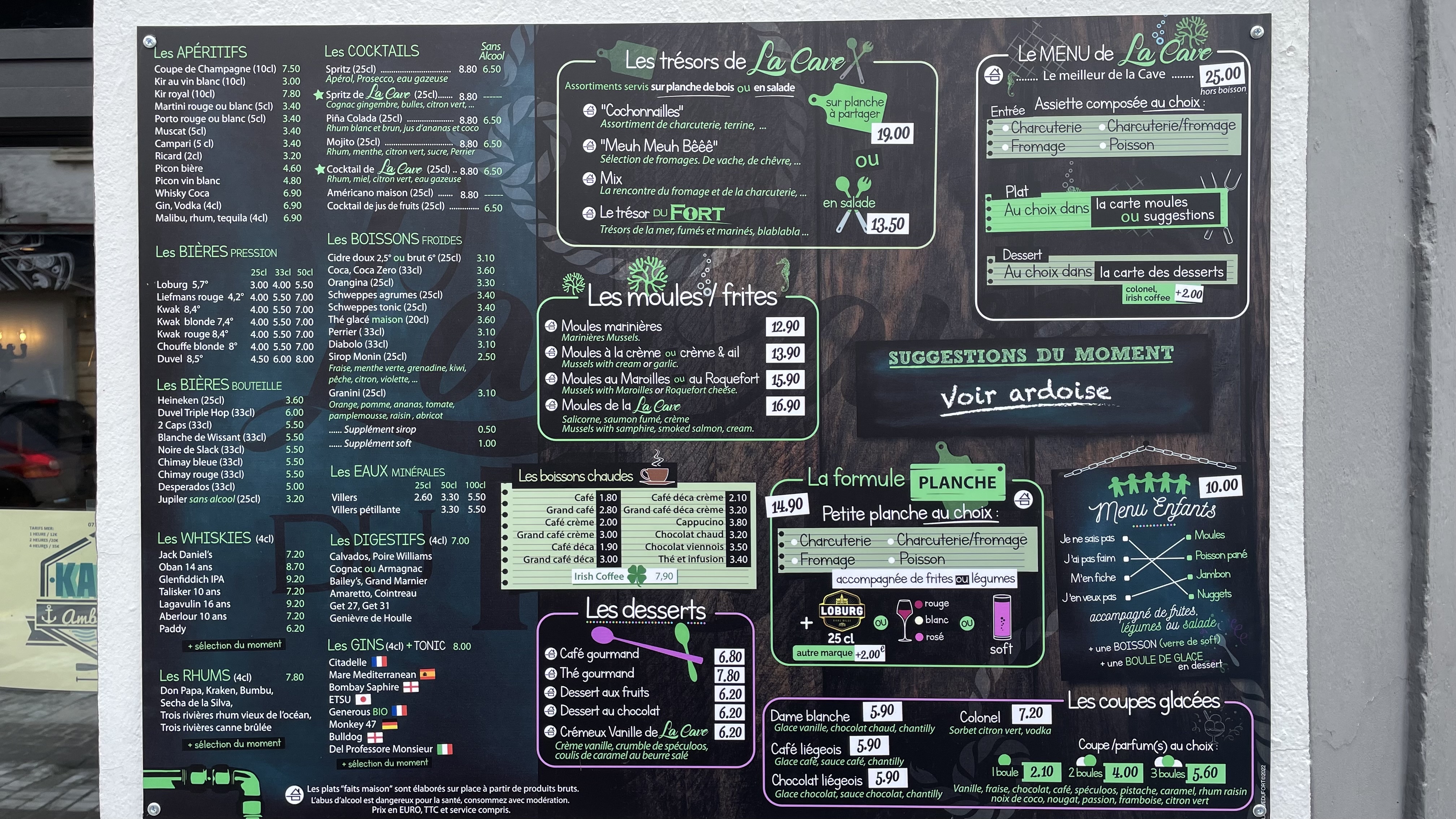Spécialités de planches (charcuteries et/ou fromages) et de moules pour vous régaler. Propositions du jour à l'ardoise. Personnel au petit soins pour vous faire passer un bon moment