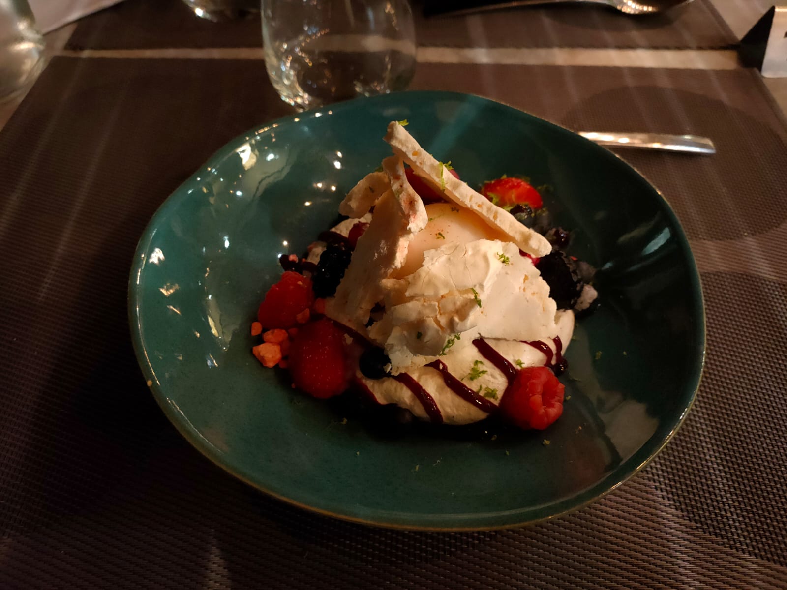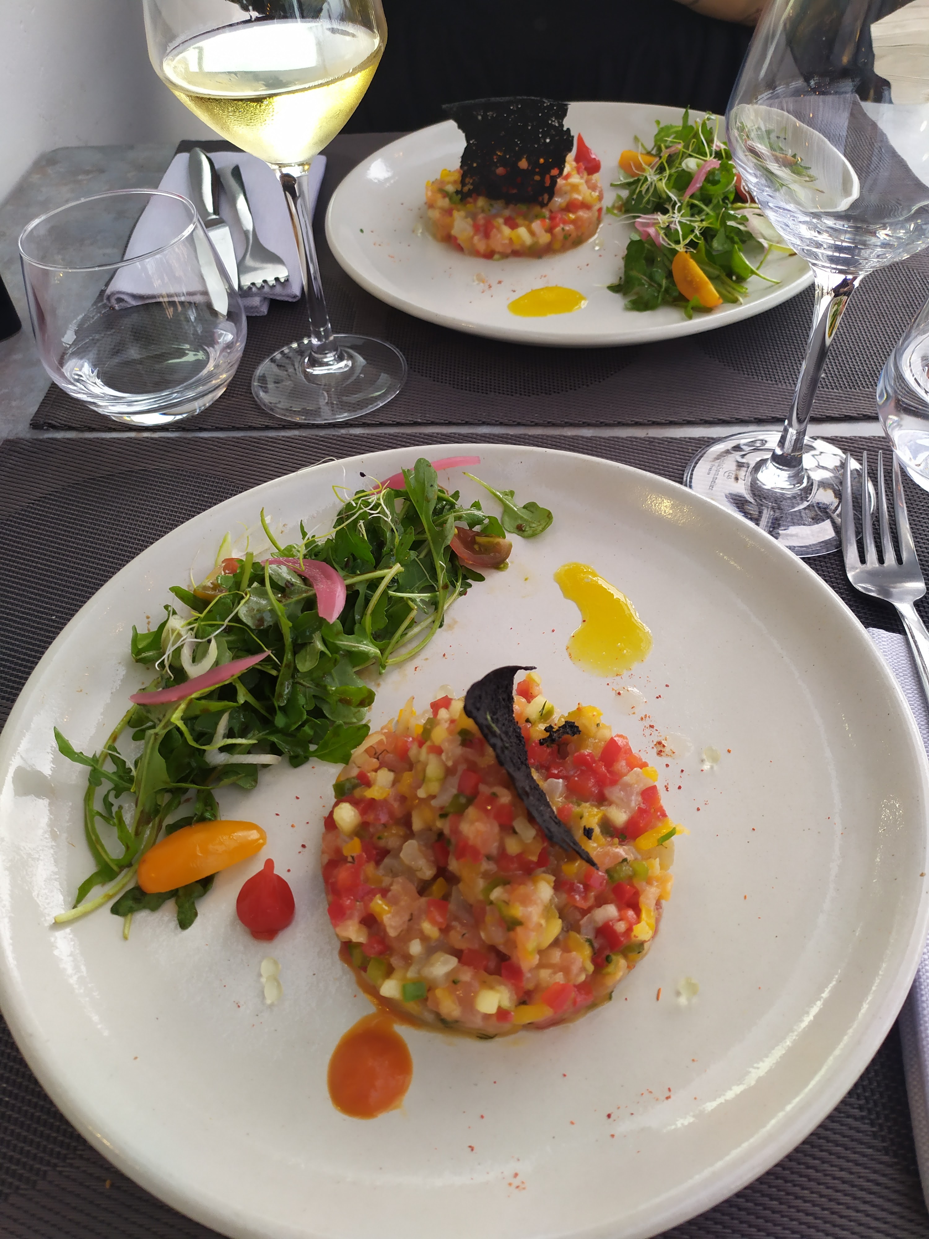 Parfait Lieu charmant avec sa cave voutée. Repas gastronomique succulent en qualité et en saveur (carpaccio d espadon, tataki de thon et son caviar d aubergine) la pavlova au citron vert, litchis et fraises, glace pistache était subime.