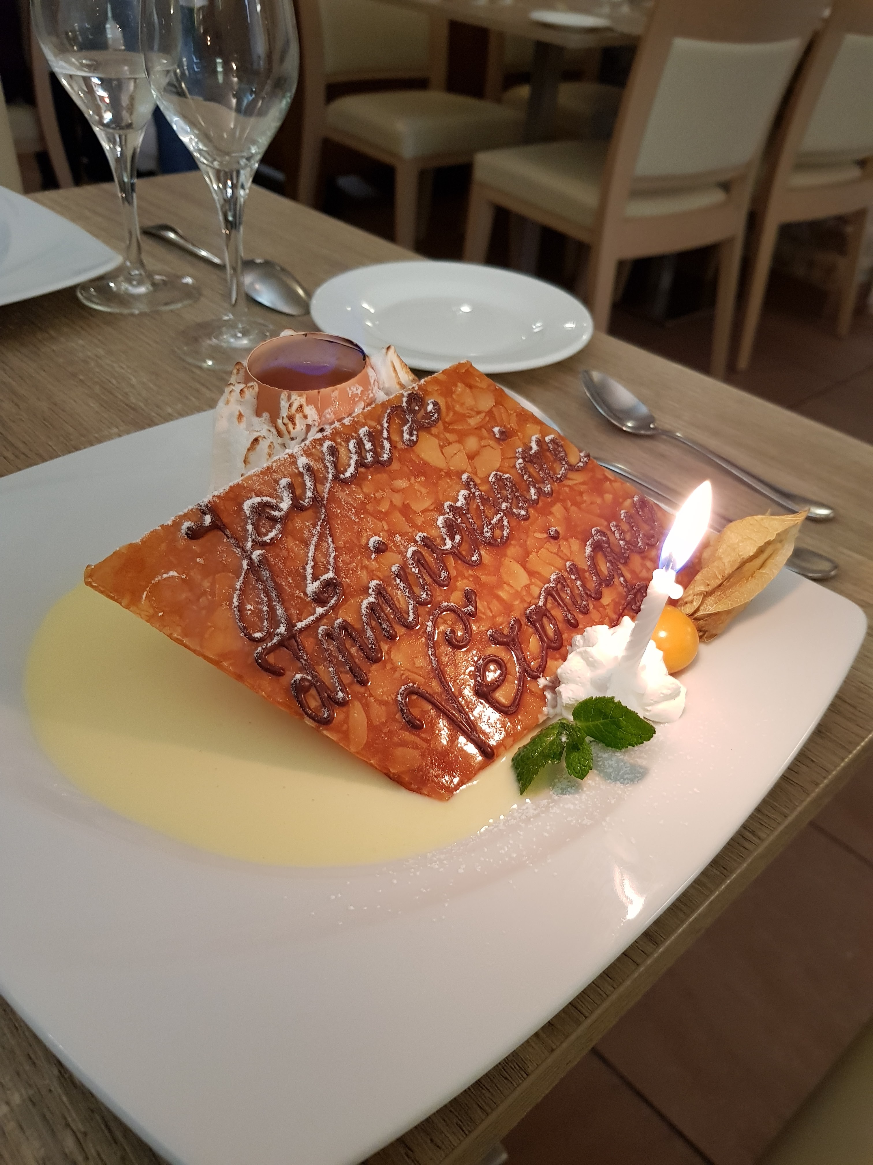 Très bon menu de l'entrée au dessert , et nous avons appréciés le petit geste de chef les deux coupes plus un dessert bien préparé pour cette occasion une jolie surprise pourtant nous ne sommes que des touristes mais en lisant les avis + les gens des alentours nous n.avons aucun doute 5 étoiles +++++ MERCI