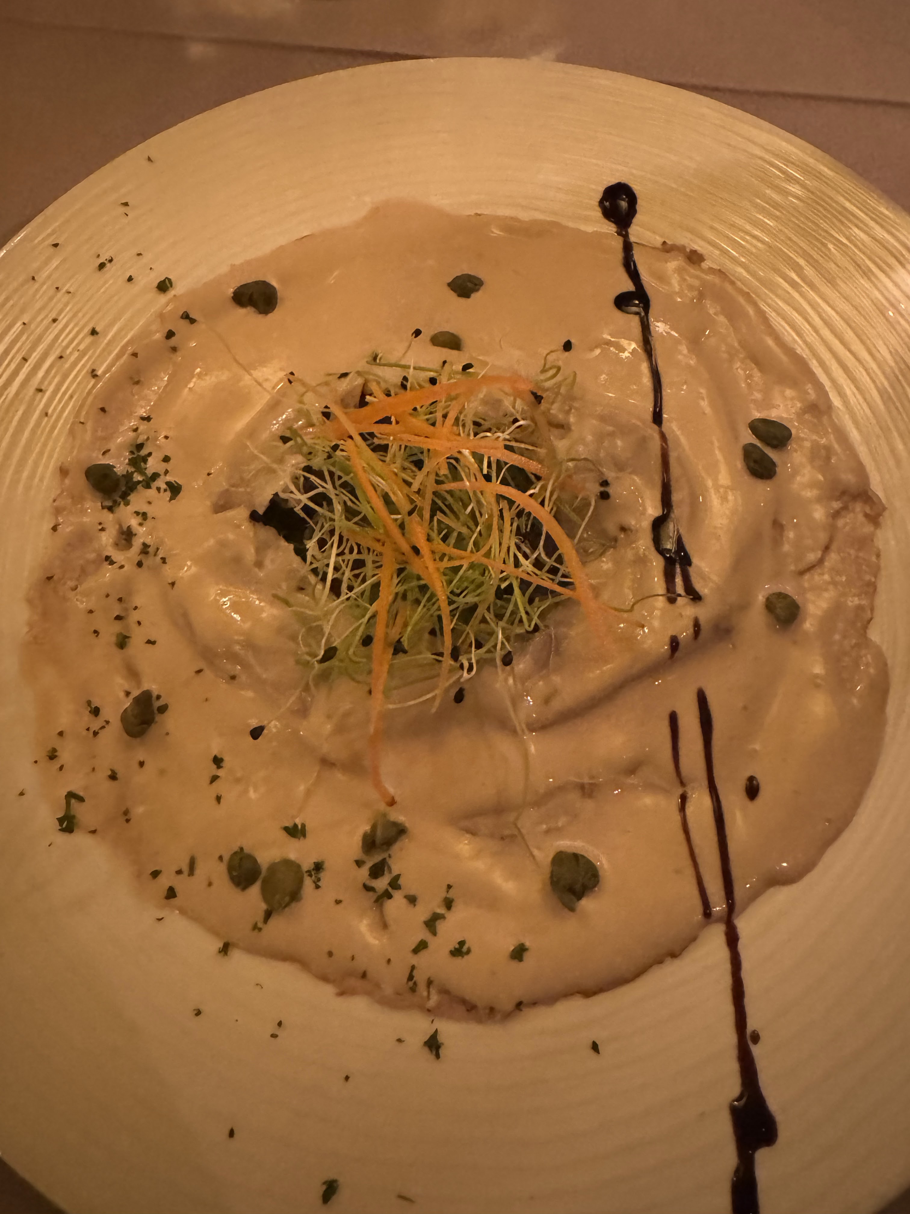 Nous avions réservé une table pour un groupe de 5 personnes, mais 3 personnes étaient tombées malades, à notre arrivée, le propriétaire a décidé de nous « punir » en nous asseyant à côté des toilettes, apparemment agité du fait qu'il ne pourrait pas extorquer nous aussi efficacement, lorsque nous avons demandé à être déplacés, il a répondu en un seul mot «Non» et est parti. Alors que toutes les autres tables avaient une bougie, la nôtre a été supprimée par pur dépit. Cela étant dit, tout le personnel, à l'exception du directeur, était poli et efficace et la nourriture était excellente.