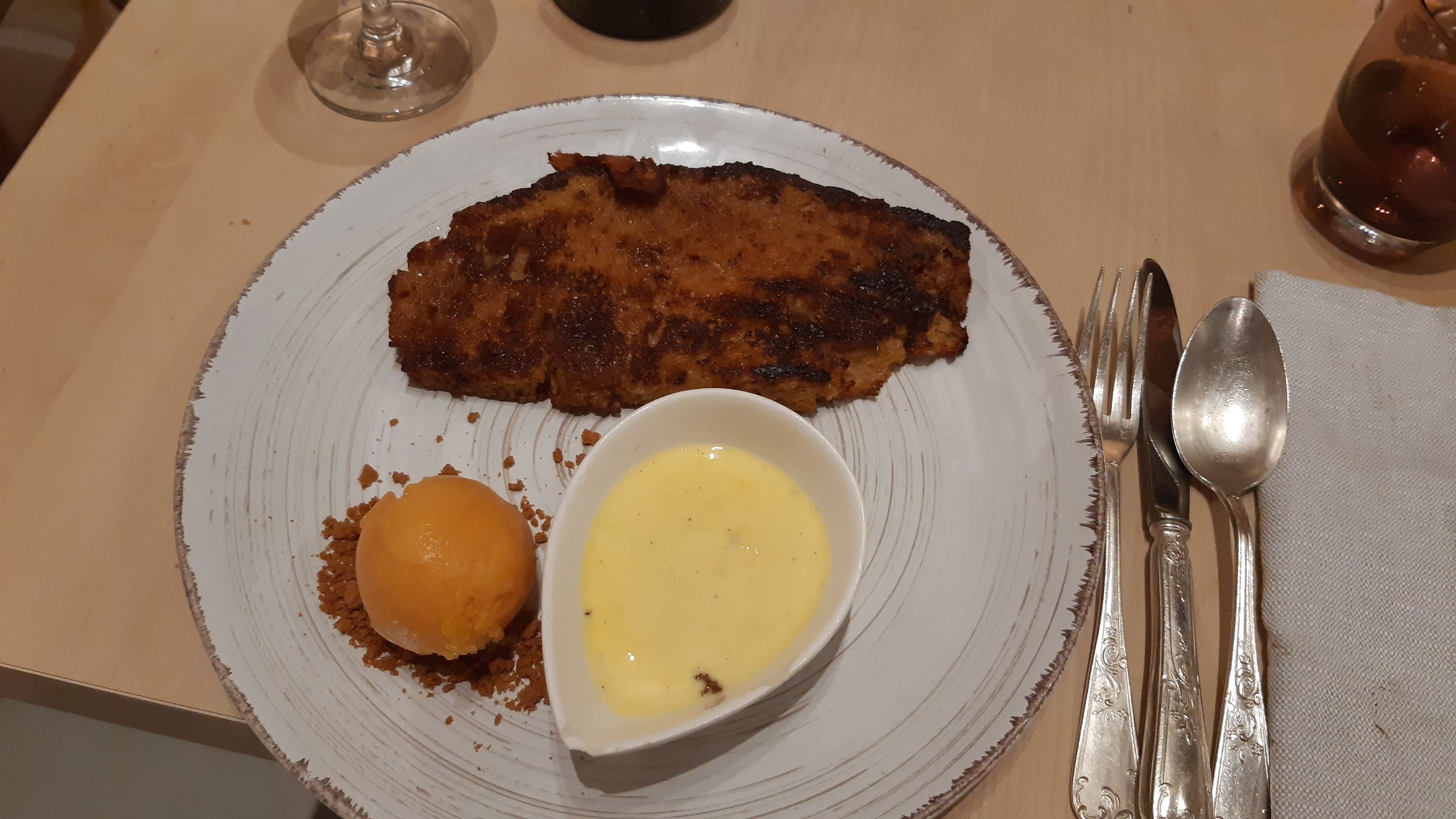 Cela commençai bien avec un accueil cordial et un apero pour mon fils jus de pomme bio bouteille verre. Menu du jour entrecôte cuit à la cheminé frite maison et omelette norvégienne. Pour le dessert je vous le dis à oublié très vite ; très dure non flambé bref produit industriel ! Dommage