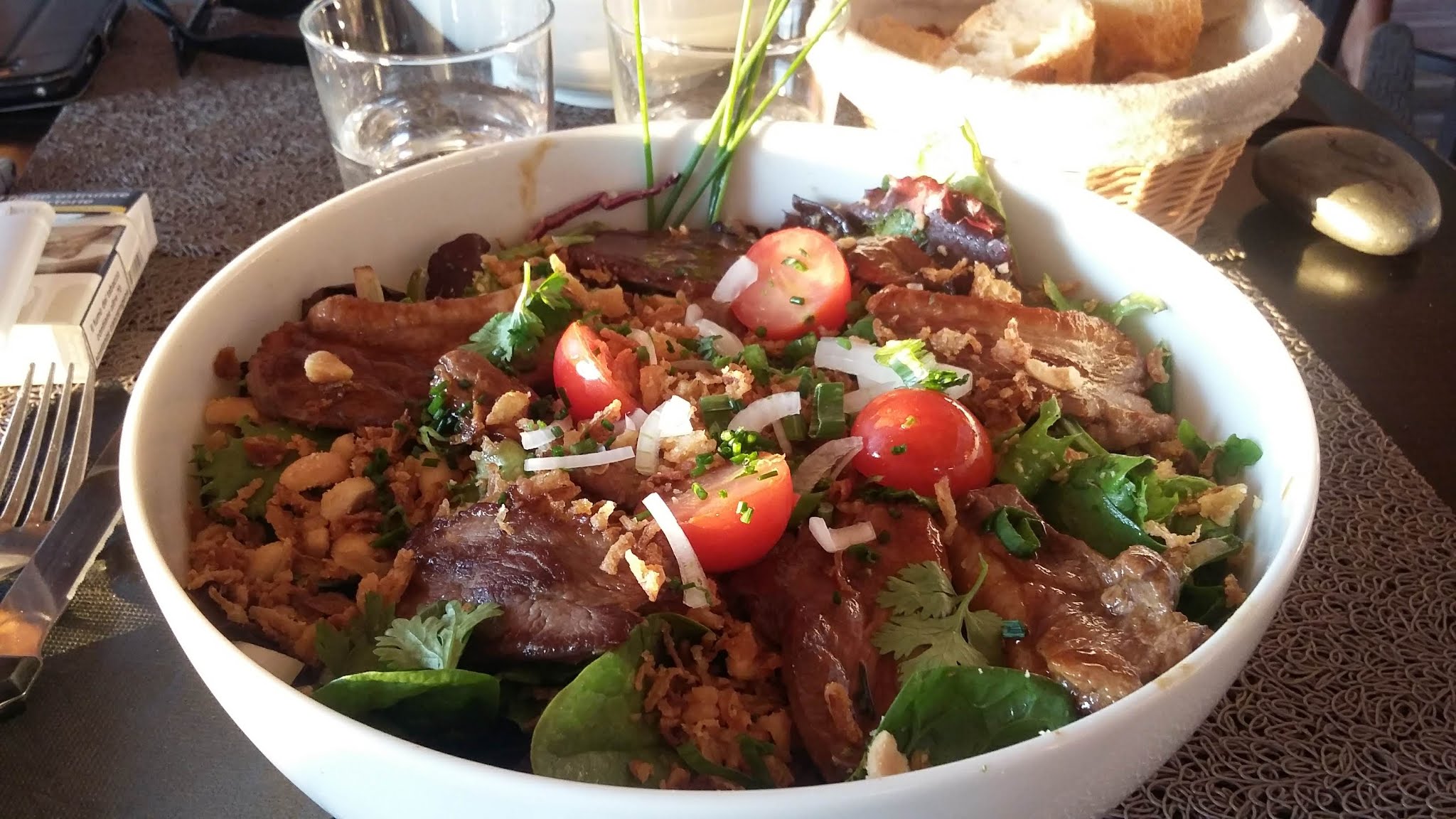 Super ambiance et déco en bord de « plage » ! J’ai aimé la sangria maison et sa copieuse salade de St-Jacques.