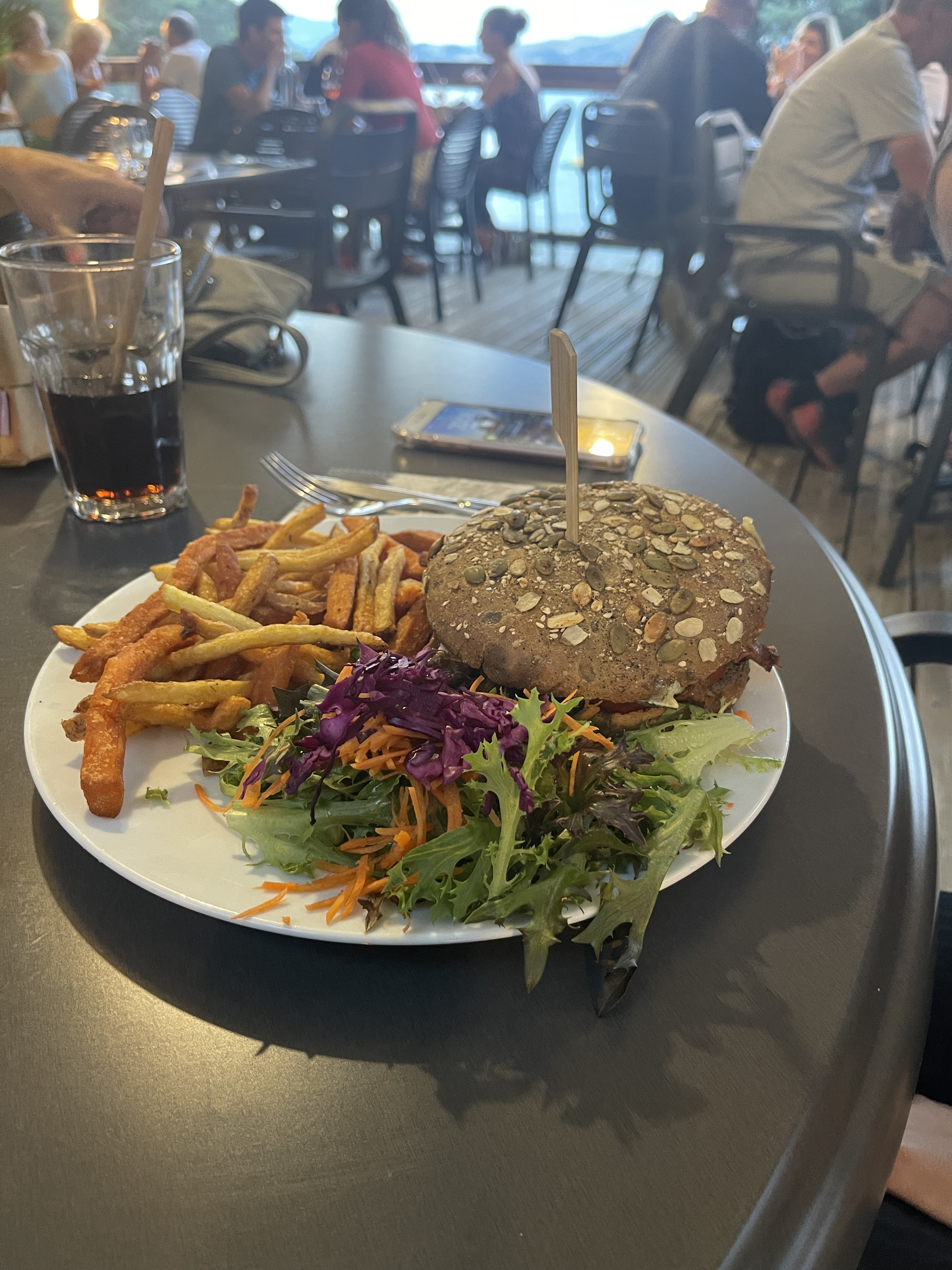 Très bel endroit pour passer un joli moment. Les serveurs sont très aimables. Souriants et très énergiques. La cuisine y est excellente. Les burgers végétariens sont exquis. Le repas était parfait de l'entrée au dessert. Merci à toute l'équipe pour cet agréable moment.Le restaurant est très bien situé peut être faut il réserver surtout en haute saison. Nous avons adoré je recommande vivement.
