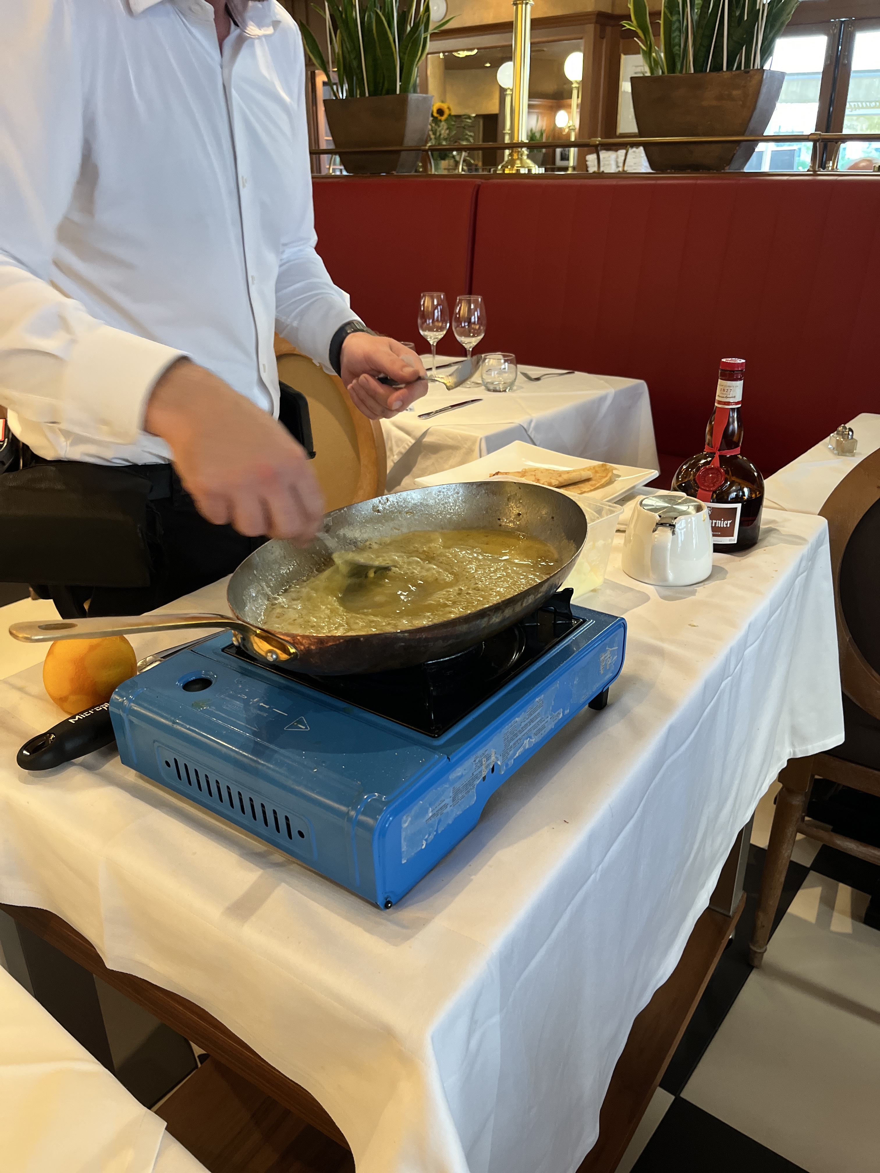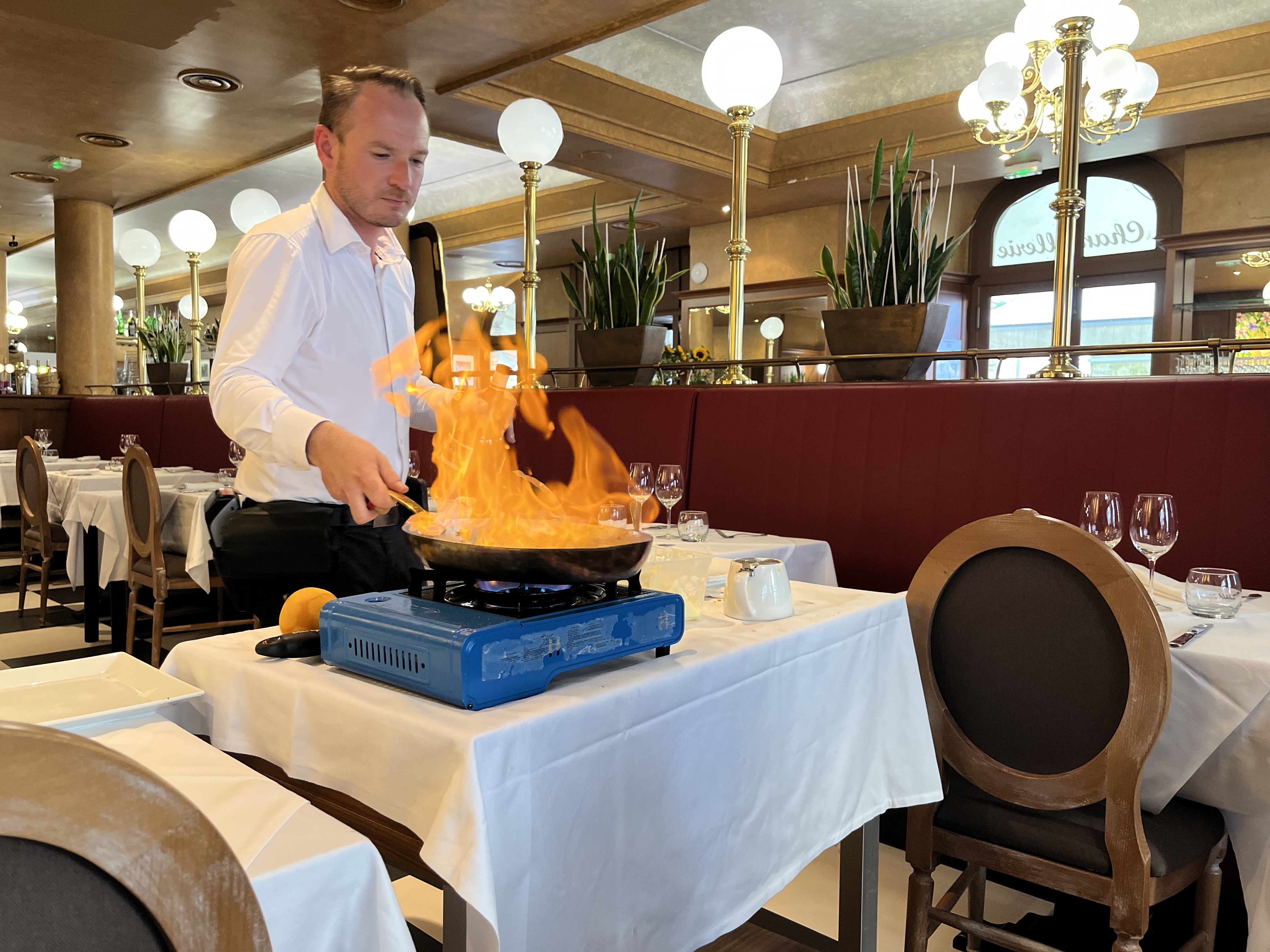 Agréable moment autour d’un filet de sandre aux petits légumes et d’une crêpe Suzette réalisée devant nous par une étudiante saisonnière, bravo . Par contre déjeuner derrière le bar c’est limite . Impression d’être relégué en réserve . Un petit coup d’éclat de l’ensemble serait le bienvenue. Café pris en terrasse sous un soleil Magnifique 😉